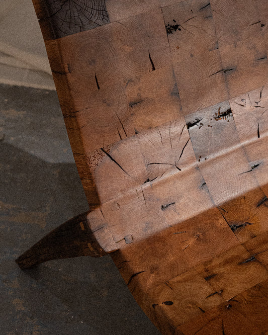 APRÈS CETTE RICHE EXPÉRIENCE, TIMOTHÉE TRAVAILLE DANS UN BUREAU D'ÉTUDES PENDANT QUELQUES ANNÉES AVANT DE REVENIR À SA PASSION POUR LE BOIS ET DE CRÉER L'ATELIER MUSSET POUR PARTAGER SON SAVOIR-FAIRE. IL SE CONCENTRE PRINCIPALEMENT SUR LA VALORISATION DE CETTE MATIÈRE SOUVENT NÉGLIGÉE, EN SUBLIMANT LES BOIS ANCIENS TOUT EN METTANT EN VALEUR LEURS DÉFAUTS QUI FONT PARTIE DE LEUR BEAUTÉ INTRINSÈQUE. POUR LUI, LA RÉCUPÉRATION DE CES BOIS CHARGÉS D'HISTOIRE EST ESSENTIELLE, CAR ILS ONT TRAVERSÉ LES SIÈCLES ET ONT ENCORE BEAUCOUP À RACONTER. TRANSFORMANT LA MATIÈRE BRUTE ET MASSIVE EN UNE DIMENSION PLUS POÉTIQUE,