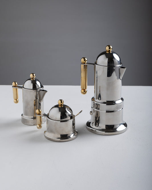 STAINLESS STEEL AND BRASS COFFEE SERVICE, 1980s