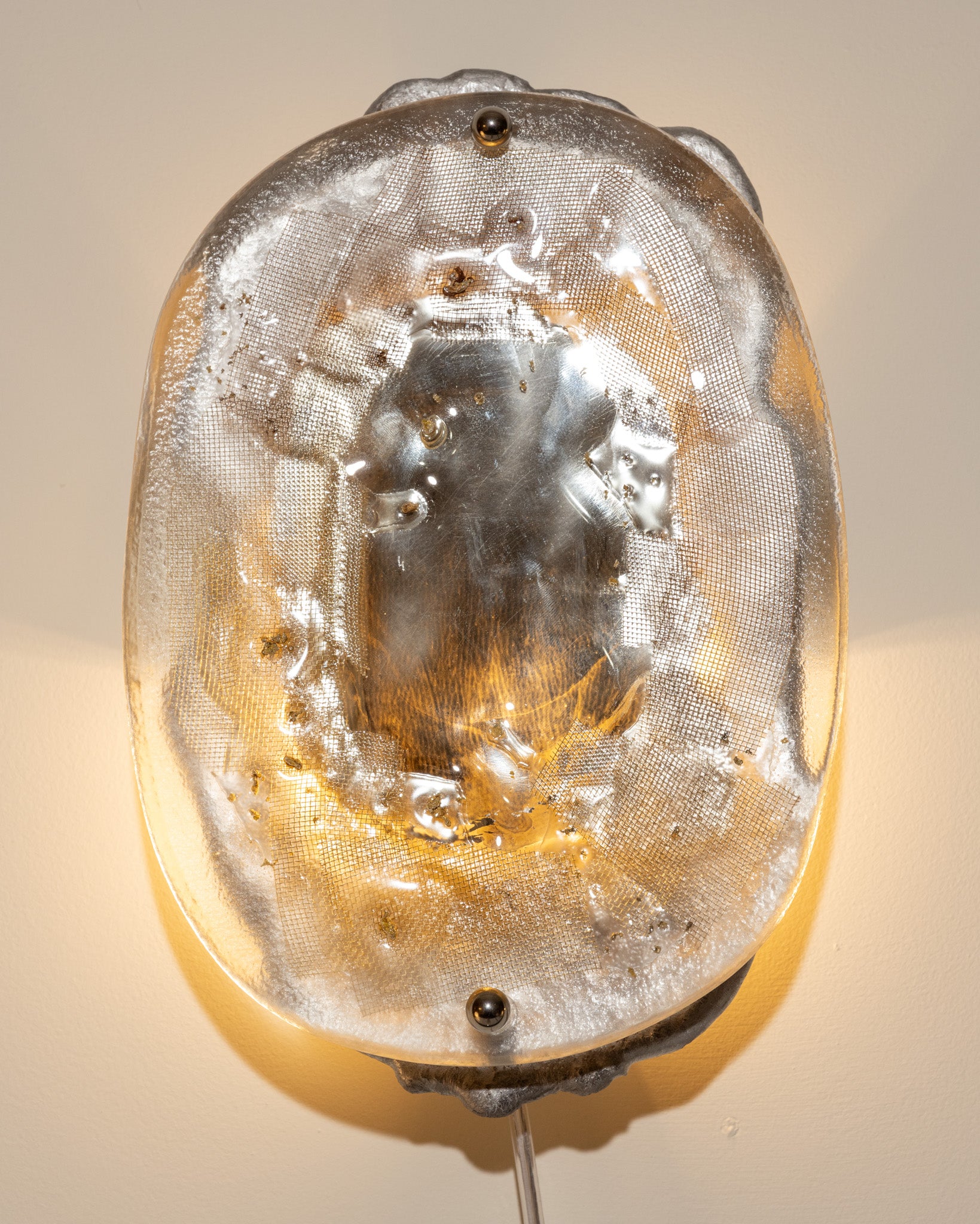 Glass, brass, and aluminum wall sconce (No. 10). Its brass structure houses a textured glass plate, handcrafted with inclusions, bubbles, and an aluminum mesh integrated into the material. A mirror is also integrated to allow light to pass through the glass. This wall sconce by Wei Xiaoyan Studio is halfway between a work of art and a functional light fixture.
