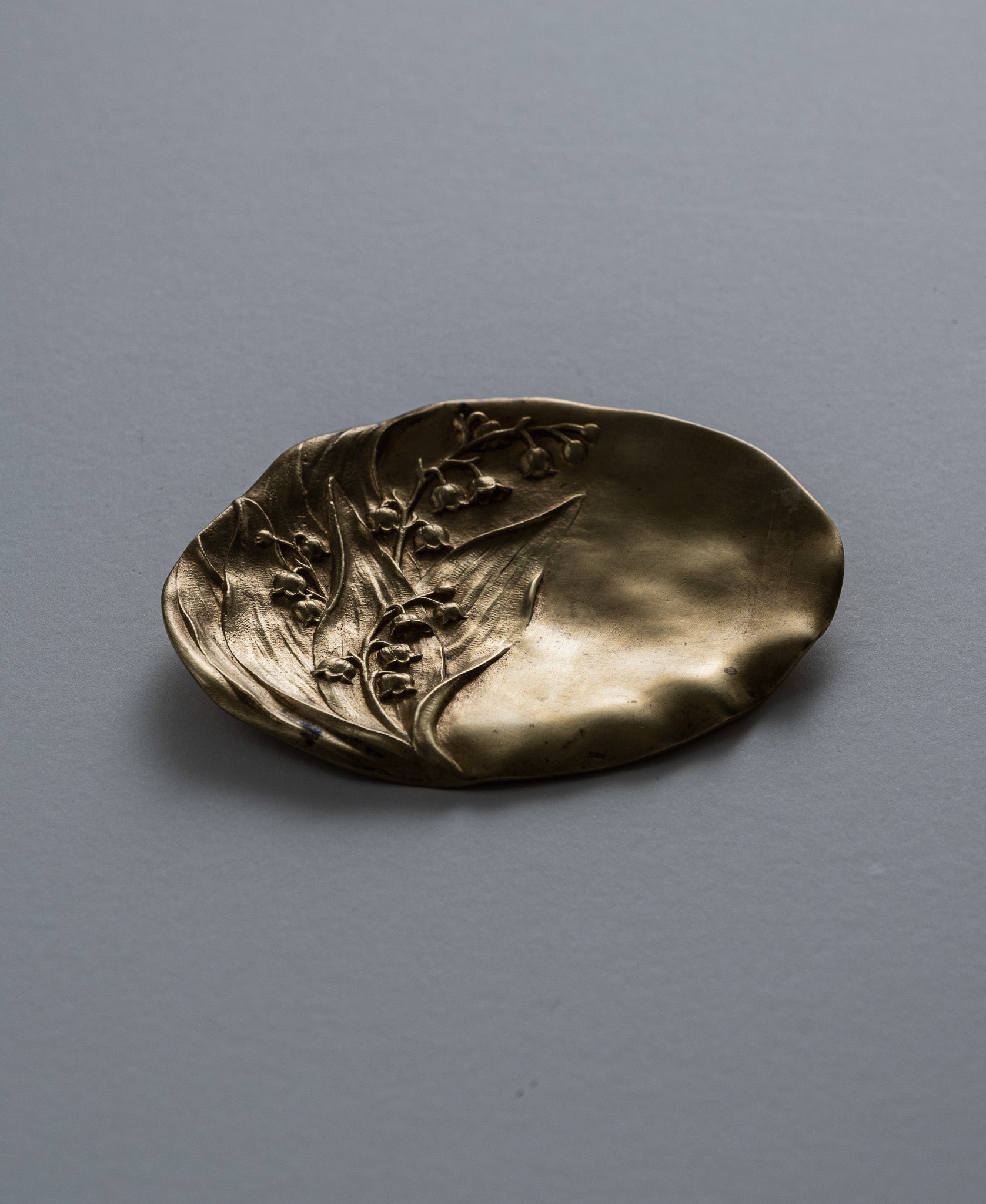Gilded bronze trinket dish, decorated with relief lilies of the valley. Art Nouveau style.Very good condition, patina consistent with age.