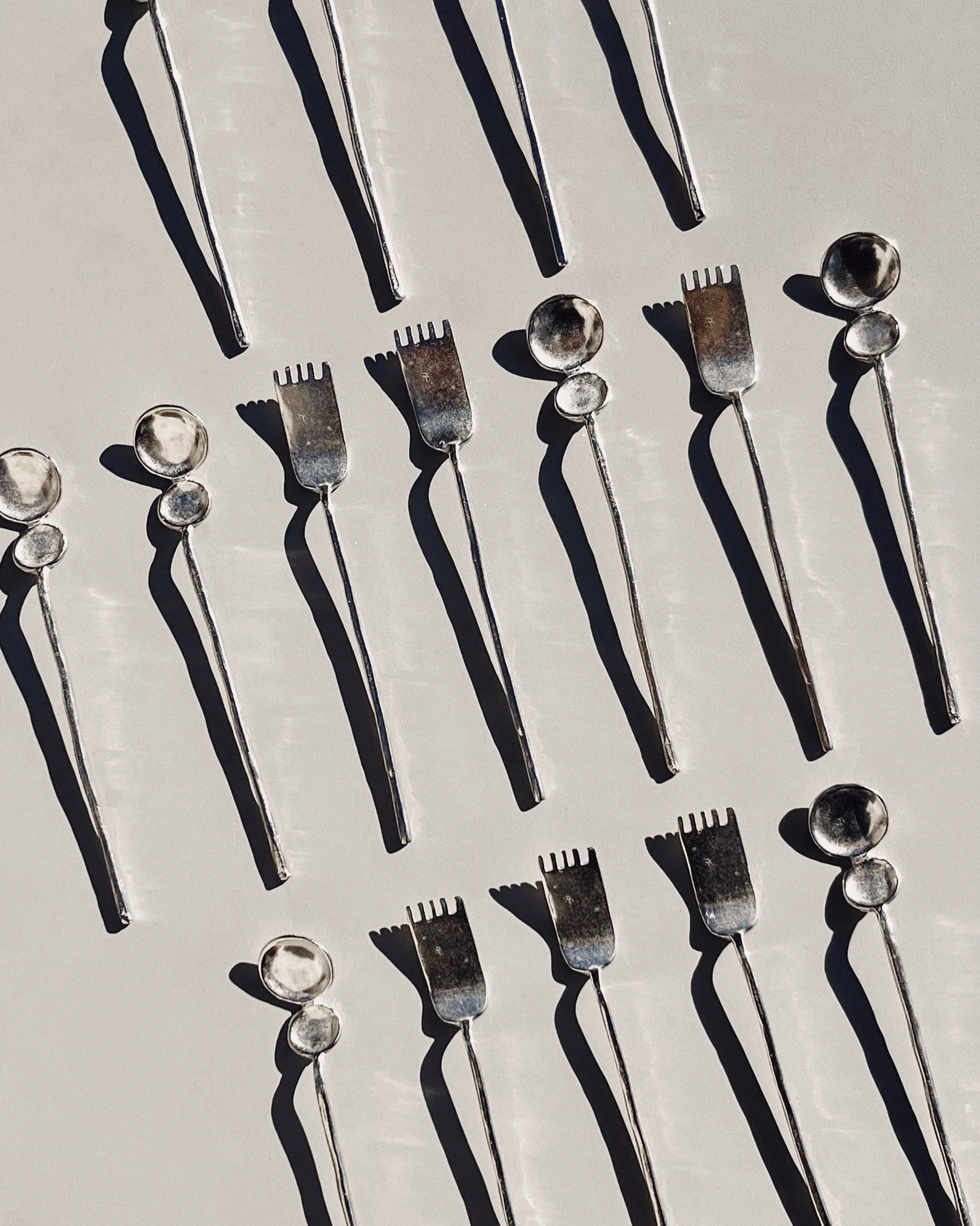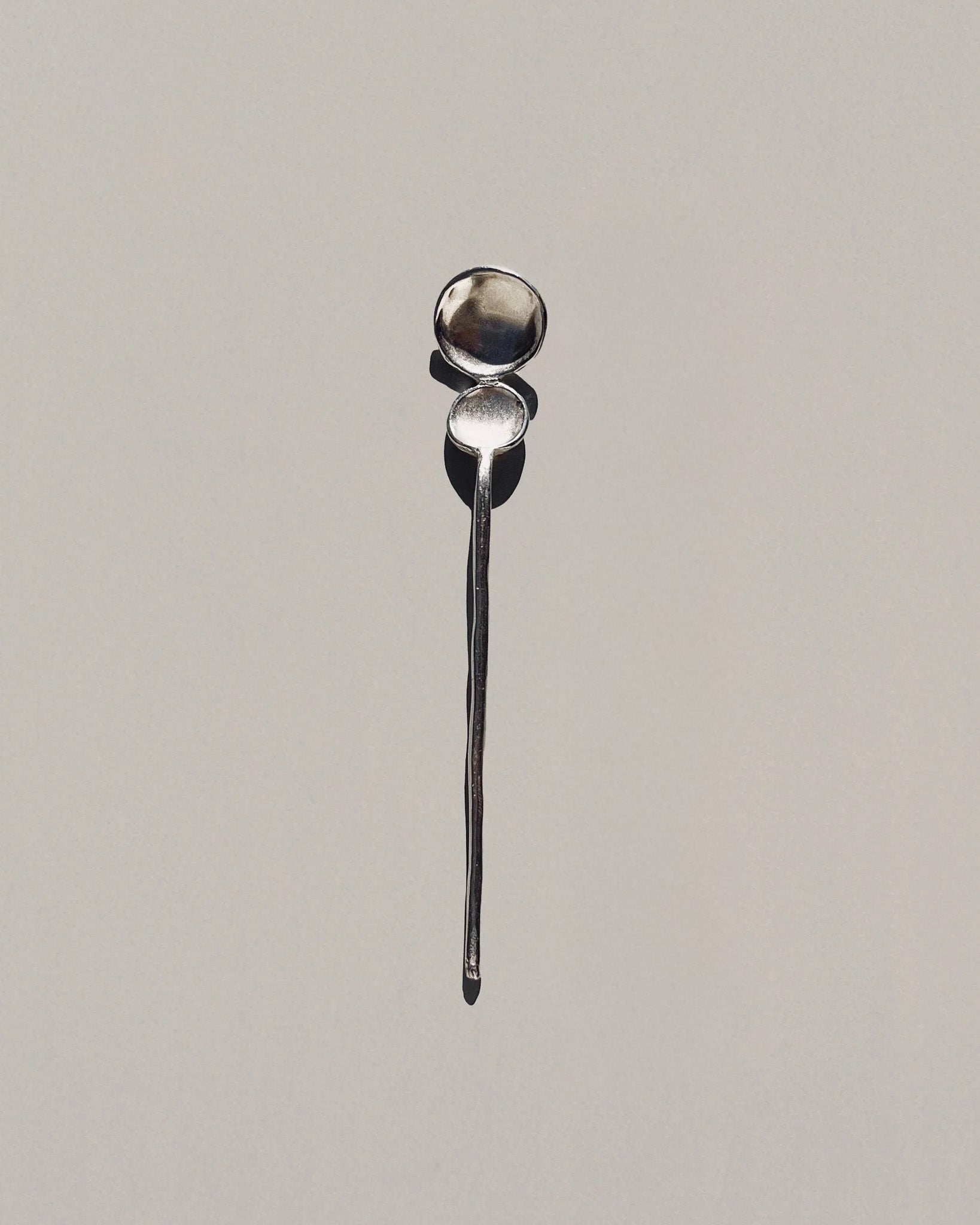 "Artifact" tea spoon in sterling silver satin finish, by Alexandra Denat. Handmade in France.