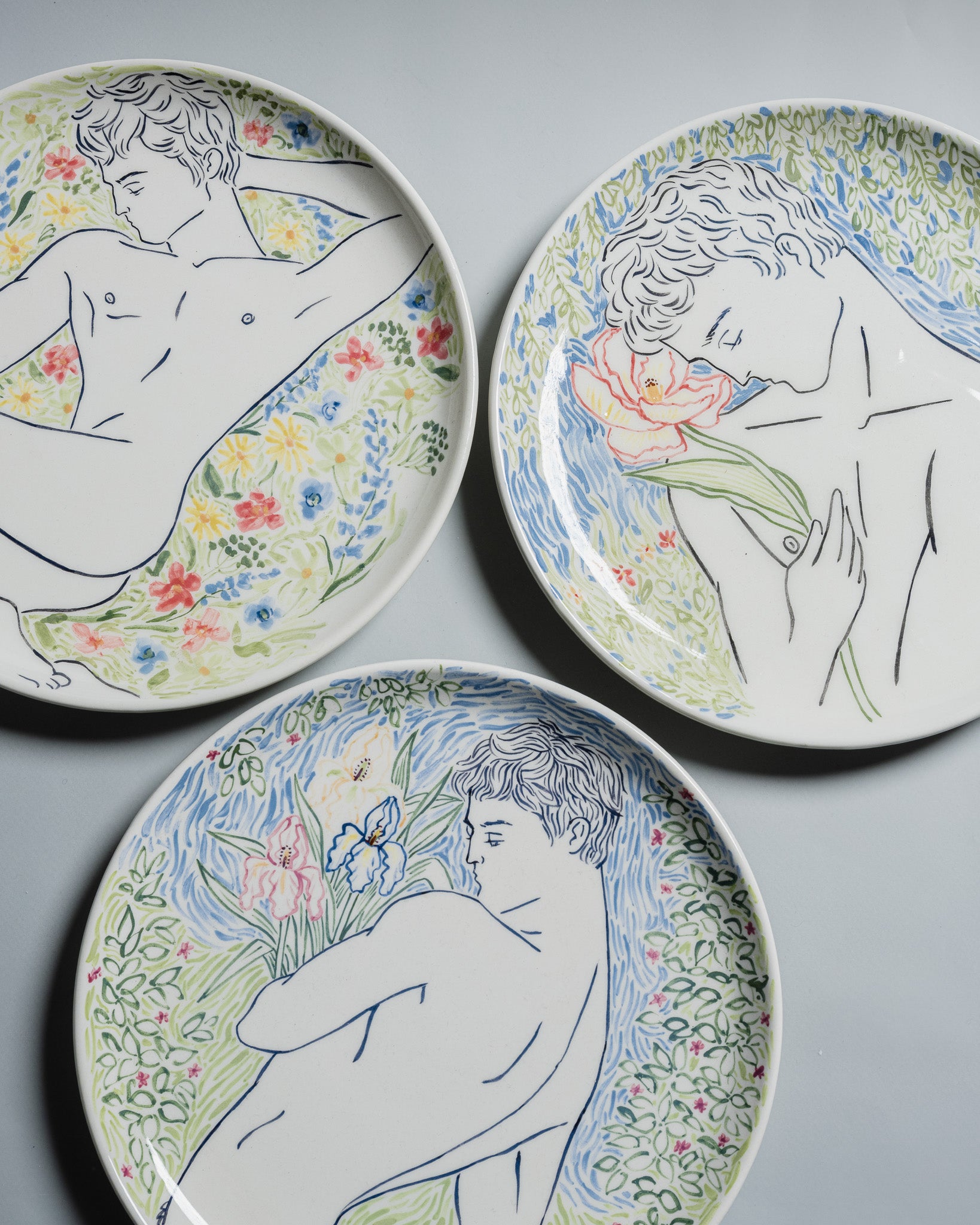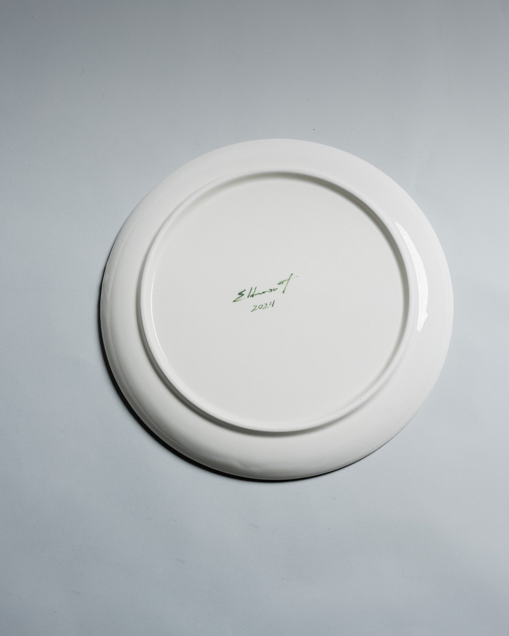 White glazed ceramic plate, decorated with a man seen from behind carrying a bouquet of flowers. Signed 'Eldarov. T 2024' on the reverse.