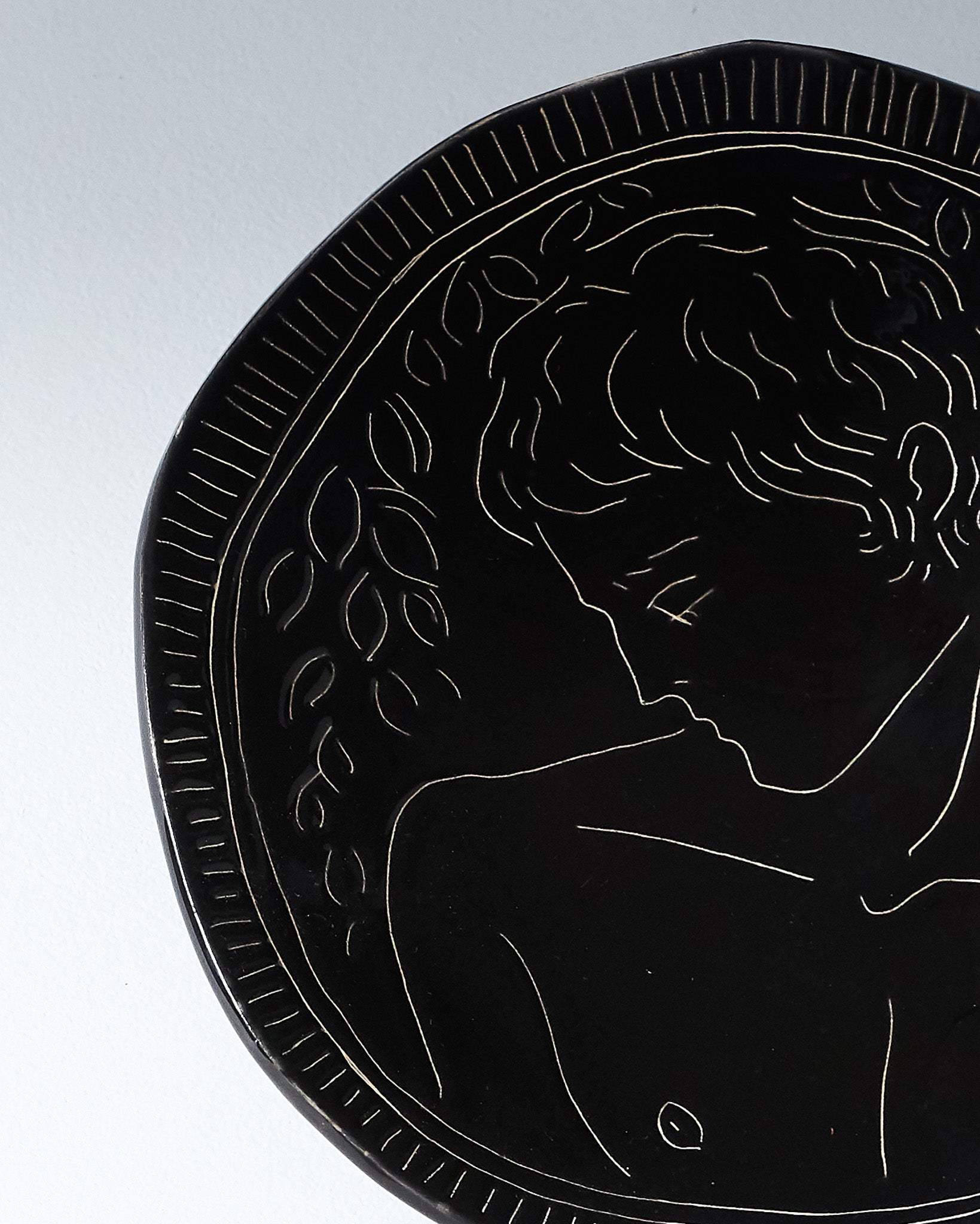 Black glazed ceramic plate with an incised decoration depicting a male profile against a background of leaves, stylized white decoration, with a striated rim. Unique handcrafted piece, signed 'Eldarov. T' on the reverse.