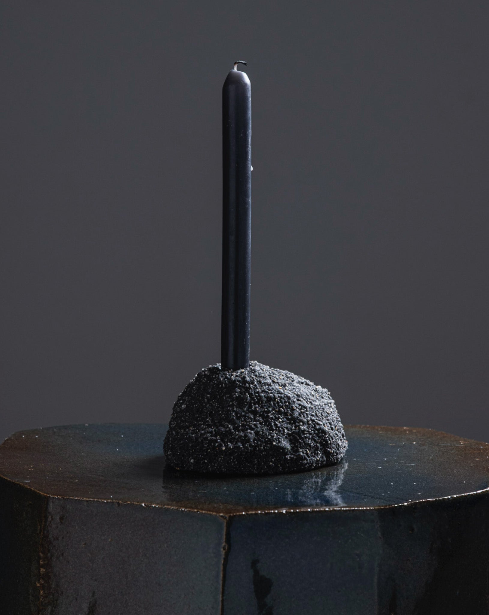 Bougeoir Aetna taille M par Paul Hardy. Les bougeoirs Aetna mêlent sable noir et cendres, sculptés comme des roches volcaniques érodées par le temps.