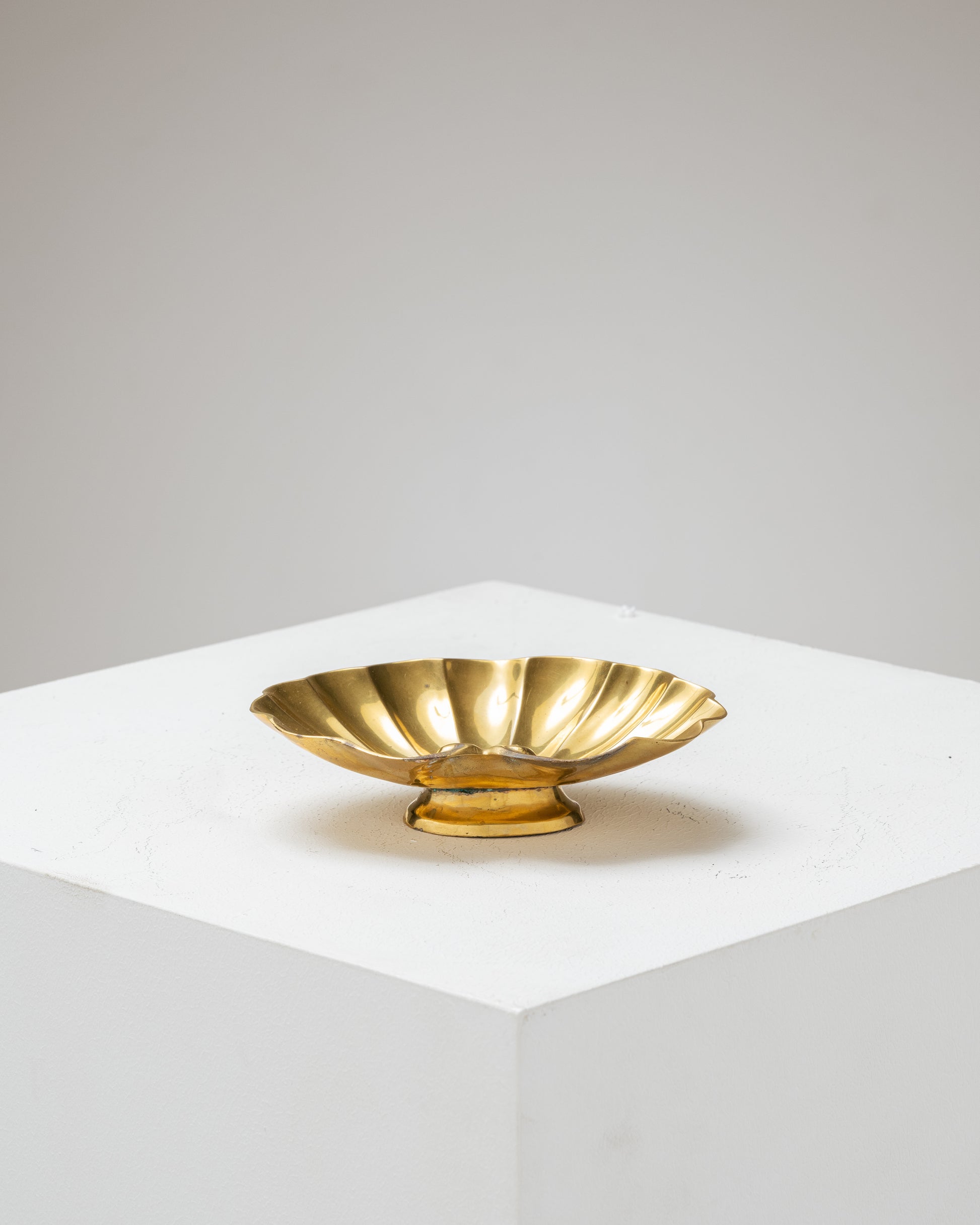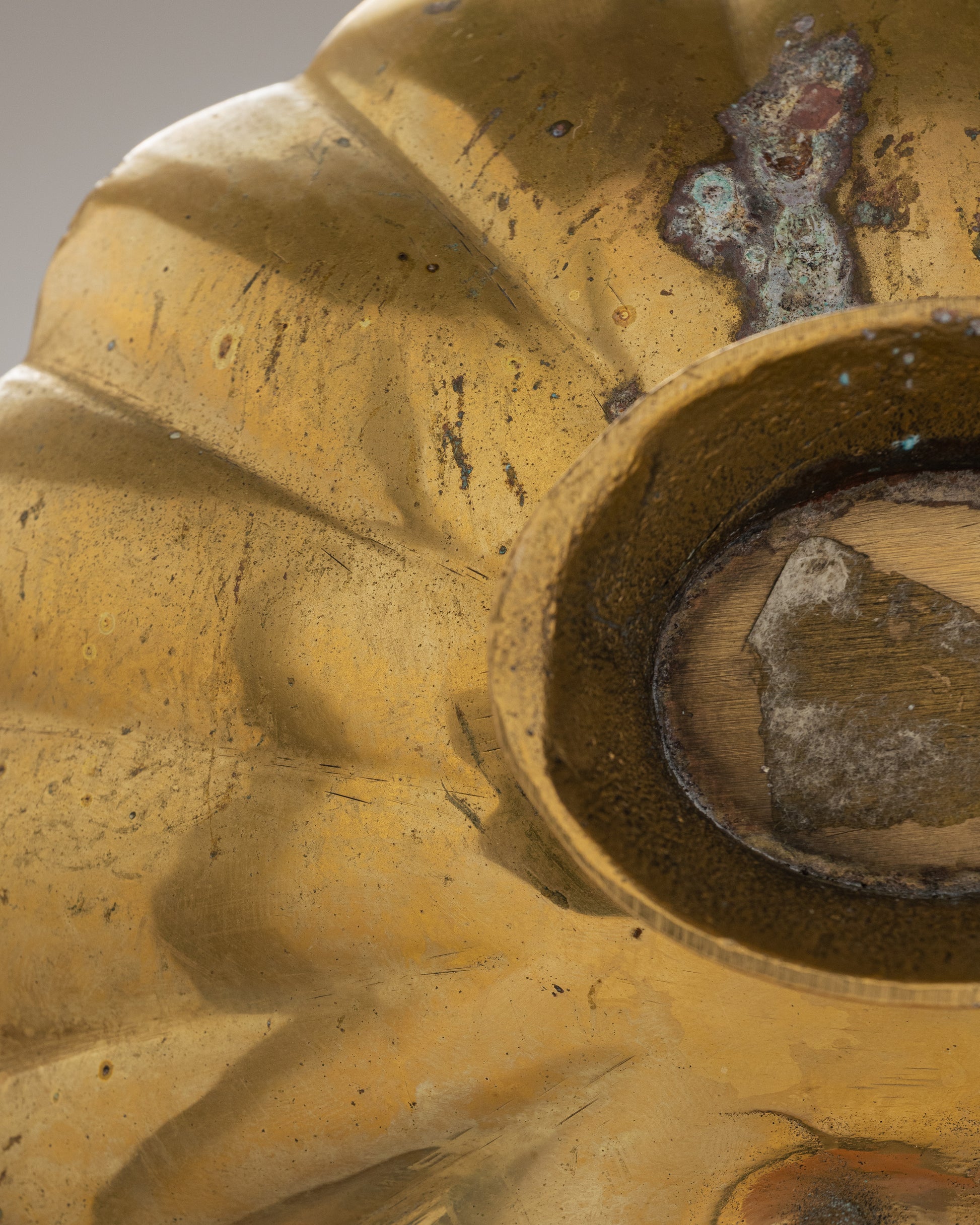 Brass catchall tray shaped like a stylized shell, typical of decorative pieces from the 1950s to 1970s. Inspired by Hollywood Regency and mid-century design. Patina and wear on the back of the shell add character and highlight its vintage charm.