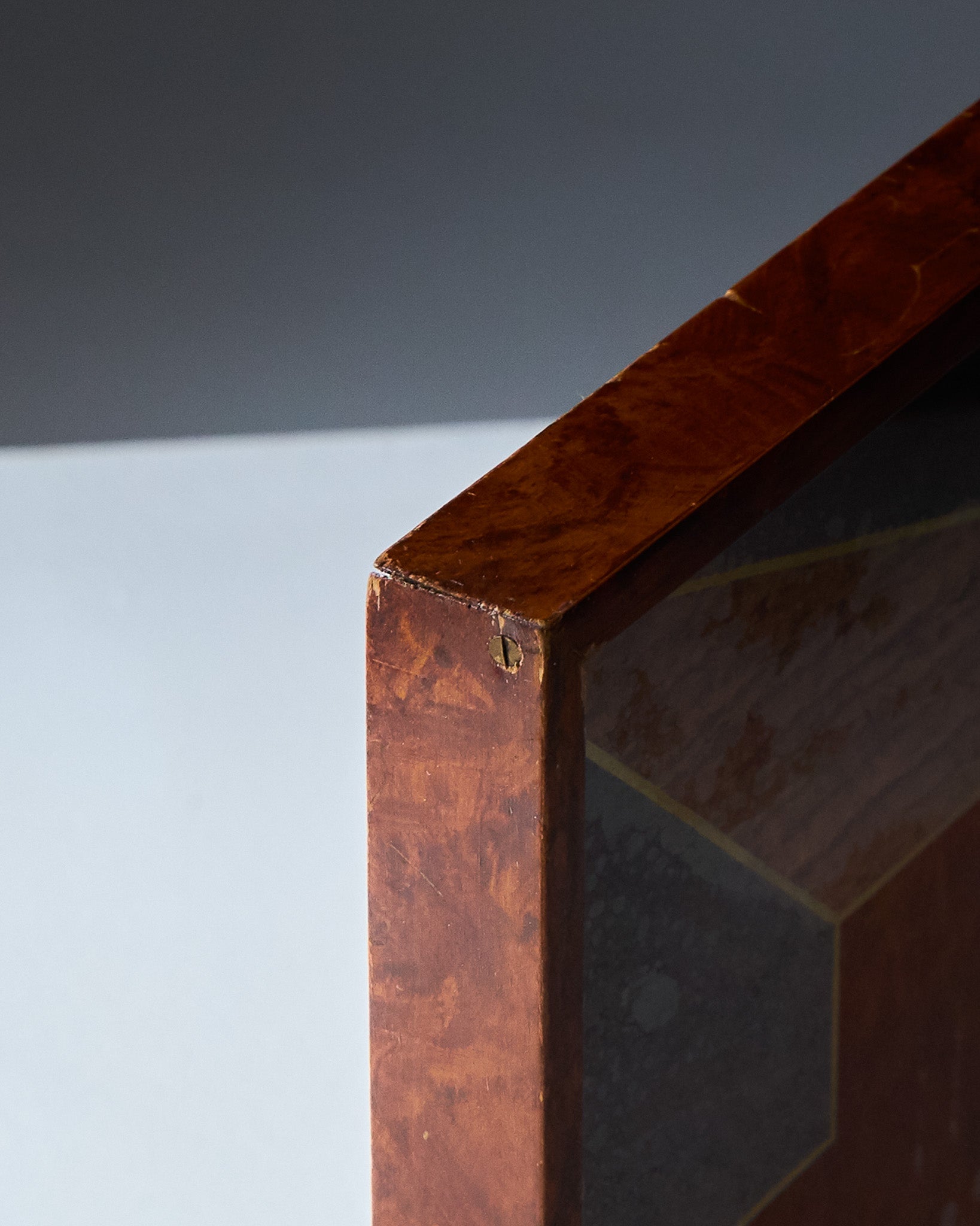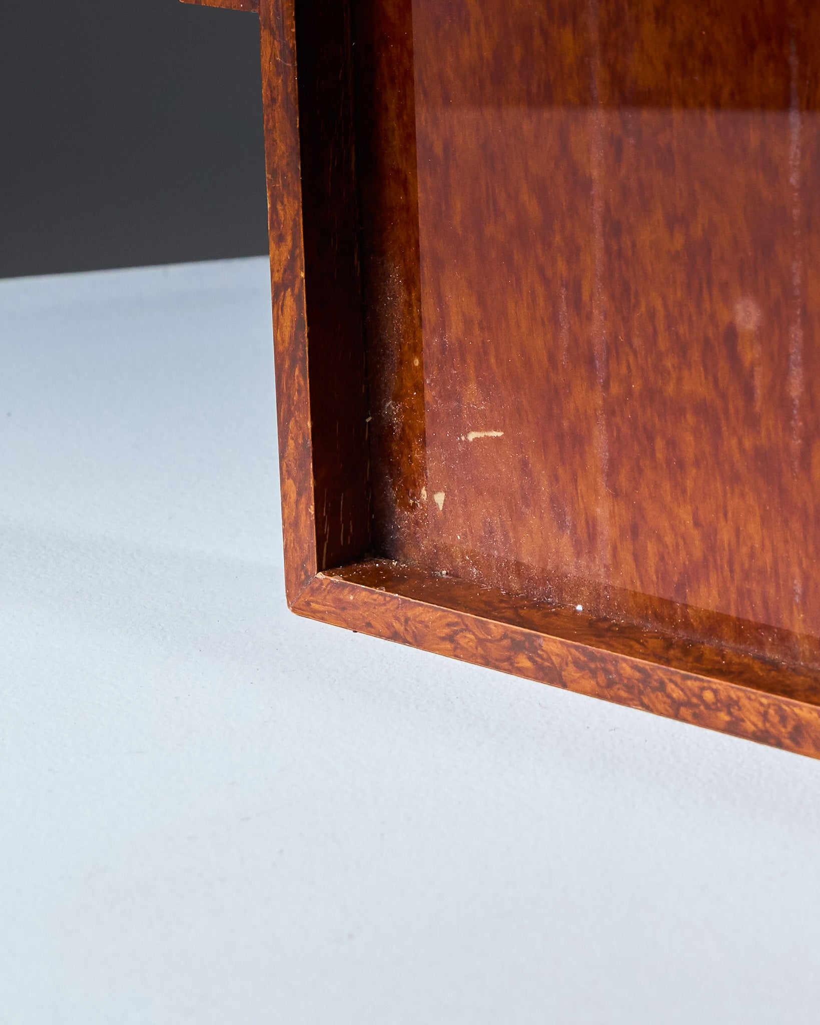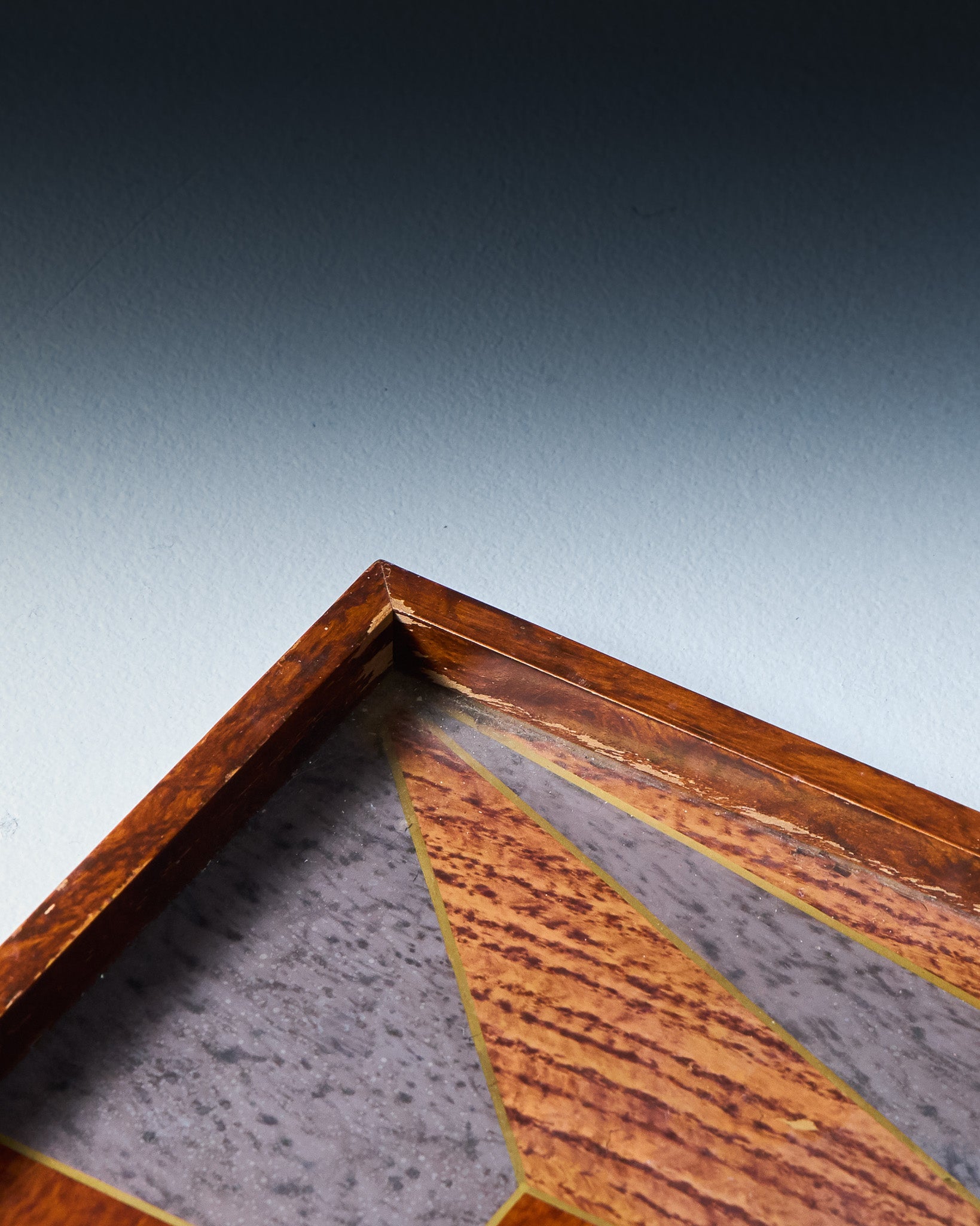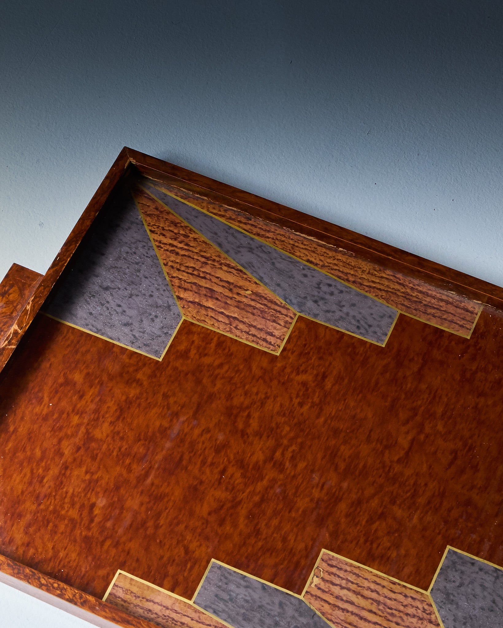 Rectangular burr wood veneer tray with a geometric marquetry design combining several wood tones in shades of gray and light wood, highlighted with gold lines. A typical Art Deco piece from the 1930s, protected by a glass top. Straight edges with integrated side handles.