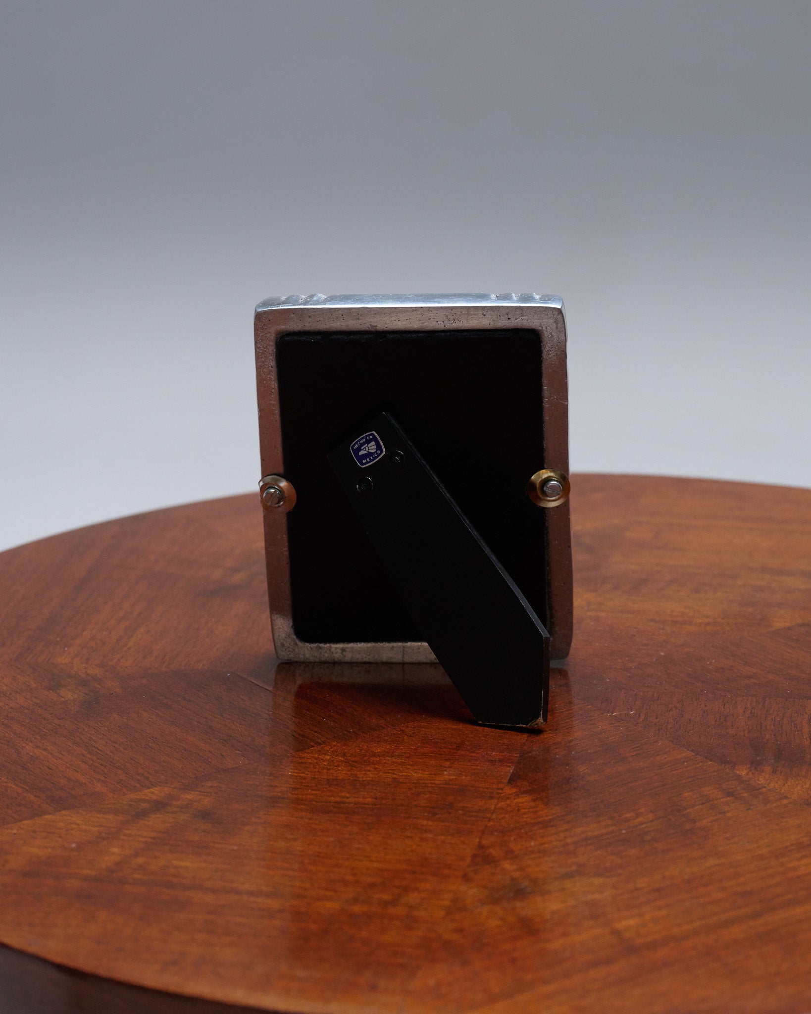 Rectangular silver-plated metal photo frame with embossed corner decoration. The back is designed to be placed on a surface and is stamped 'Hecho en Mexico' (Made in Mexico) , typical of 1960s work. In good overall condition.