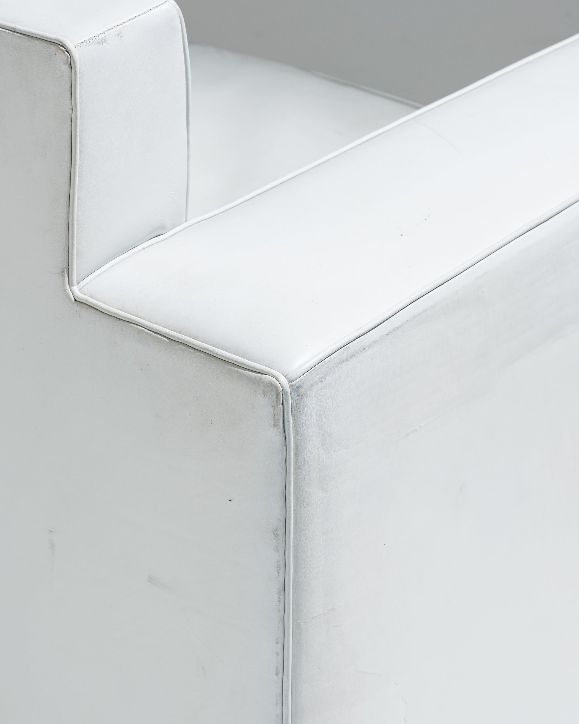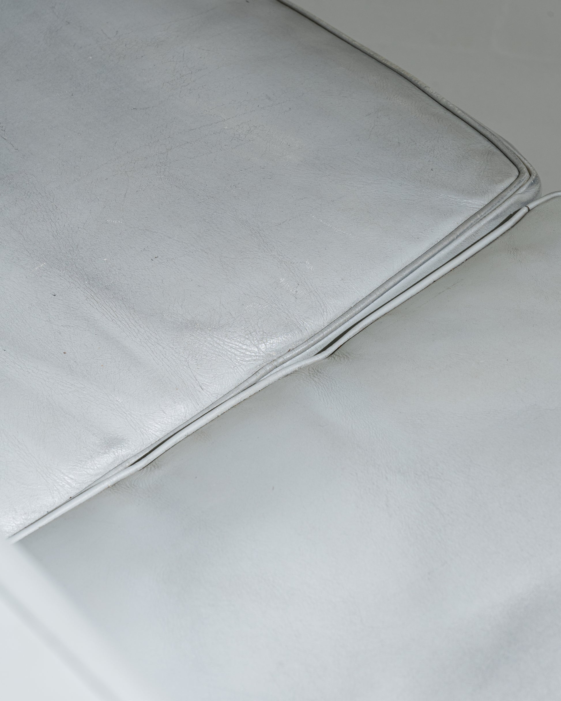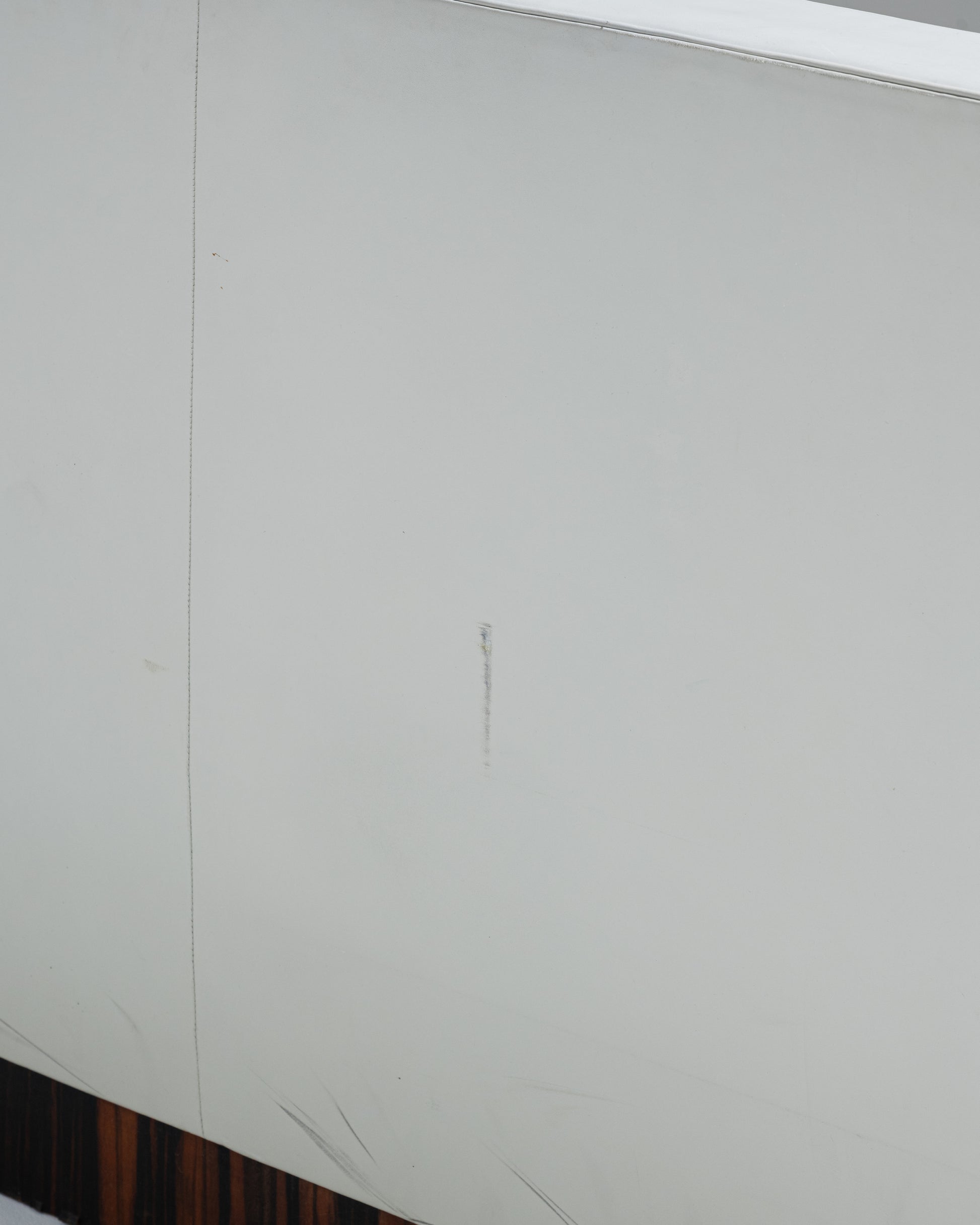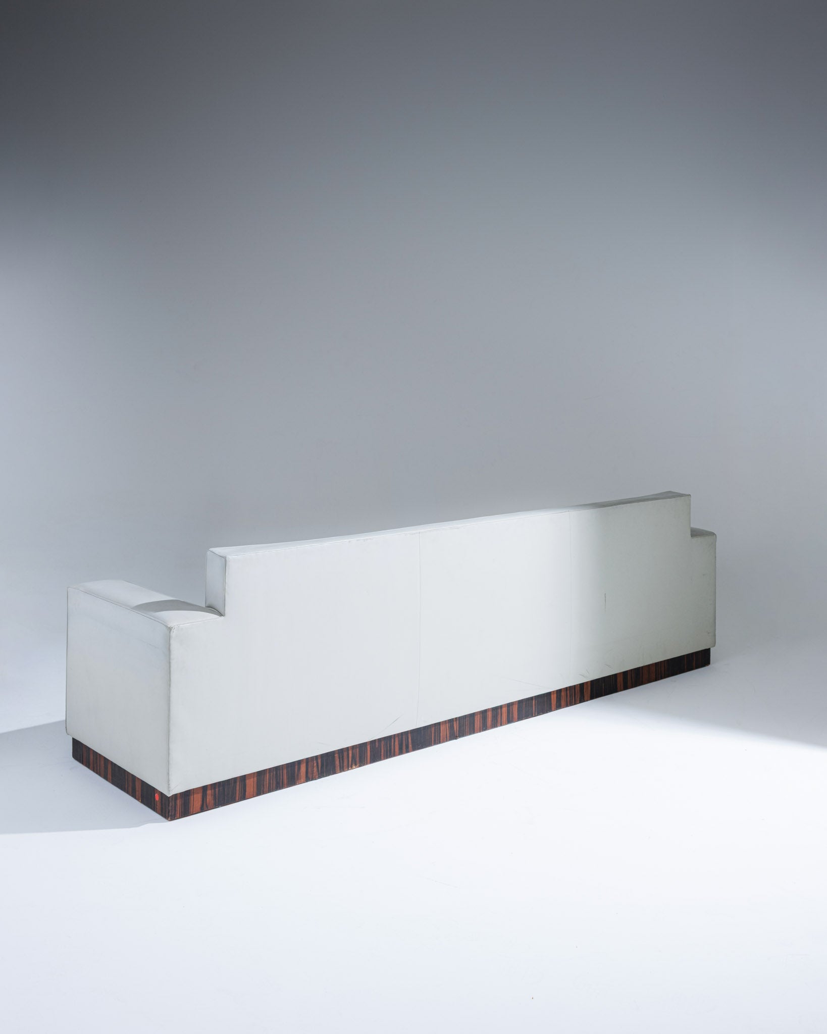 Four-seater sofa by Jacques Adnet (1900-1984), made in the 1930s. Rectilinear design upholstered in light grey leather, resting on an elegant rosewood veneer base. Deep seat composed of removable leather cushions.