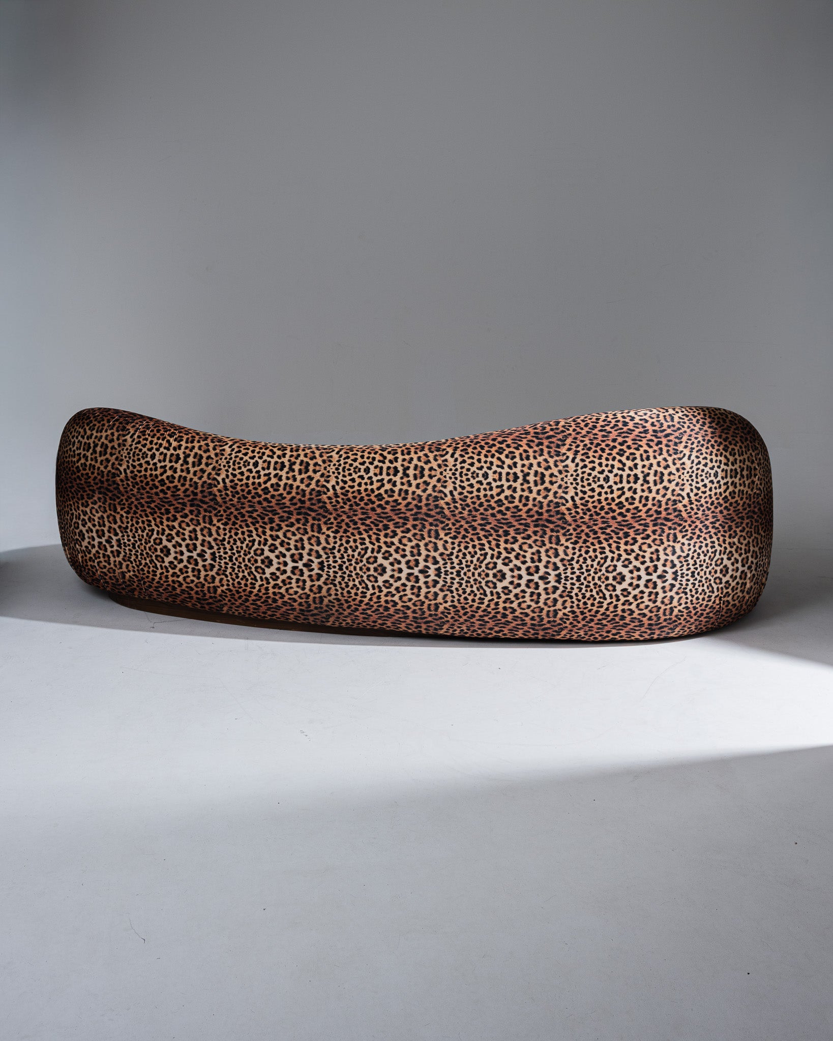 Large 5-seater sofa fully upholstered in leopard print fabric. Organic shape with continuous seat and enveloping curves. Internal solid wood frame, visible on the lower part.