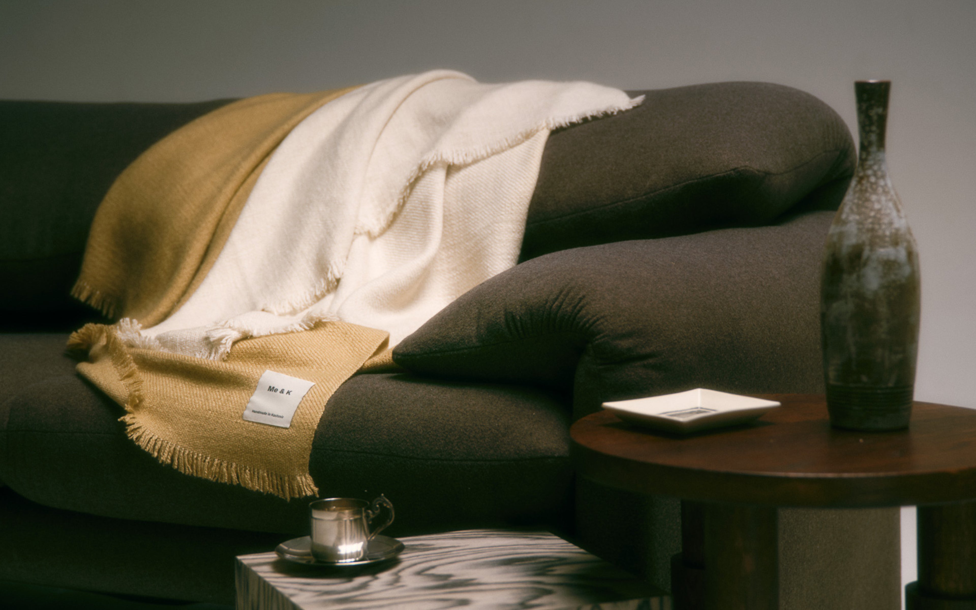 100% cashmere plaid "Sunset Shadow Throw Sand / Ivory", made by Me & K.