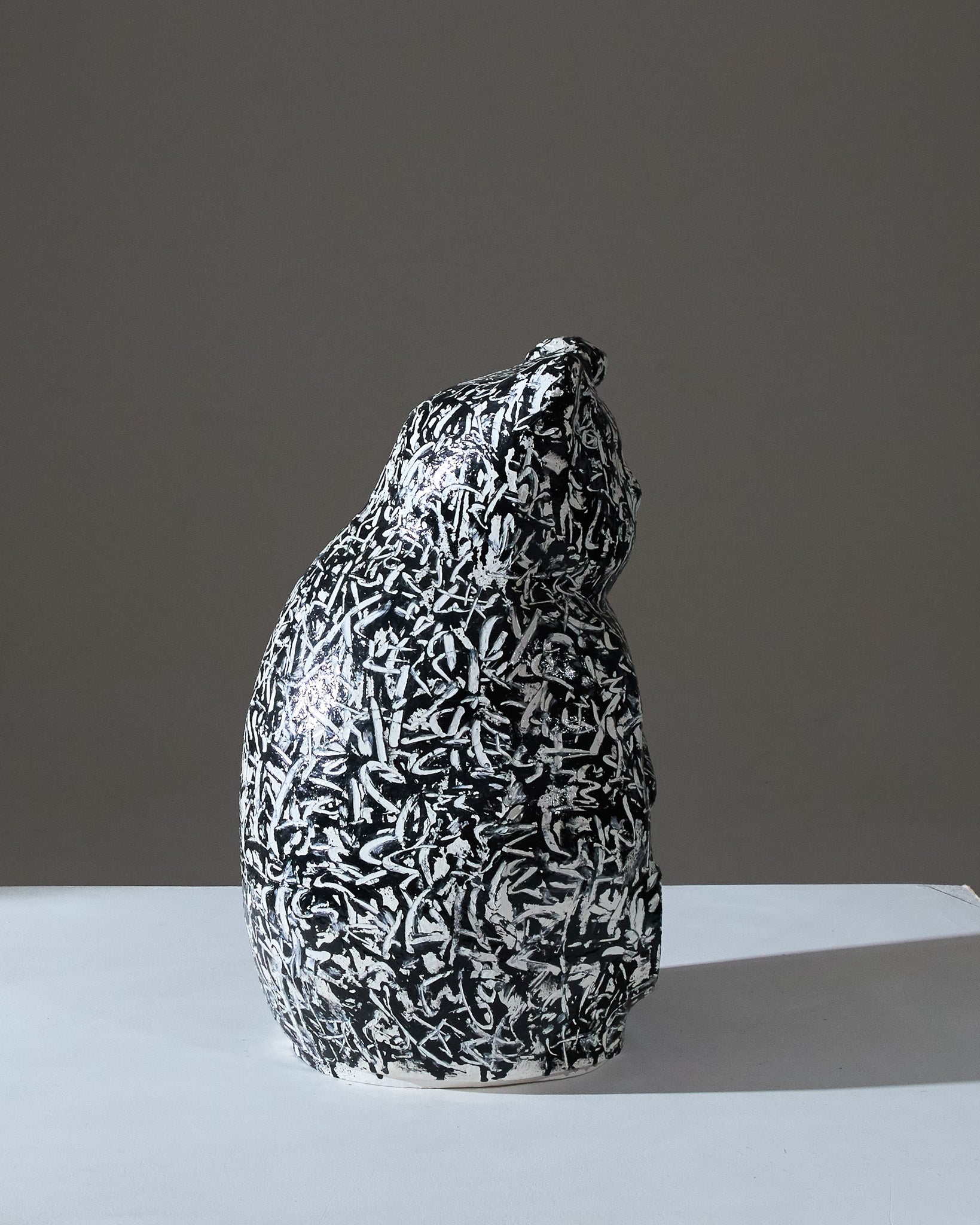Maneki-neko cat sculpture, a traditional symbol of good luck and prosperity. Handmade from painted papier-mâché. The hand-painted motifs give it a unique personality. Signed underneath: Tanc Paris 2018. Excellent condition.