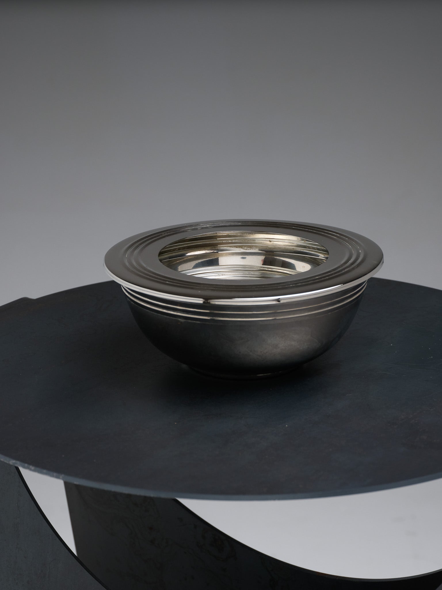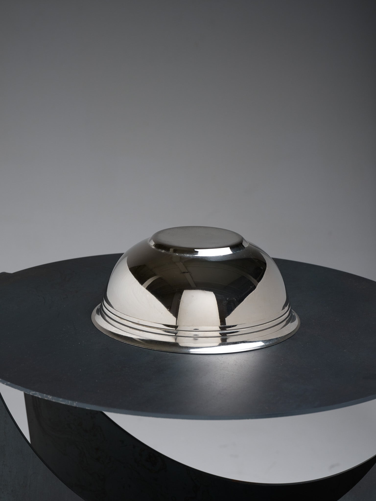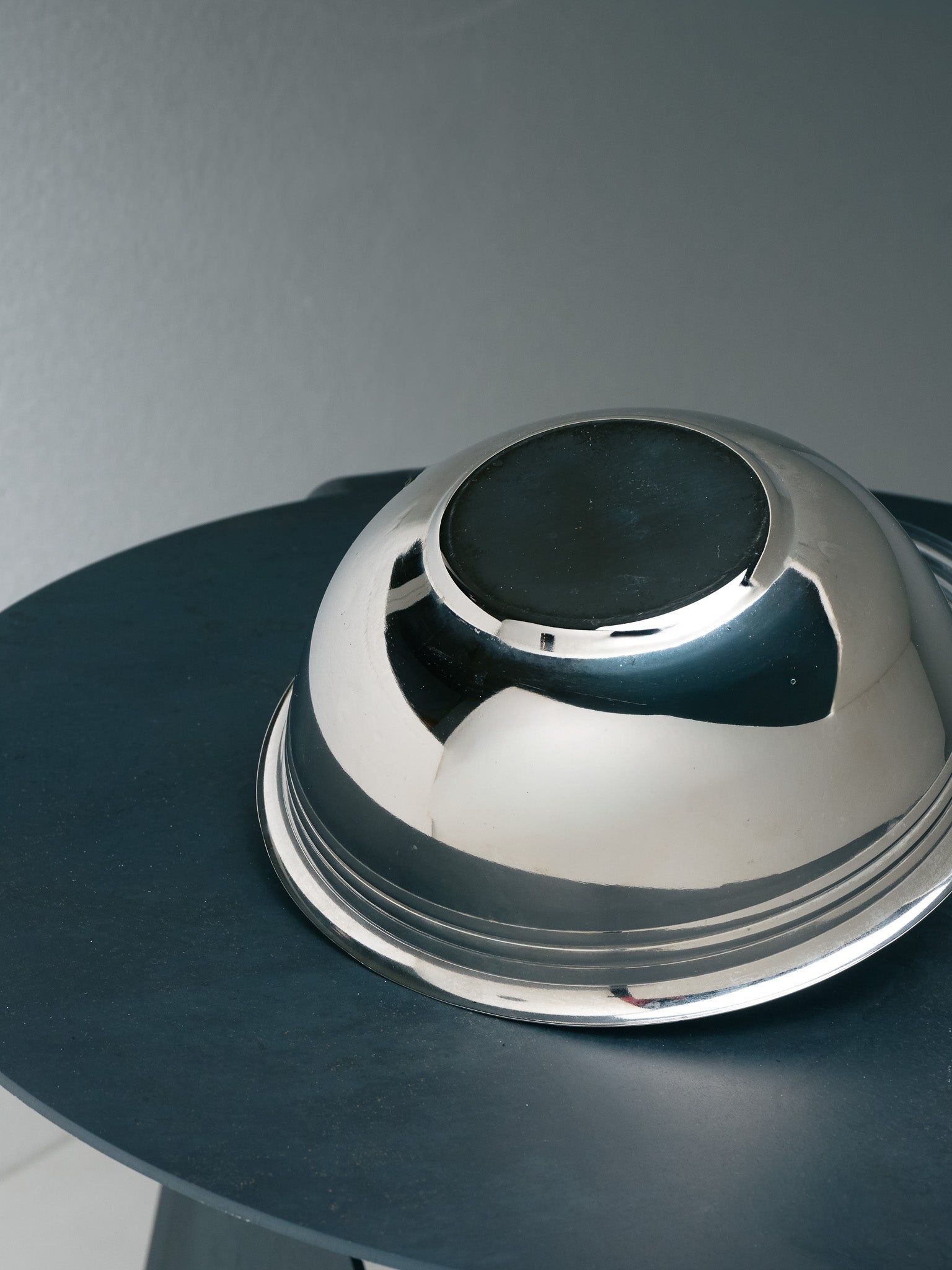 Chrome-plated metal caviar service by Geneviève Lethu. Comprising three parts: an ice cube tray, a lid, and a glass bowl. Very good condition.