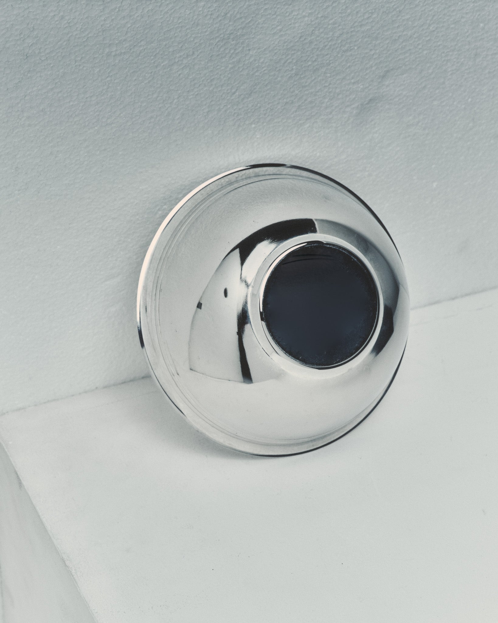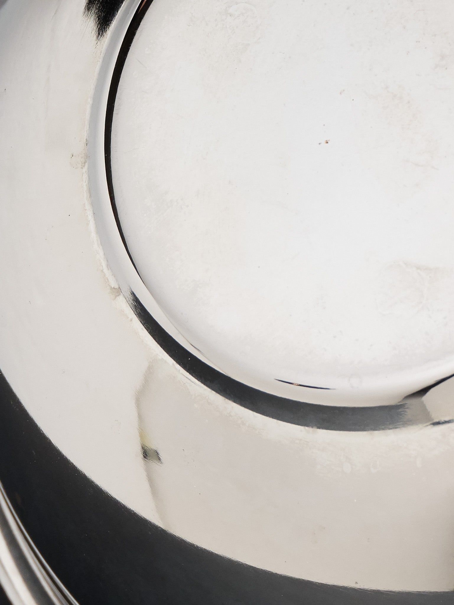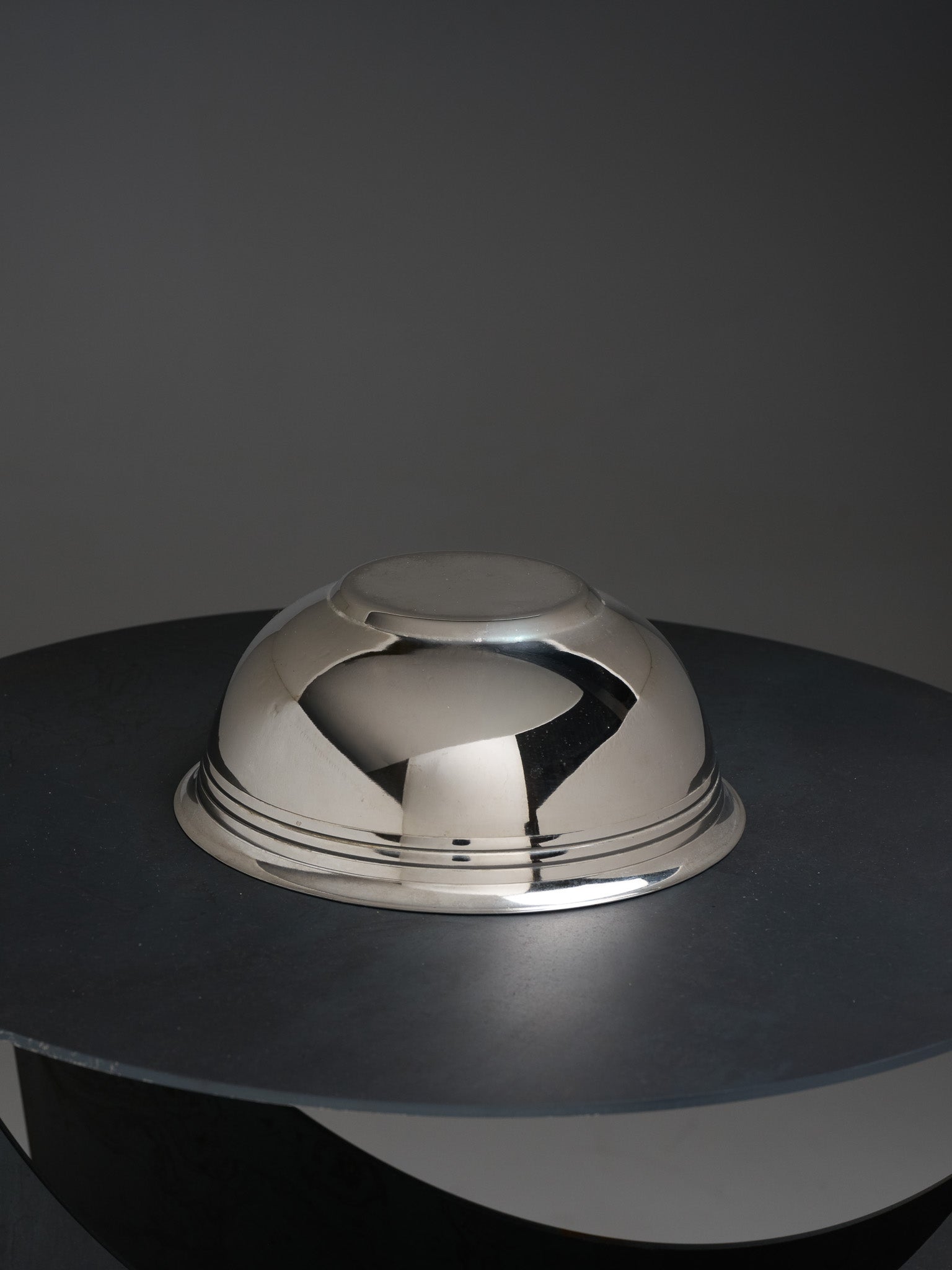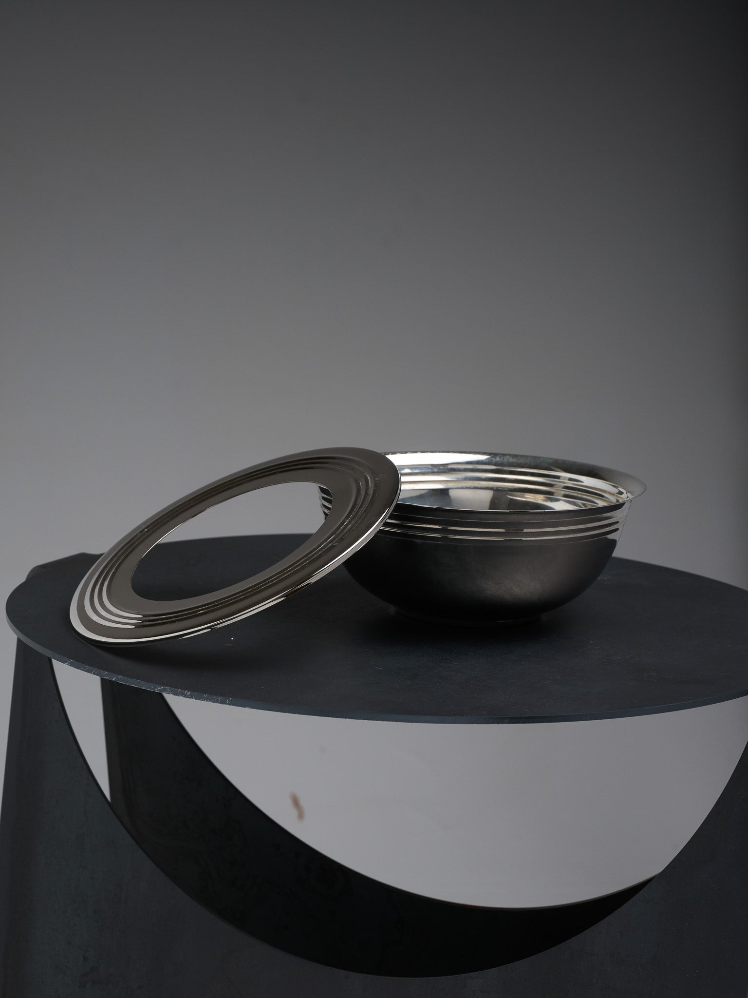 Chrome-plated metal caviar service by Geneviève Lethu. Comprising three parts: an ice cube tray, a lid, and a glass bowl. Very good condition.