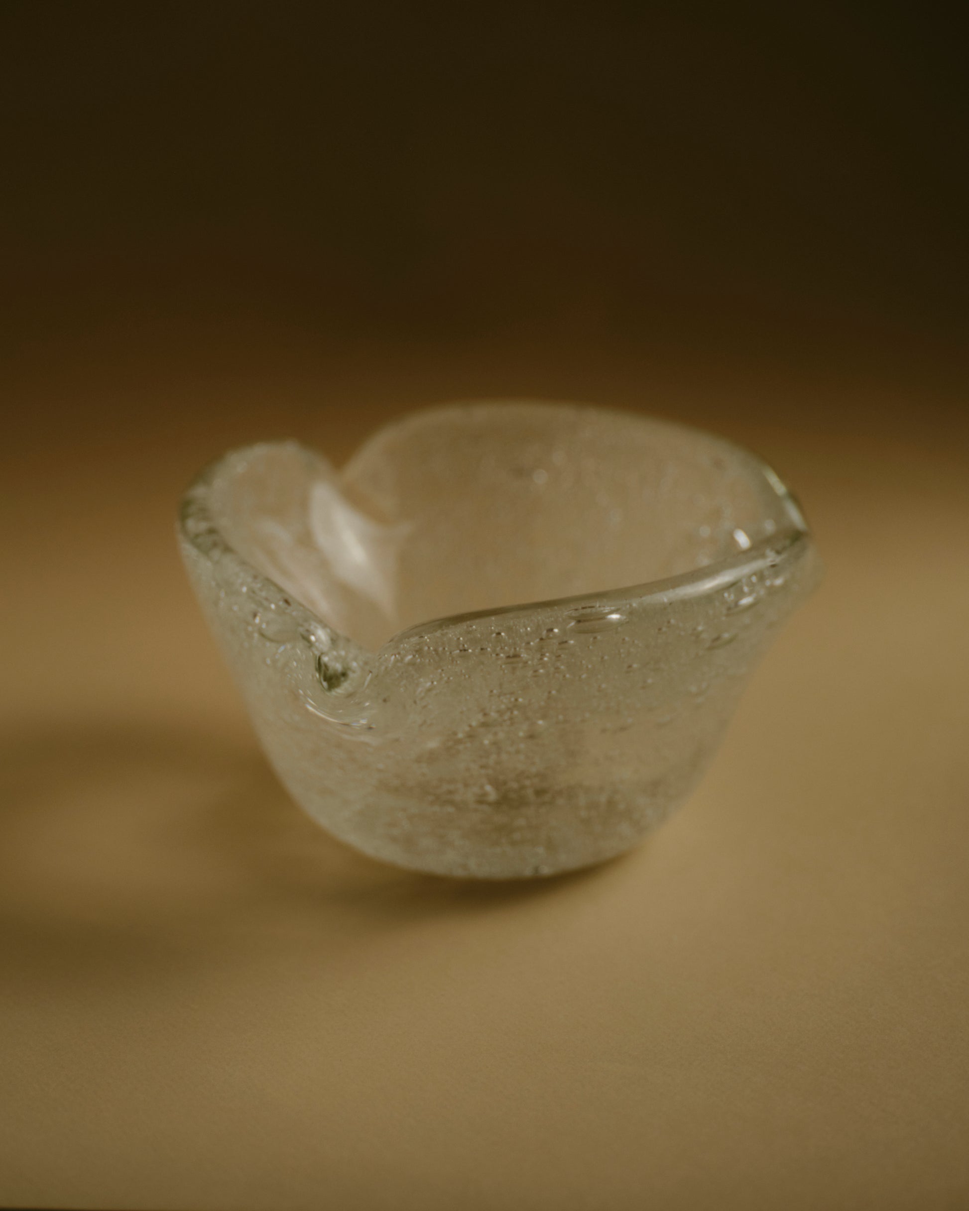 Large blown glass ashtray or bowl by Riom, made in France in the 1970s. Clear glass encrusted with air bubbles, free organic form typical of artisanal creations of the 1970s. Perfect condition.