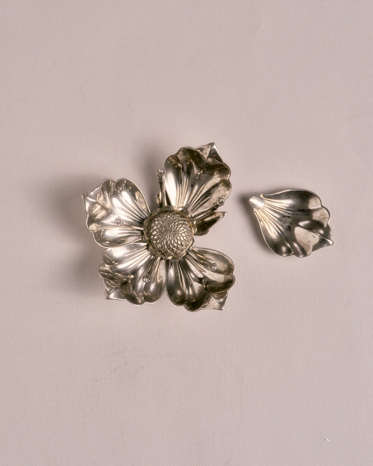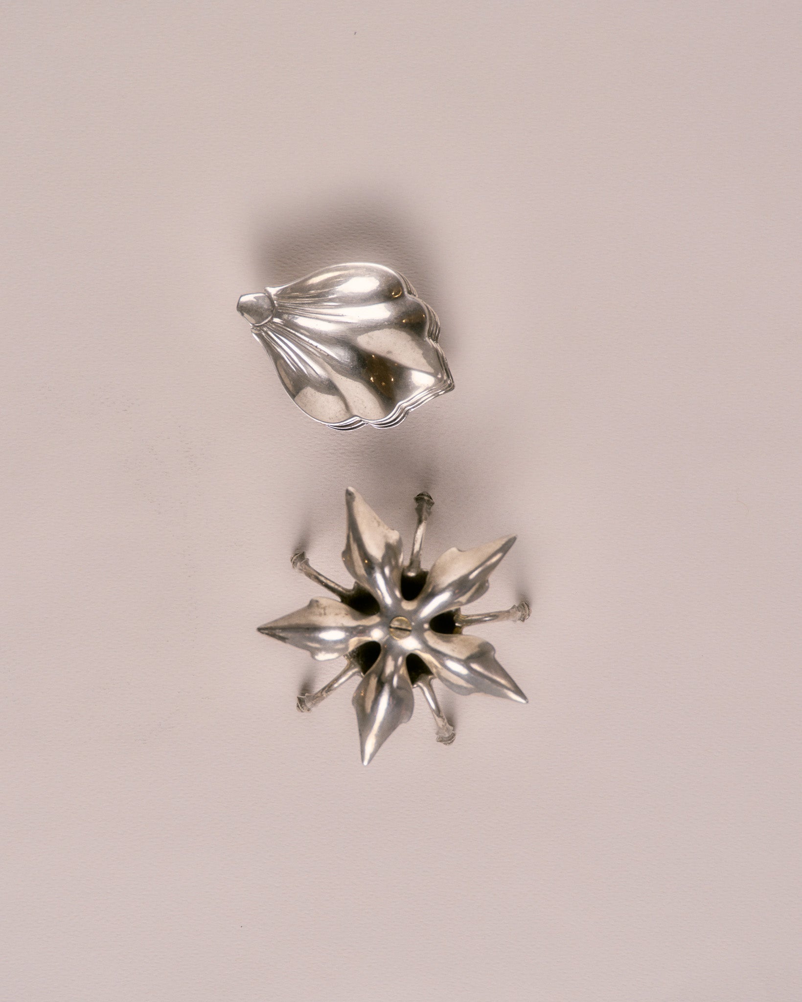 Set of six individual metal ashtrays, presented on their matching central stand. Each ashtray is shaped like a petal. Good overall condition, slight patina from use.