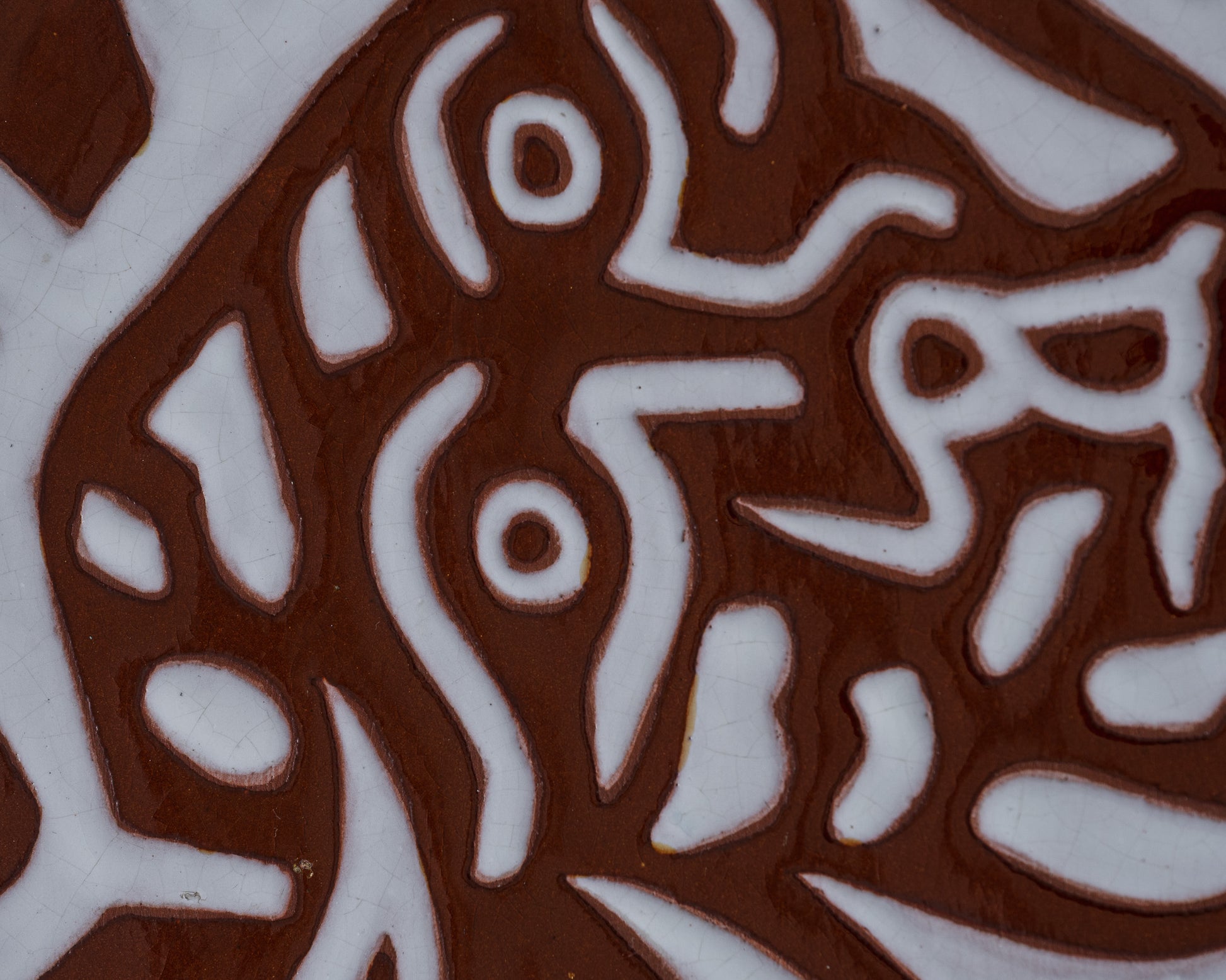 Free-form shape featuring a decor typical of Lurçat’s imagination: stylized graphic motifs, a constellation of stars, biomorphic forms, and white incised lines set into a layer of deep brown glaze.