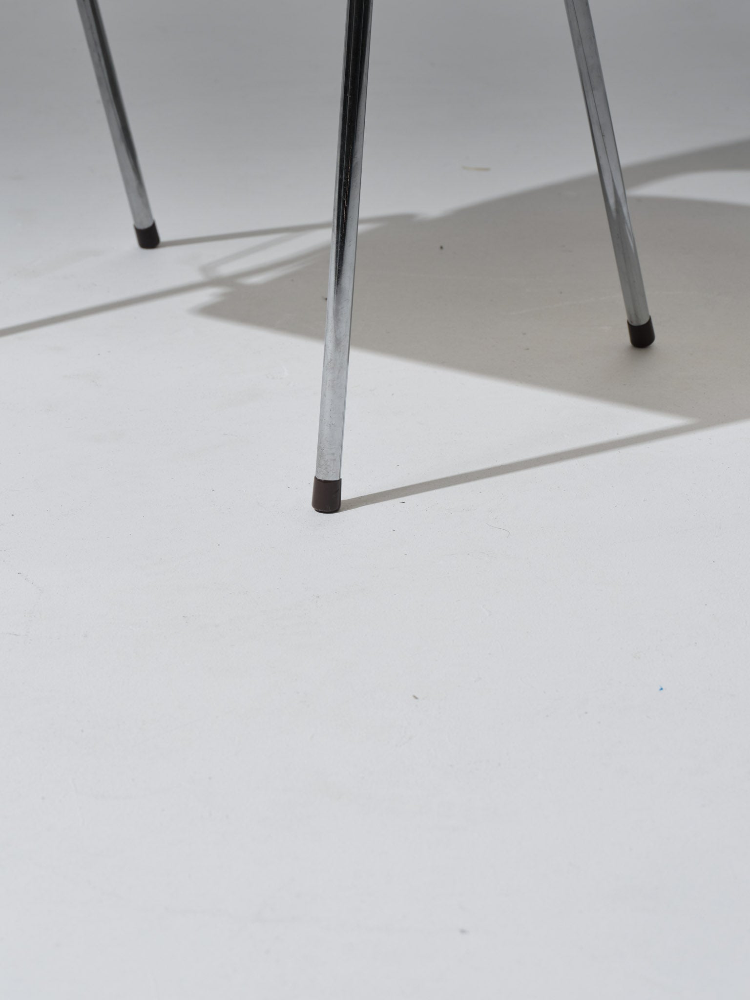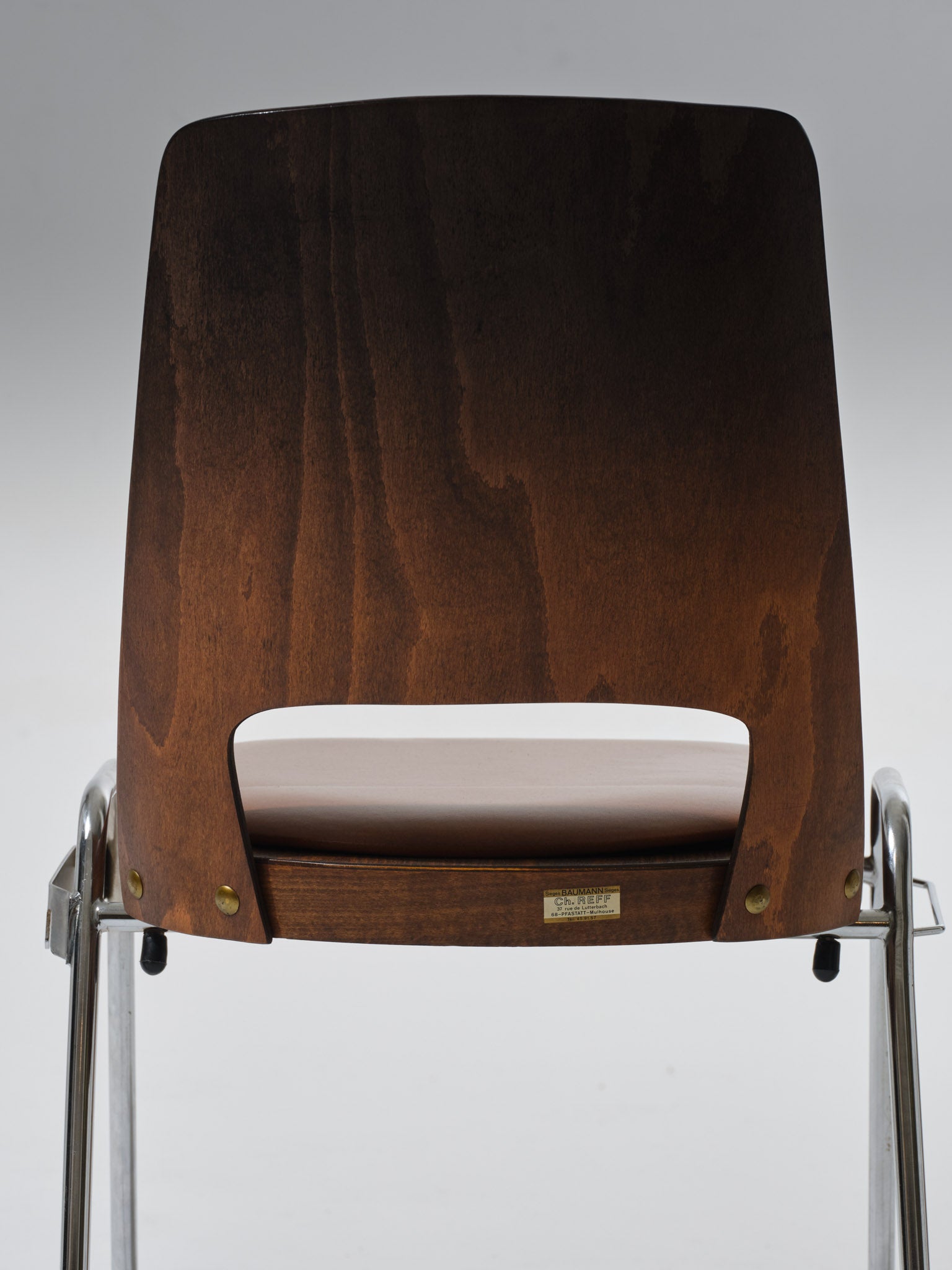 Chair produced by Baumann in the 1970s. Frame in bent beechwood, seat and back in cognac-colored vinyl, chromed steel base. A functional and comfortable model, typical of Baumann's designs intended for public spaces.
