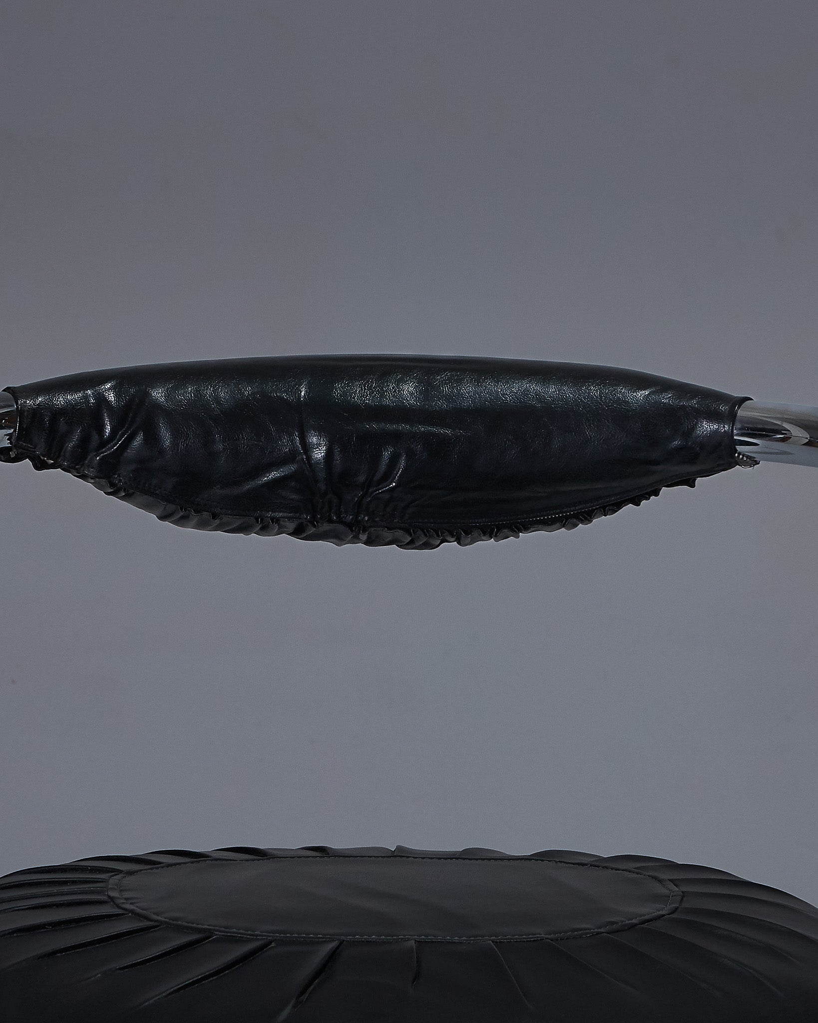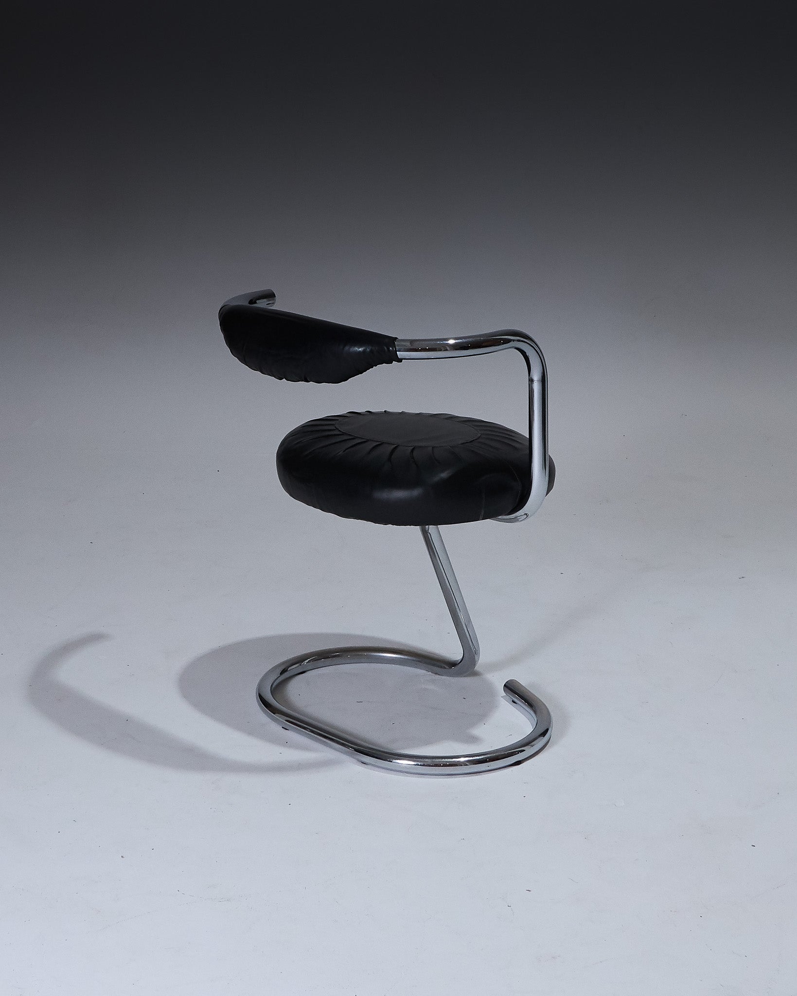Pair of "Cobra" model chairs by Italian designer Giotto Stoppino (1926–2011). Chromed tubular steel frame, made from a single piece integrating the base, seat, and backrest. Removable black imitation leather upholstery, with original label under the seat.
