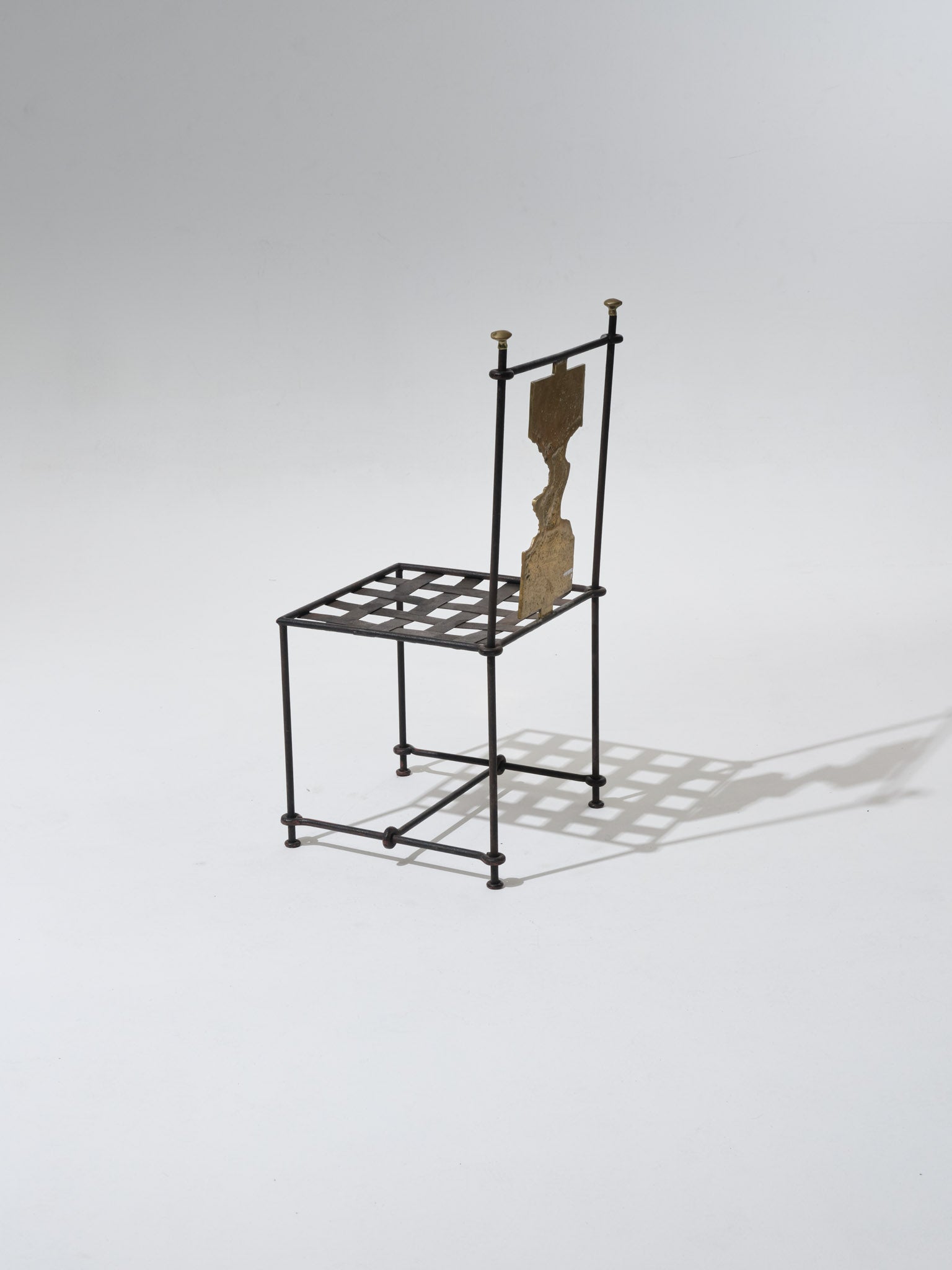 A sculptural chair created by designer and craftsman David Marshall, combining a patinated metal frame with a backrest adorned with a raw bronze plaque featuring organic shapes. Each piece is unique, showcasing the artist's artisanal skill and sculptural approach.