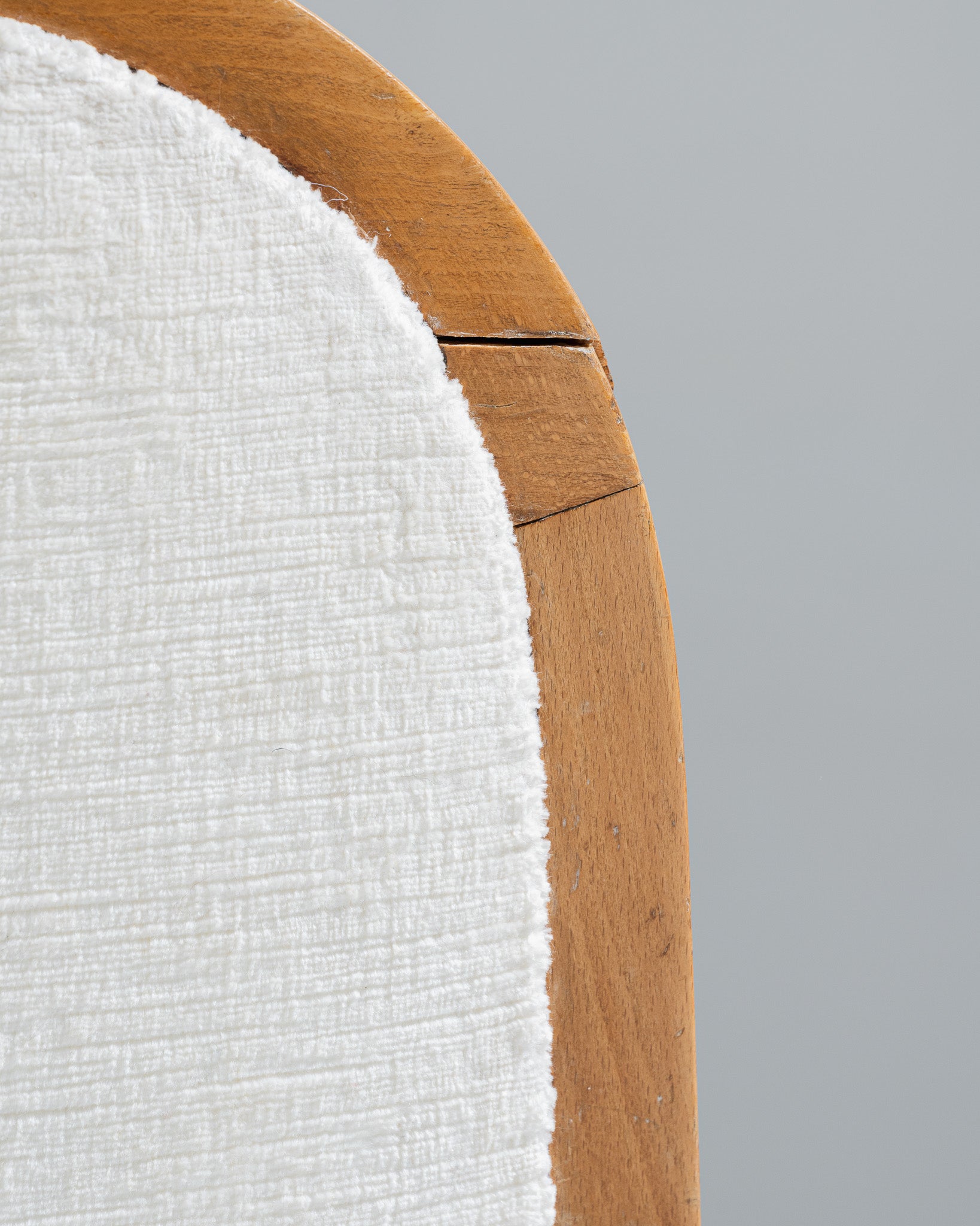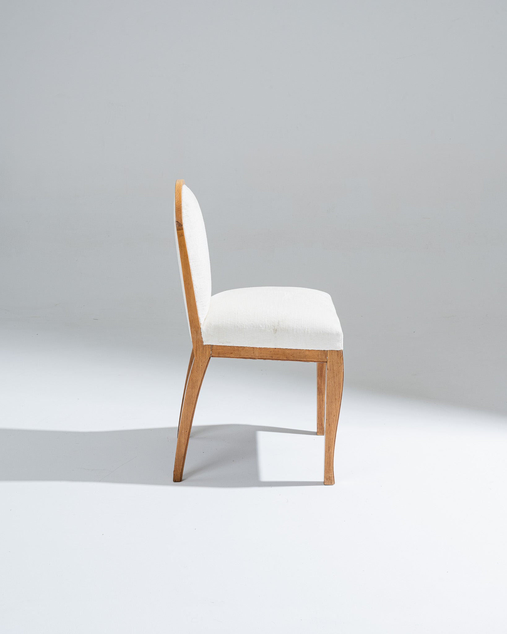 René Prou chair, made in the 1940s. Light wood frame with gently curved lines, typical of the modern neoclassical style of the period, featuring a curved backrest and a seat upholstered in textured ecru fabric.