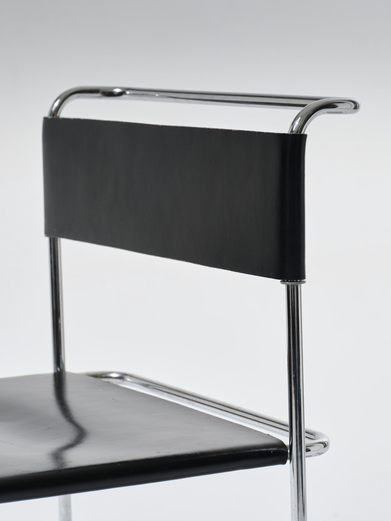 Libellula chair designed by Giovanni Carini for Tisettanta. Chromed tubular steel structure, seat and back in stretched black leather, held by a system of metal springs visible at the rear.
