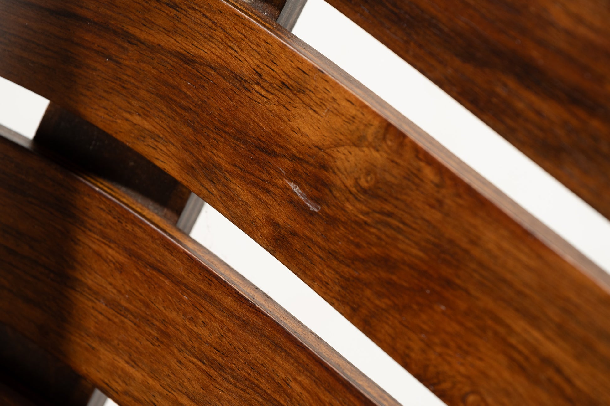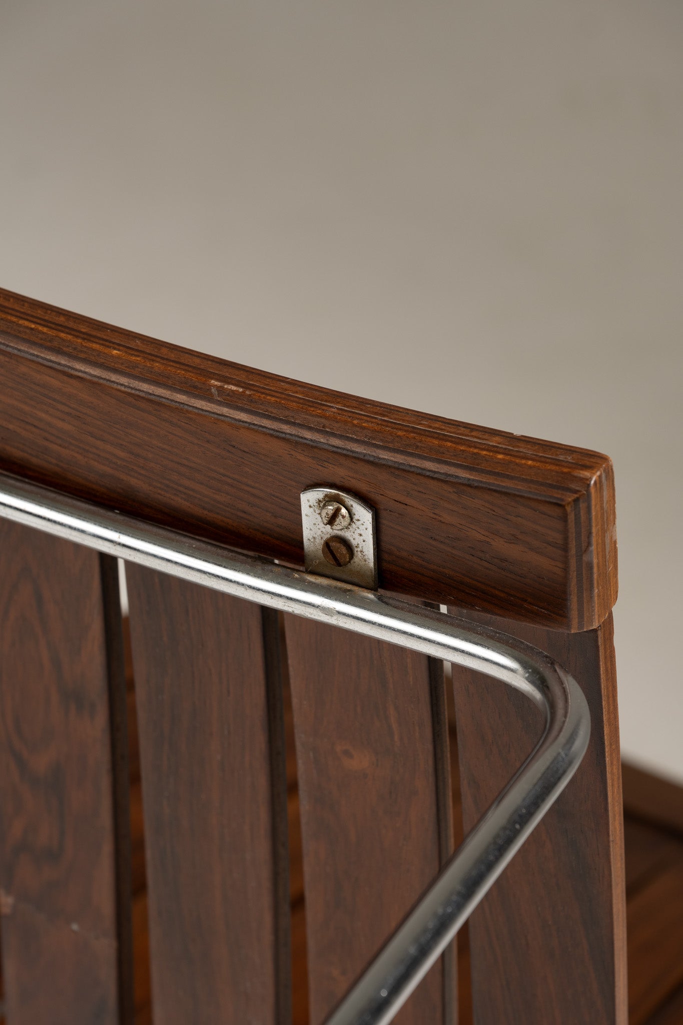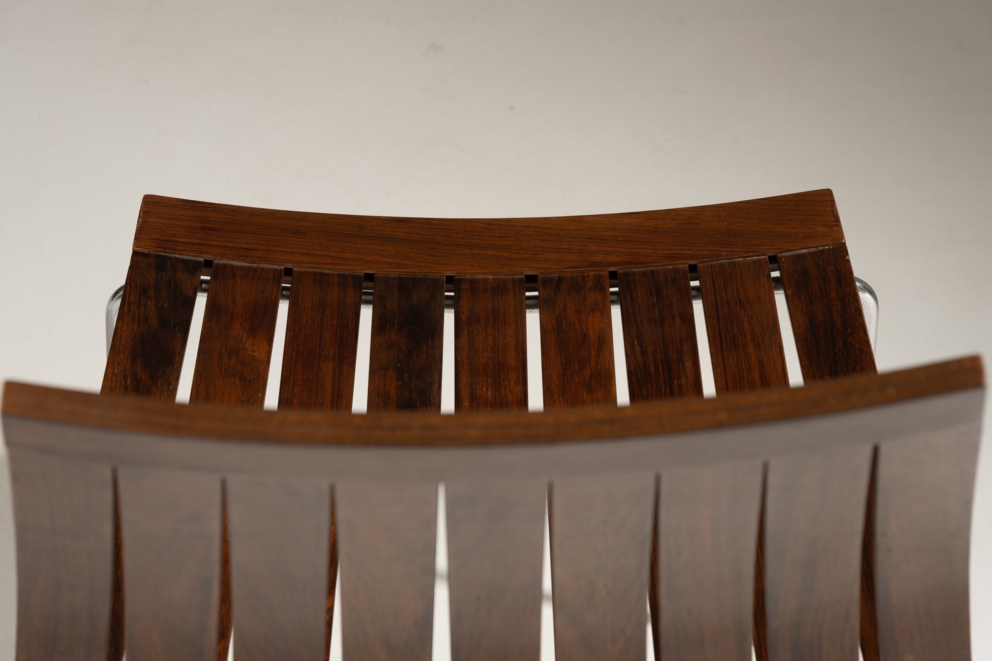 The Scandia chair, designed by Norwegian designer Hans Brattrud in the 1960s, features a seat made of bent wooden slats fixed to a chromed steel frame forming a sled base. An iconic example of Norwegian design.