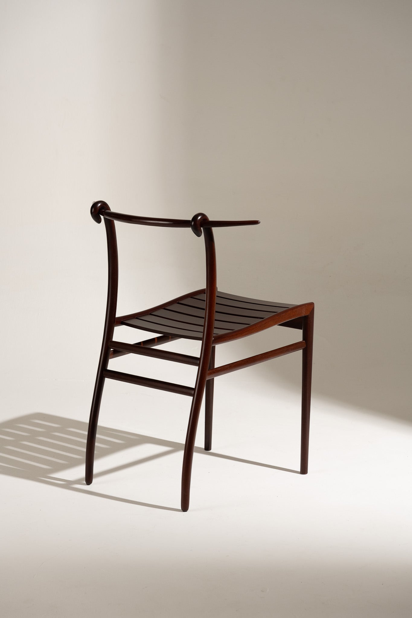 Slow Love chair by Christophe Pillet, produced by XO in the 1990s. Made of solid mahogany and turned wood. Dark wood frame, backrest composed of two curved uprights connected by a turned horizontal crossbar. Seat made of parallel wooden slats. Four straight legs with lateral and rear stretchers.