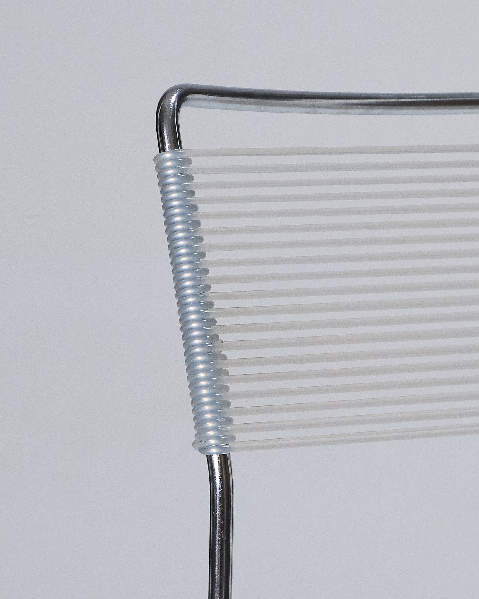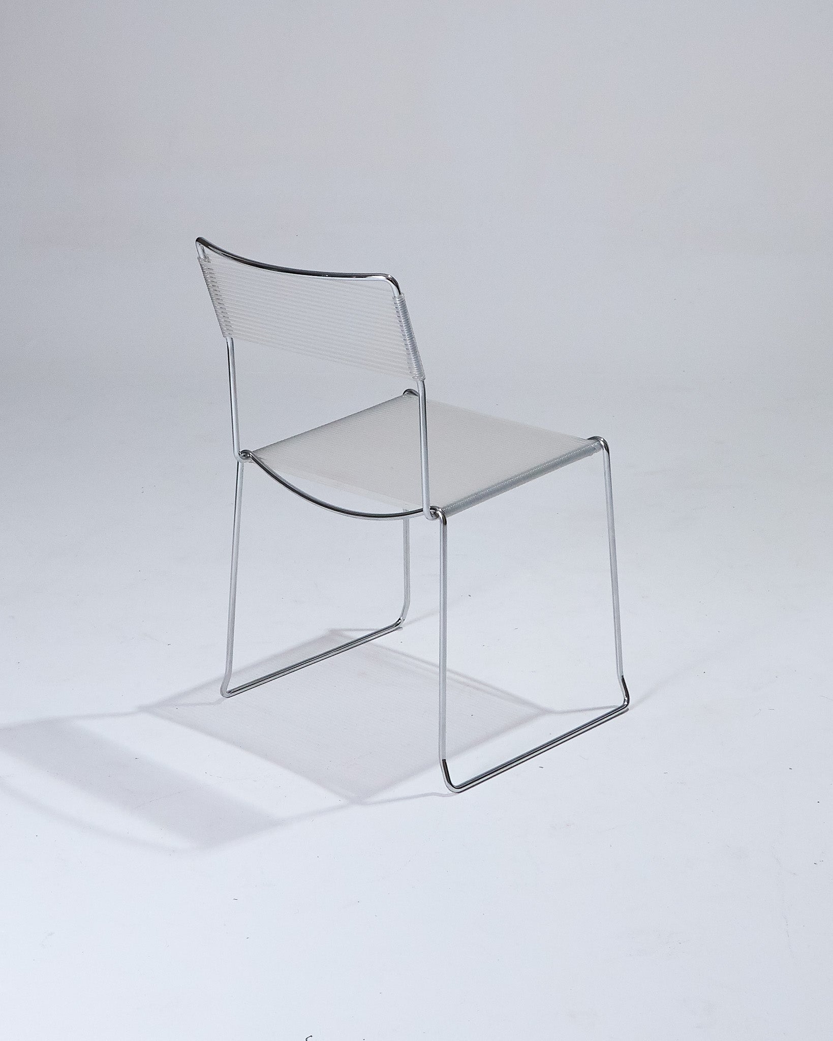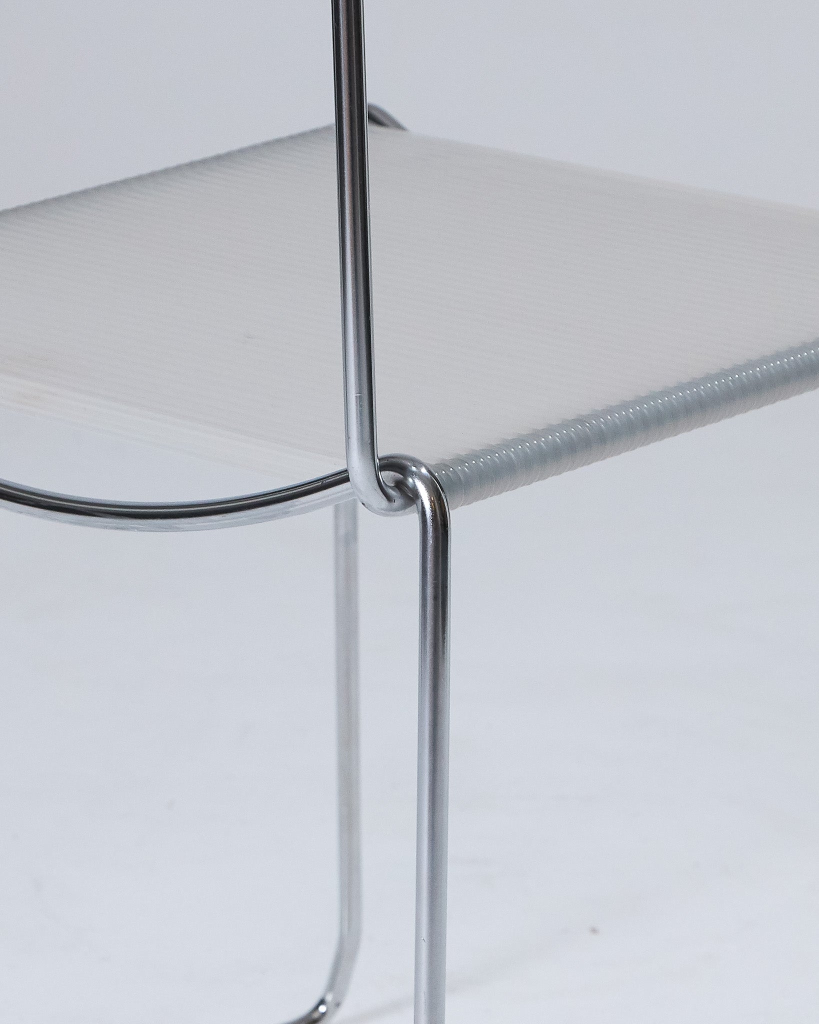 Chaise empilable en tiges de métal cintrées formant la structure. Assise et dossier en fils de PVC translucide tendus (dit "spaghetti"). Structure monobloc, assemblage par courbure et soudure. Travail des années 1970 dans le goût de Giandomenico Belotti. Bon état général.