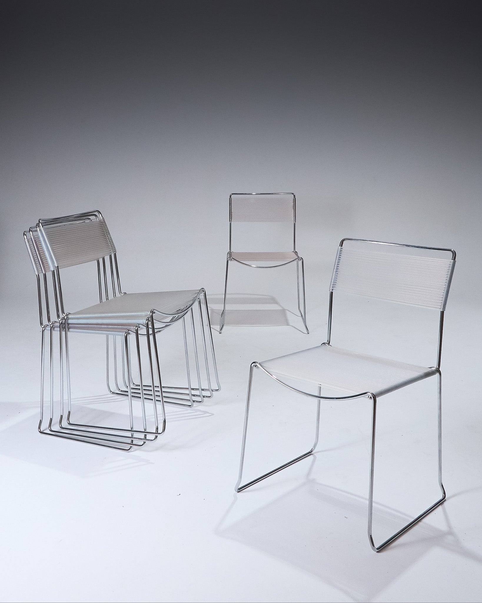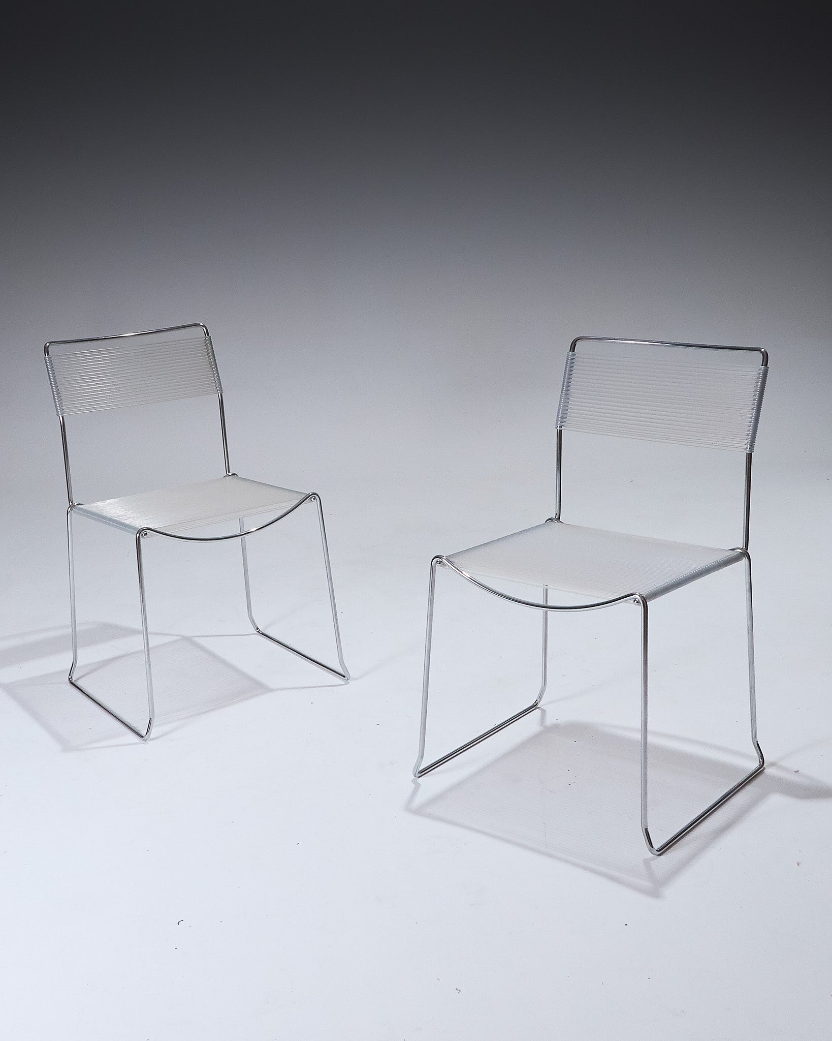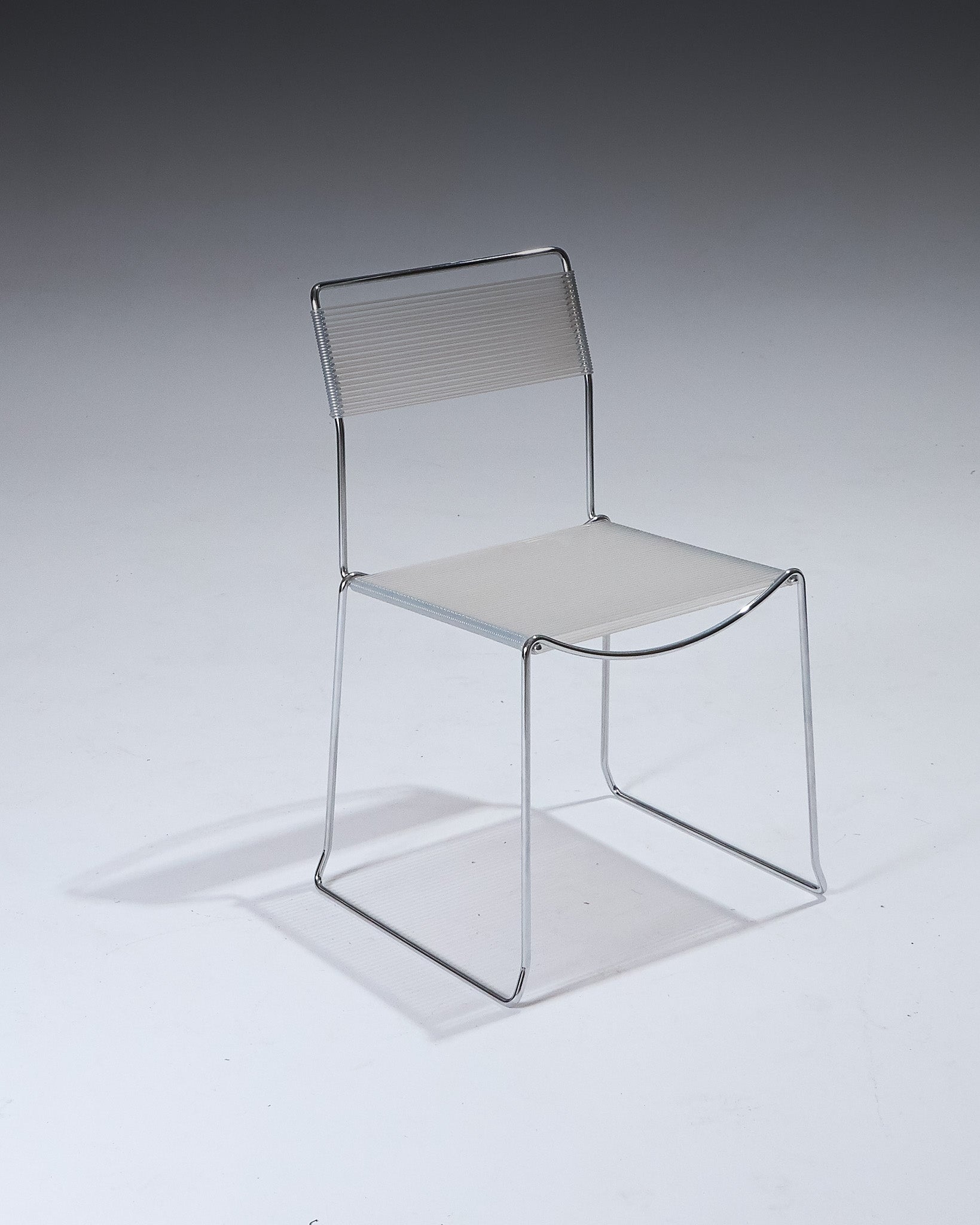 Chaise empilable en tiges de métal cintrées formant la structure. Assise et dossier en fils de PVC translucide tendus (dit "spaghetti"). Structure monobloc, assemblage par courbure et soudure. Travail des années 1970 dans le goût de Giandomenico Belotti. Bon état général.
