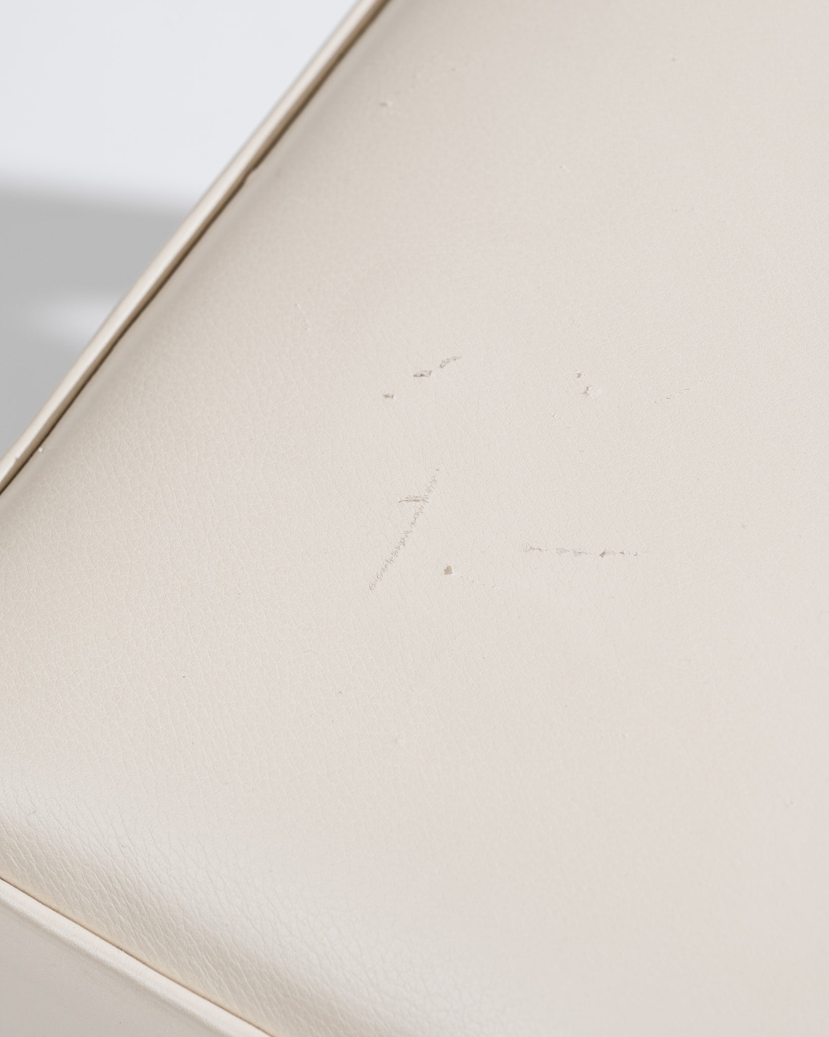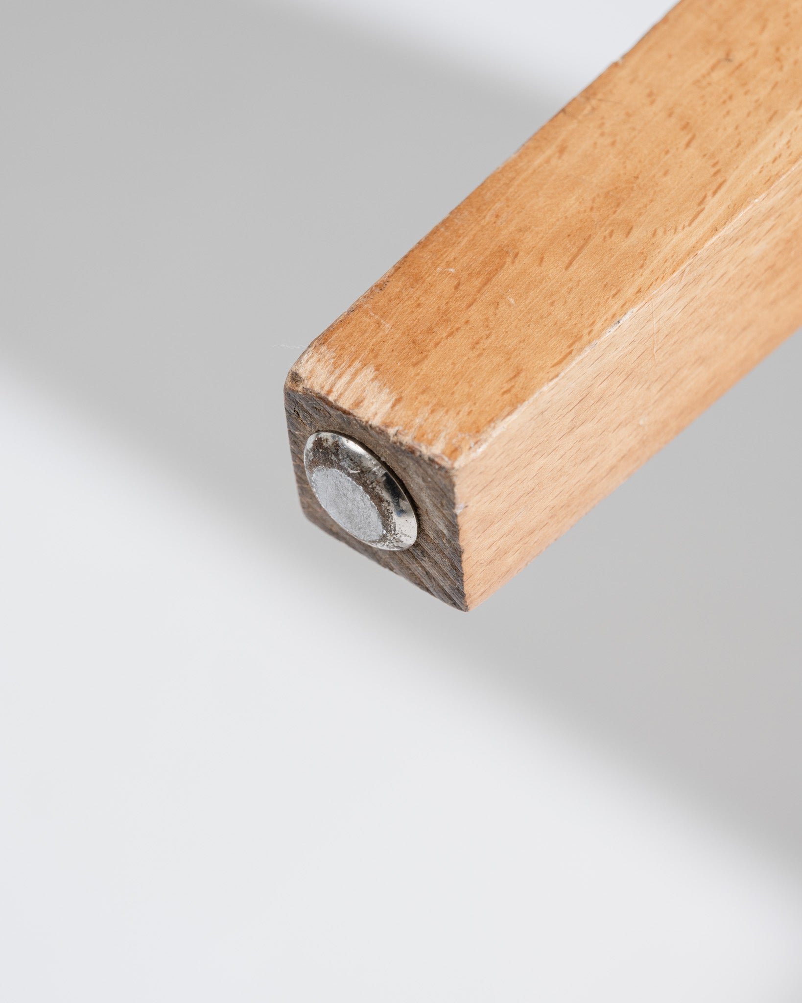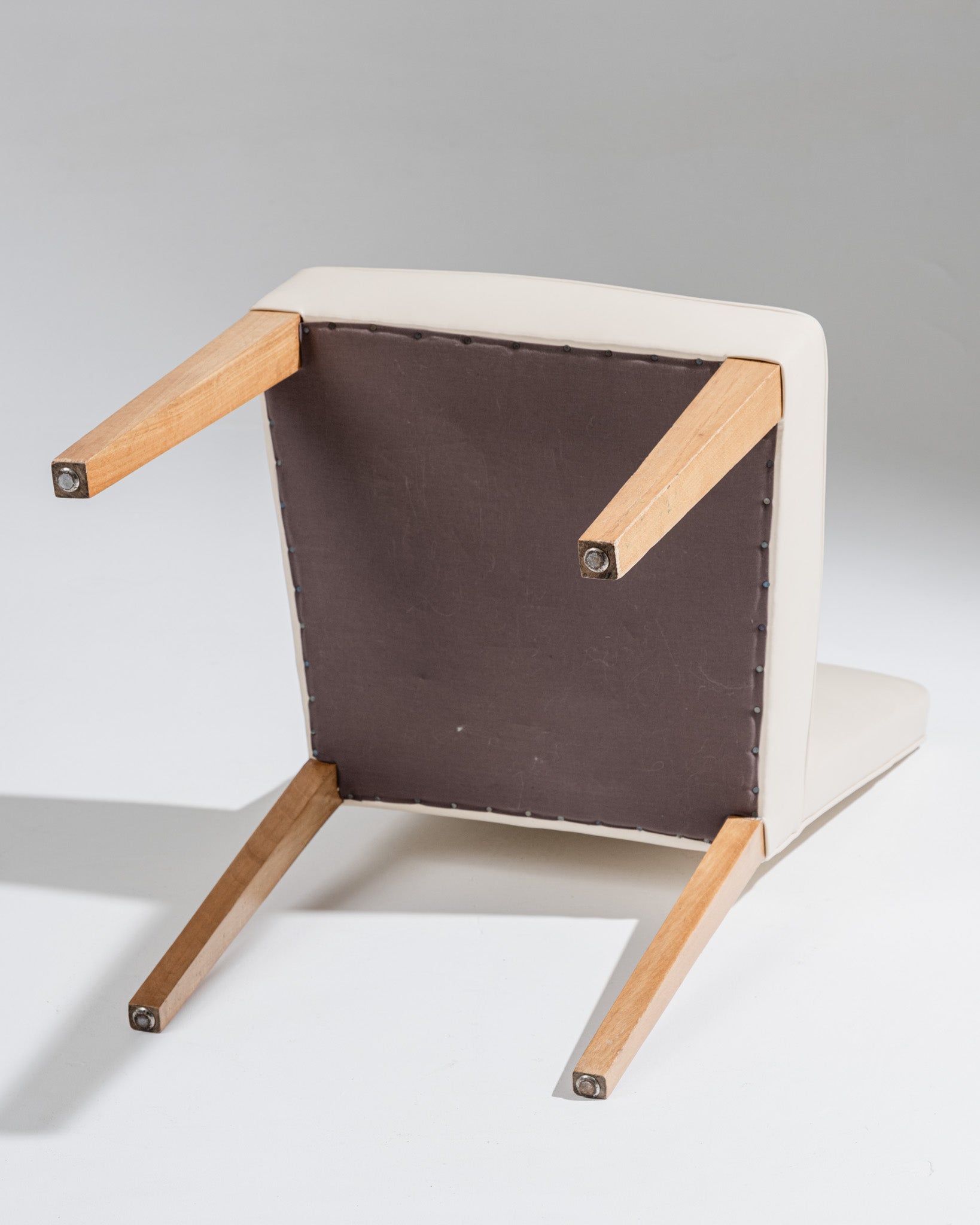Chair in sycamore and ecru fabric. Solid wood frame, straight legs, slightly inclined backrest. Seat and backrest upholstered in a light fabric.