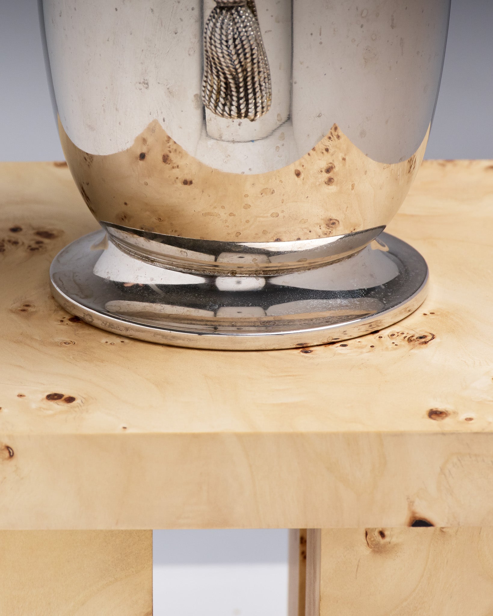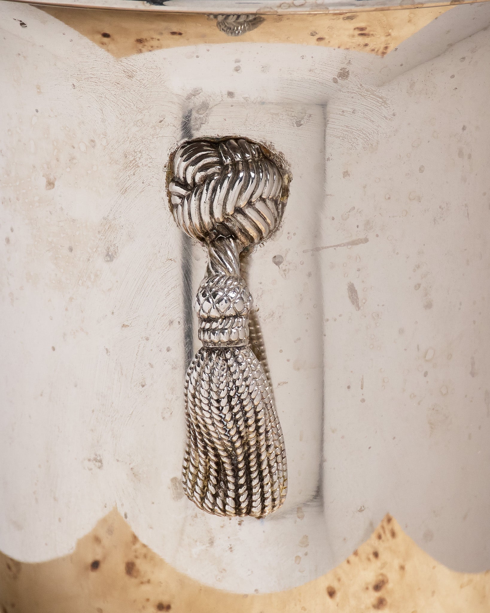 Silver-plated metal champagne bucket in the style of Maria Pergay's work from the 1970s. Wide body on a footed base and handles imitating passementerie. Good overall condition. Patina present on the base, consistent with use and age.