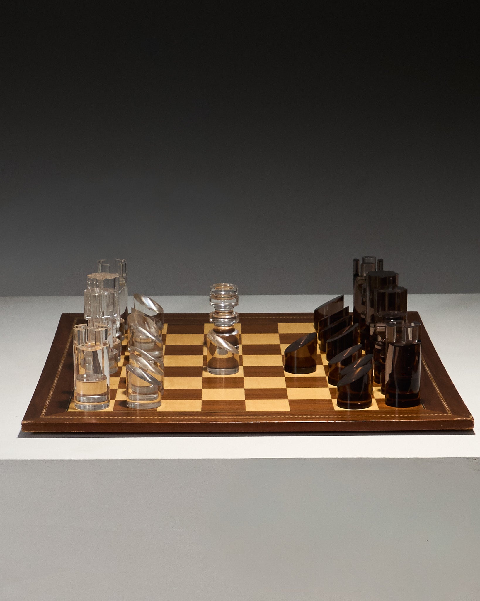 White and smoked plexiglass chess set. Piece in the style of the chess set designed and manufactured by Michel Dumas in the 1970s. Pieces in very good condition.