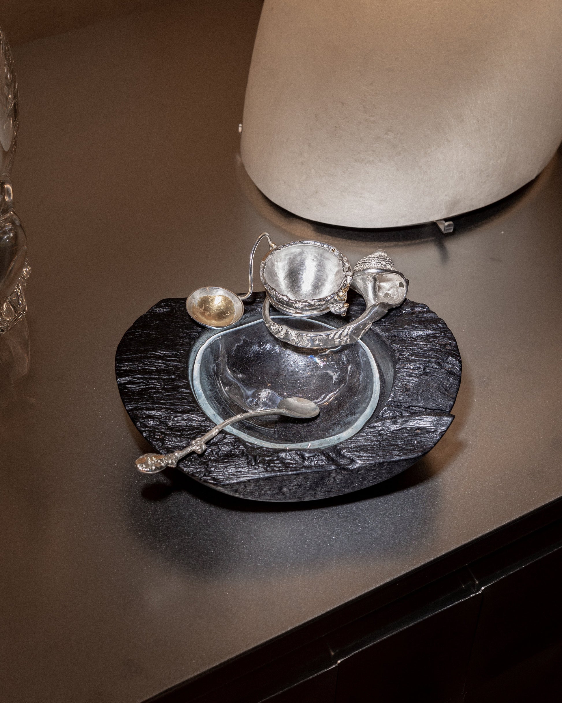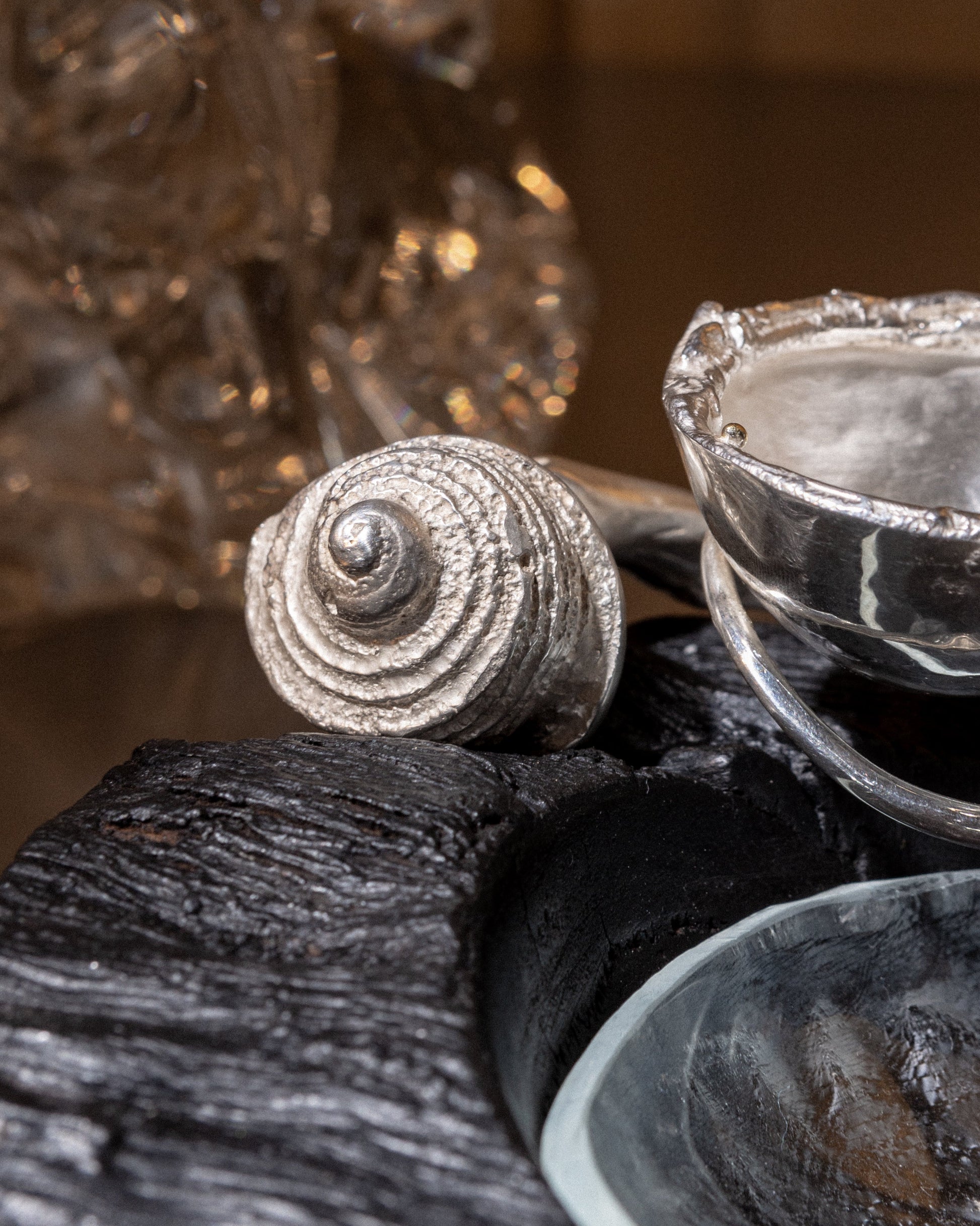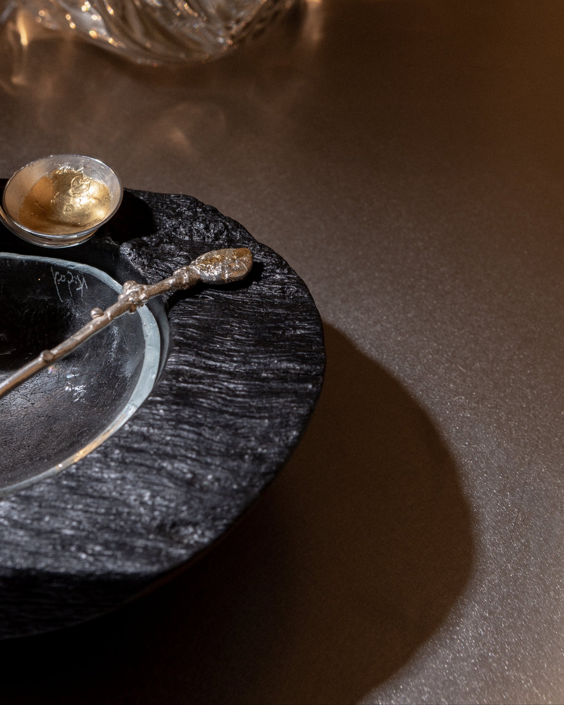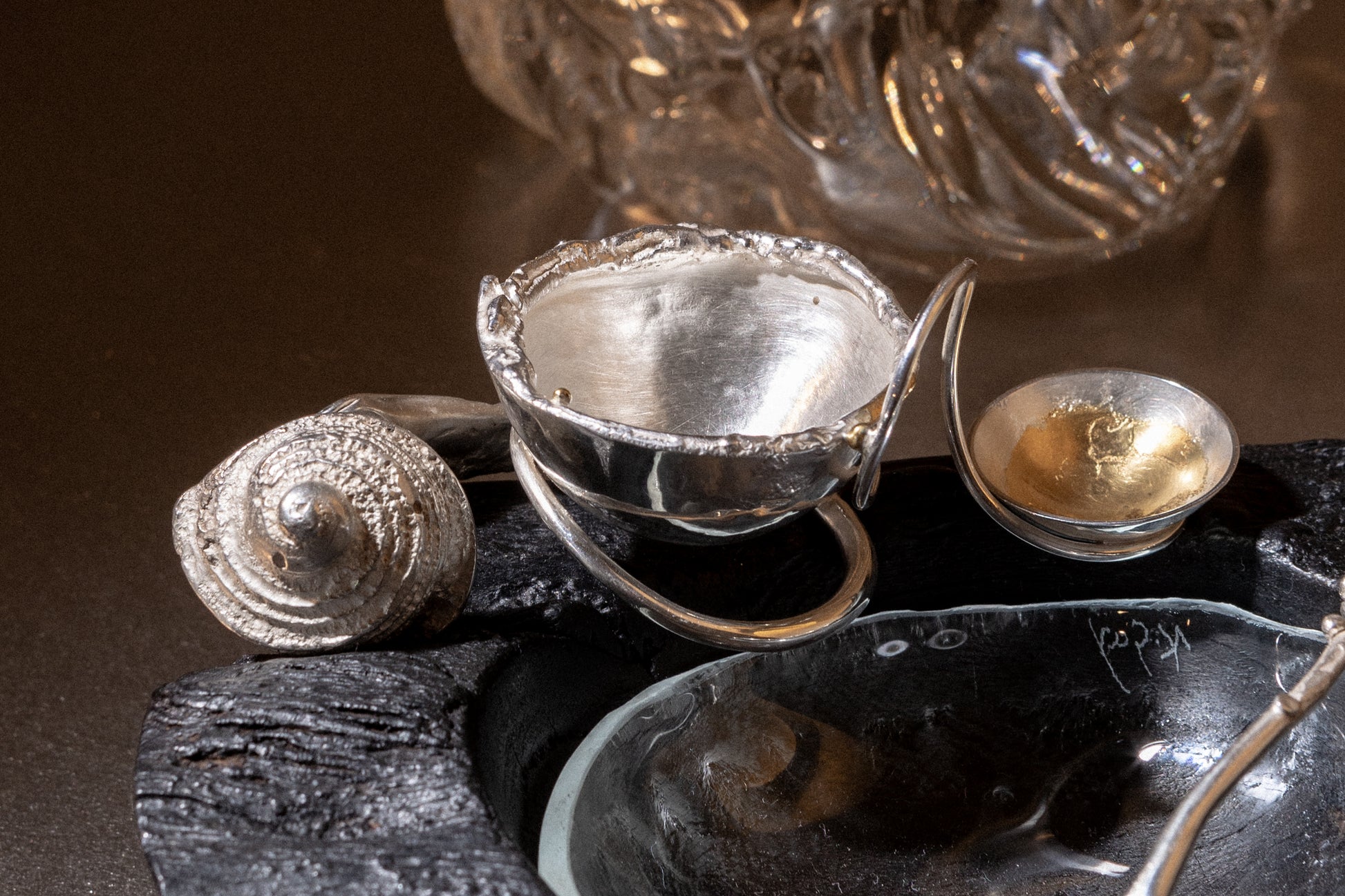 Egg cup breakfast for one in solid silver 925, 925 °/00 and fine gold 999 °/00, by Karen Gay. Unique piece.