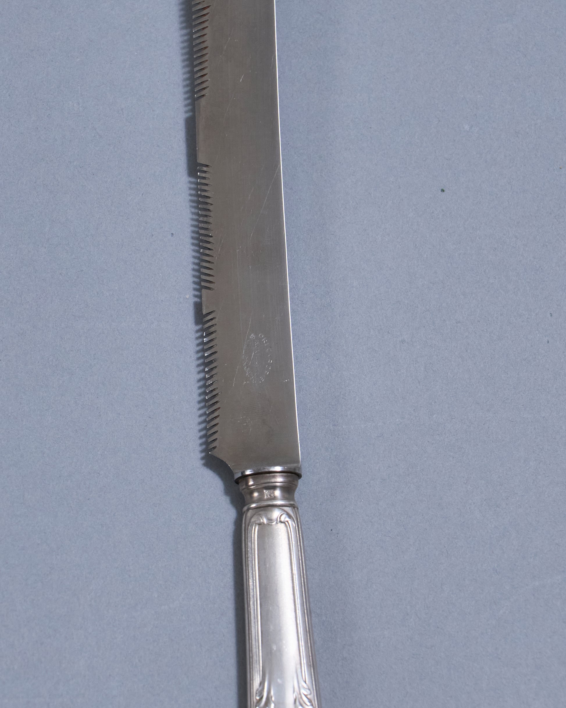Silver-plated bread knife typical of 20th-century tableware. Its decoration demonstrates the expertise of French goldsmiths. Some signs of wear. Good condition.