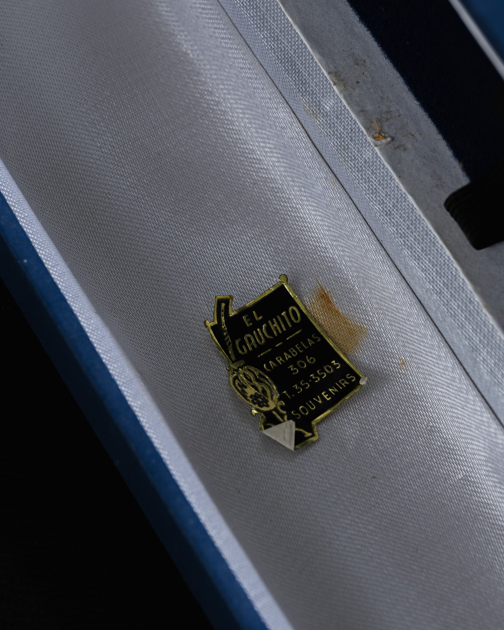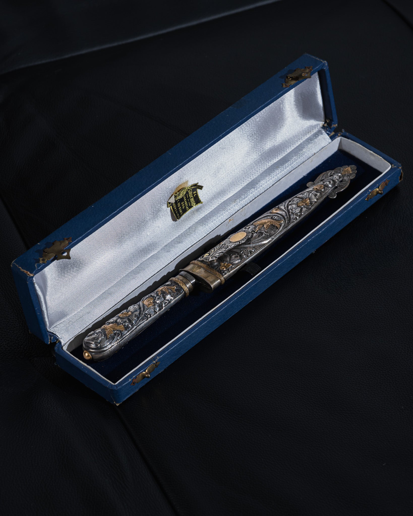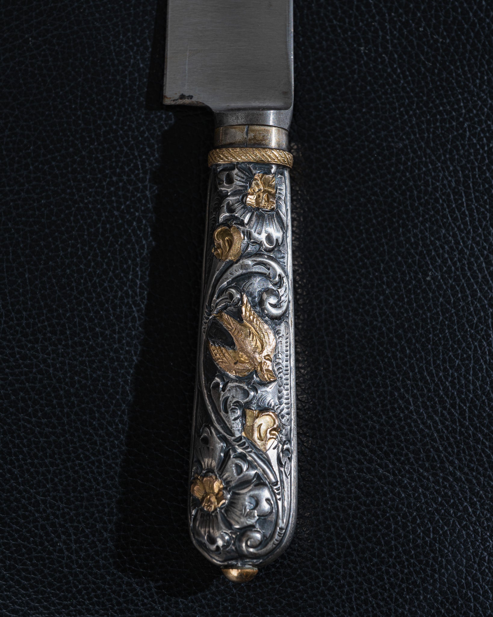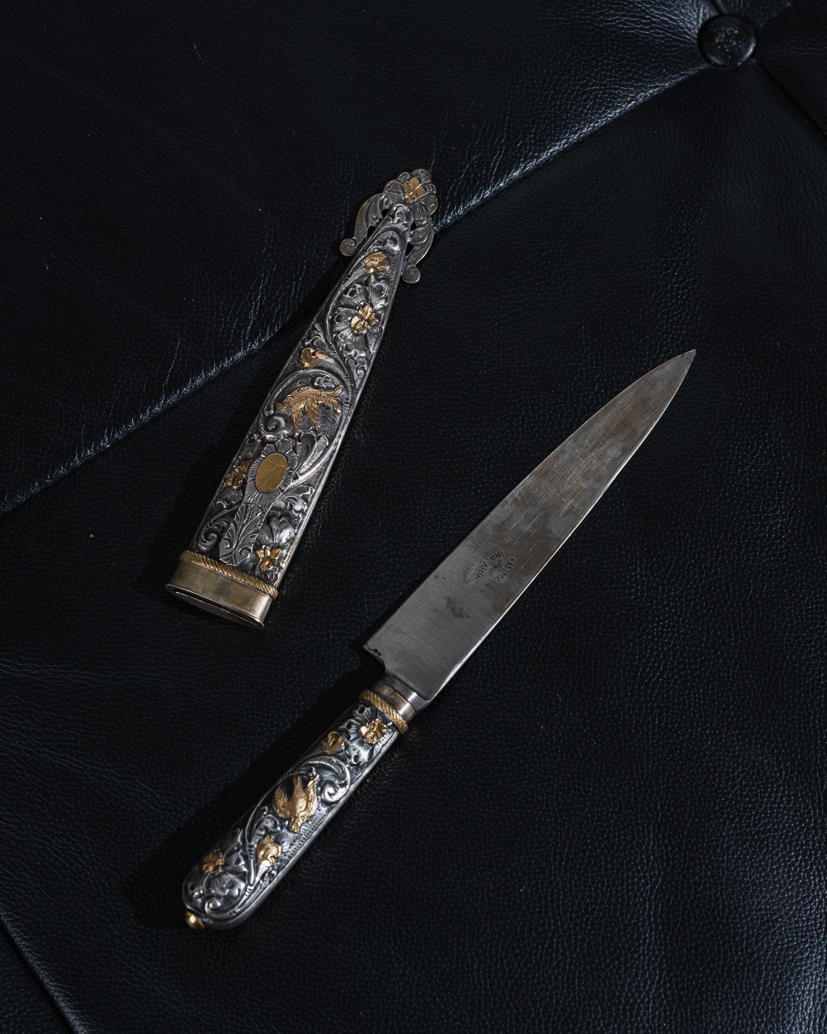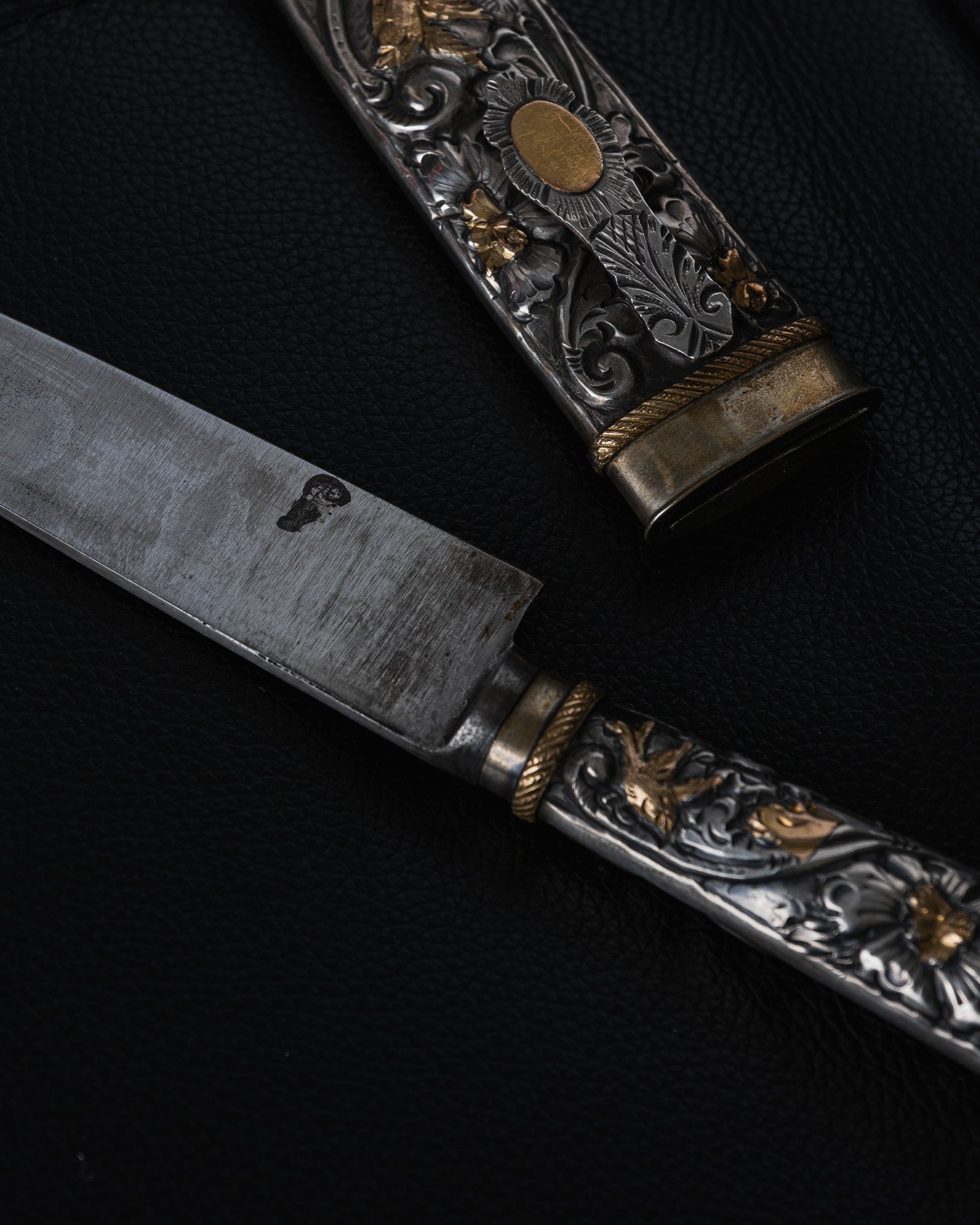 Traditional gaucho knife, of Argentinian origin. The handle and sheath are richly decorated with chiseled metal featuring floral motifs, partially gilded. Presented in its original case. Good condition.