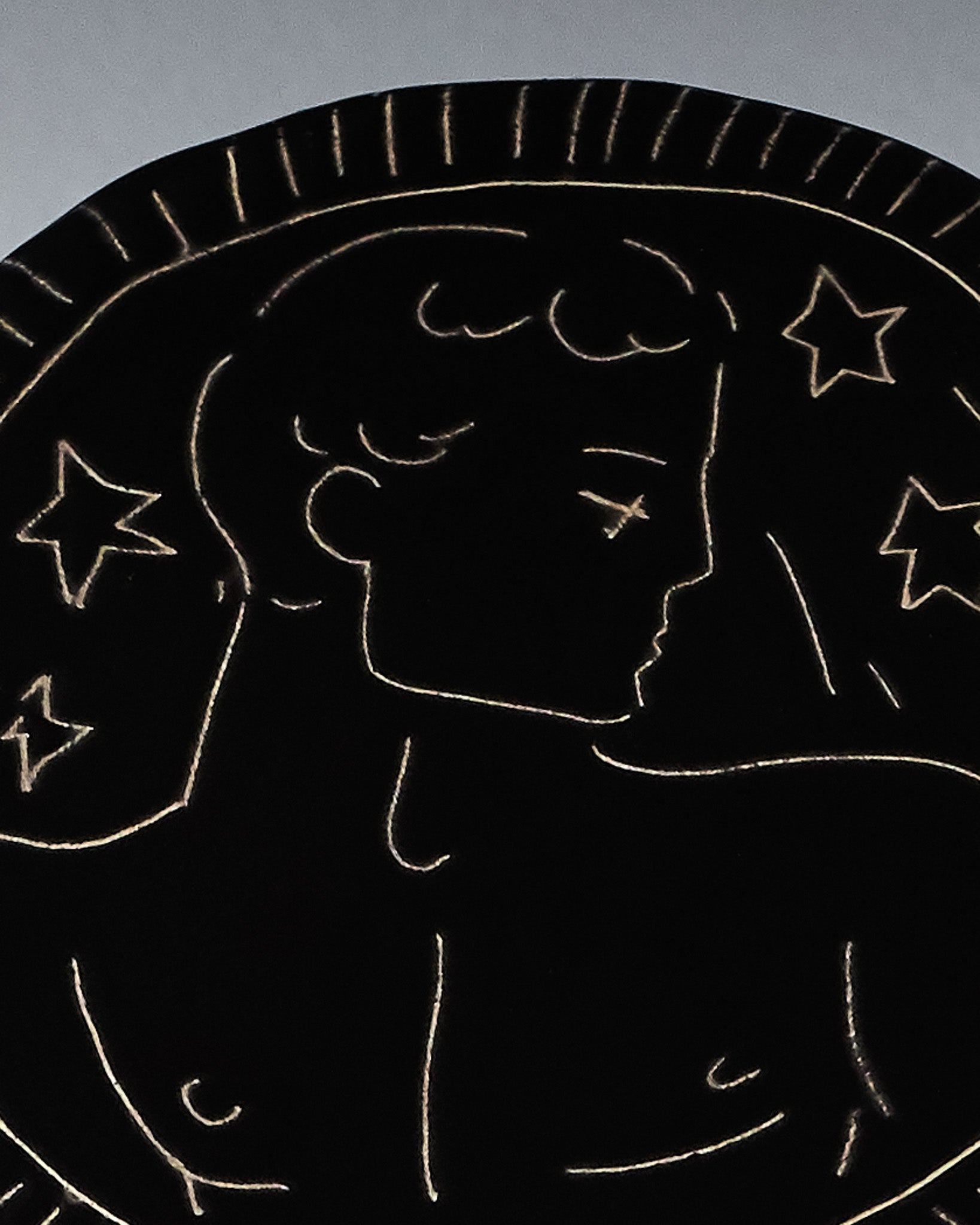 Black glazed ceramic coaster with an incised design depicting a male profile surrounded by stylized white star motifs, with a striated border. Unique handcrafted piece, signed 'Eldarov. T' on the reverse.