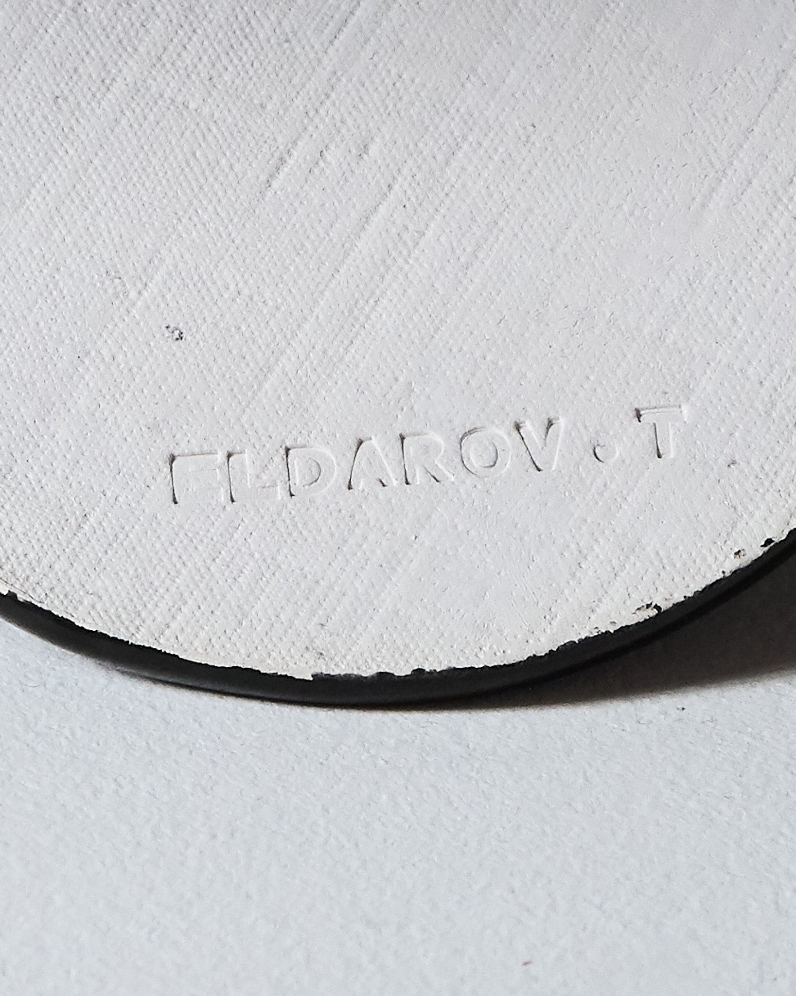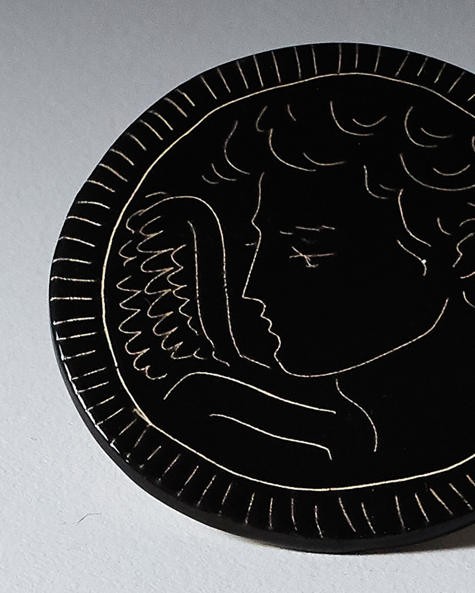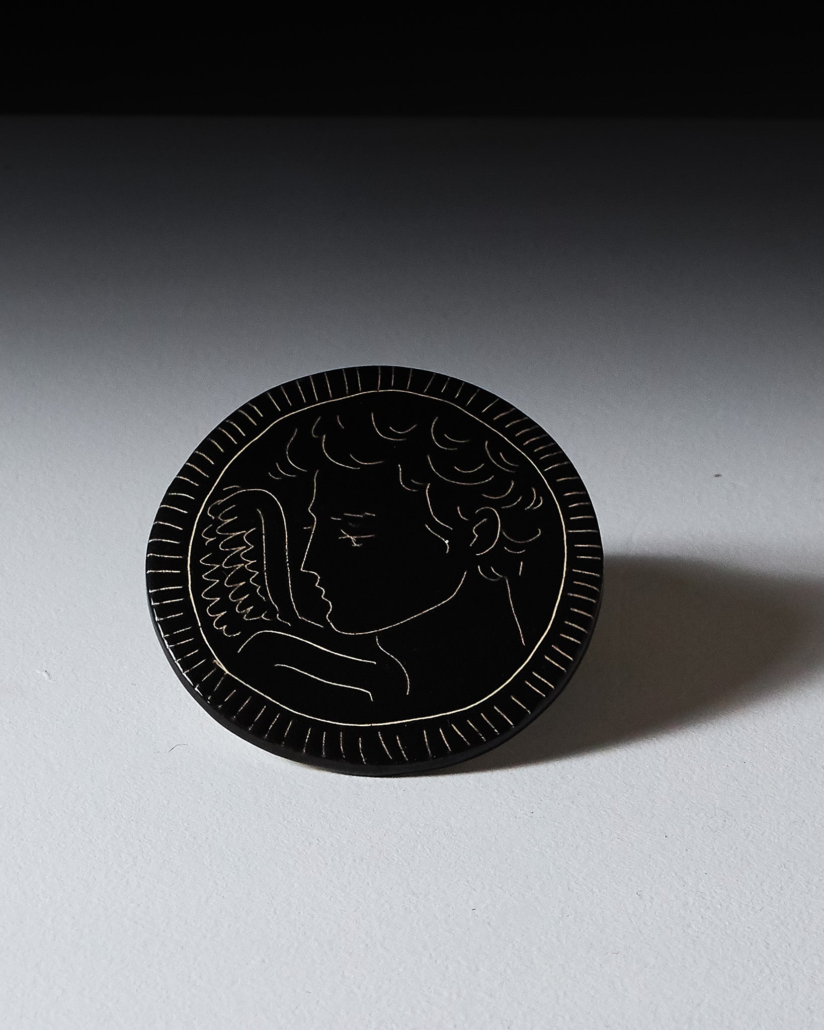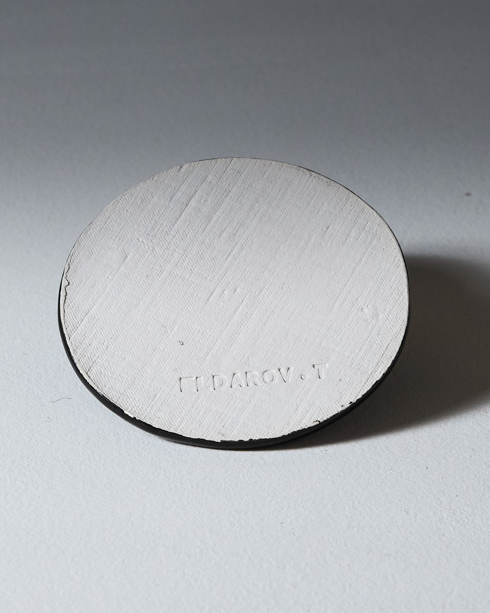 Black glazed ceramic coaster with an incised design depicting a male profile surrounded by stylized white floral motifs, with a striated border. Unique handcrafted piece, signed 'Eldarov. T' on the reverse.