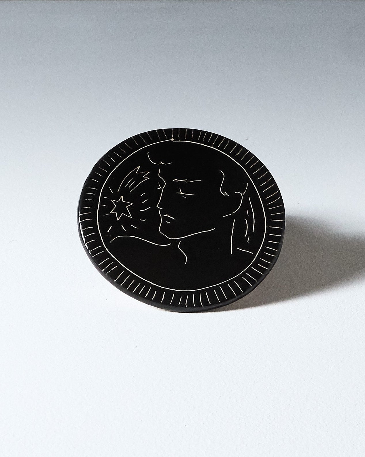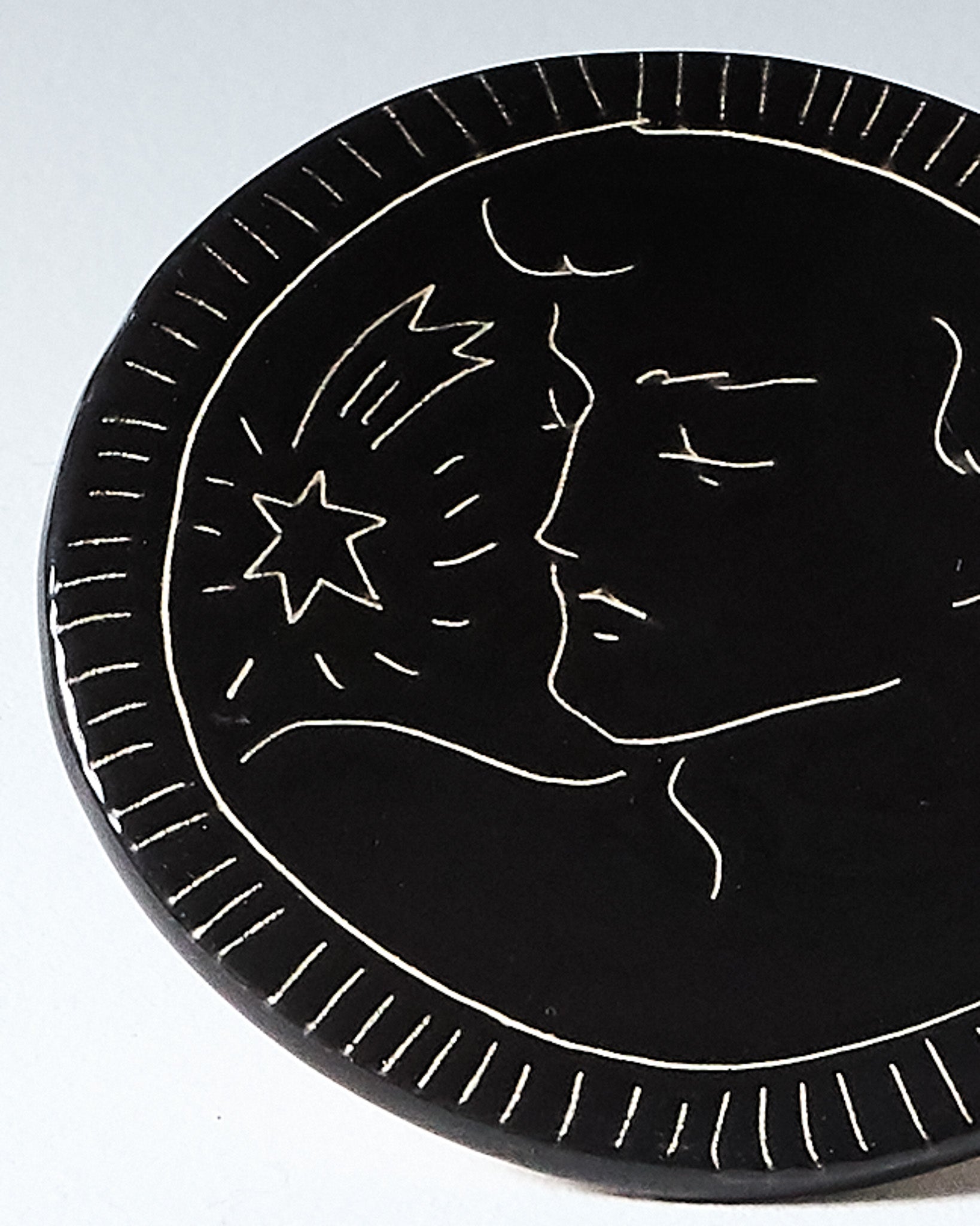 Black glazed ceramic coaster with an incised design depicting a male profile gazing at a shooting star, stylized white decoration, and a striated border. Unique handcrafted piece, signed 'Eldarov. T' on the reverse.