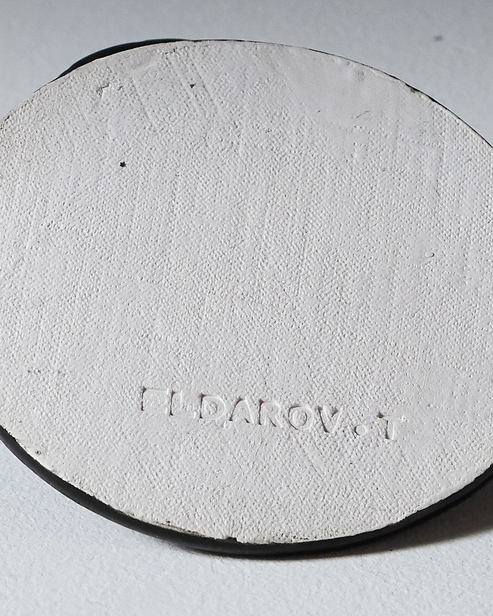 Black glazed ceramic coaster with an incised design depicting a male profile surrounded by stylized white star motifs, with a striated border. Unique handcrafted piece, signed 'Eldarov. T' on the reverse.