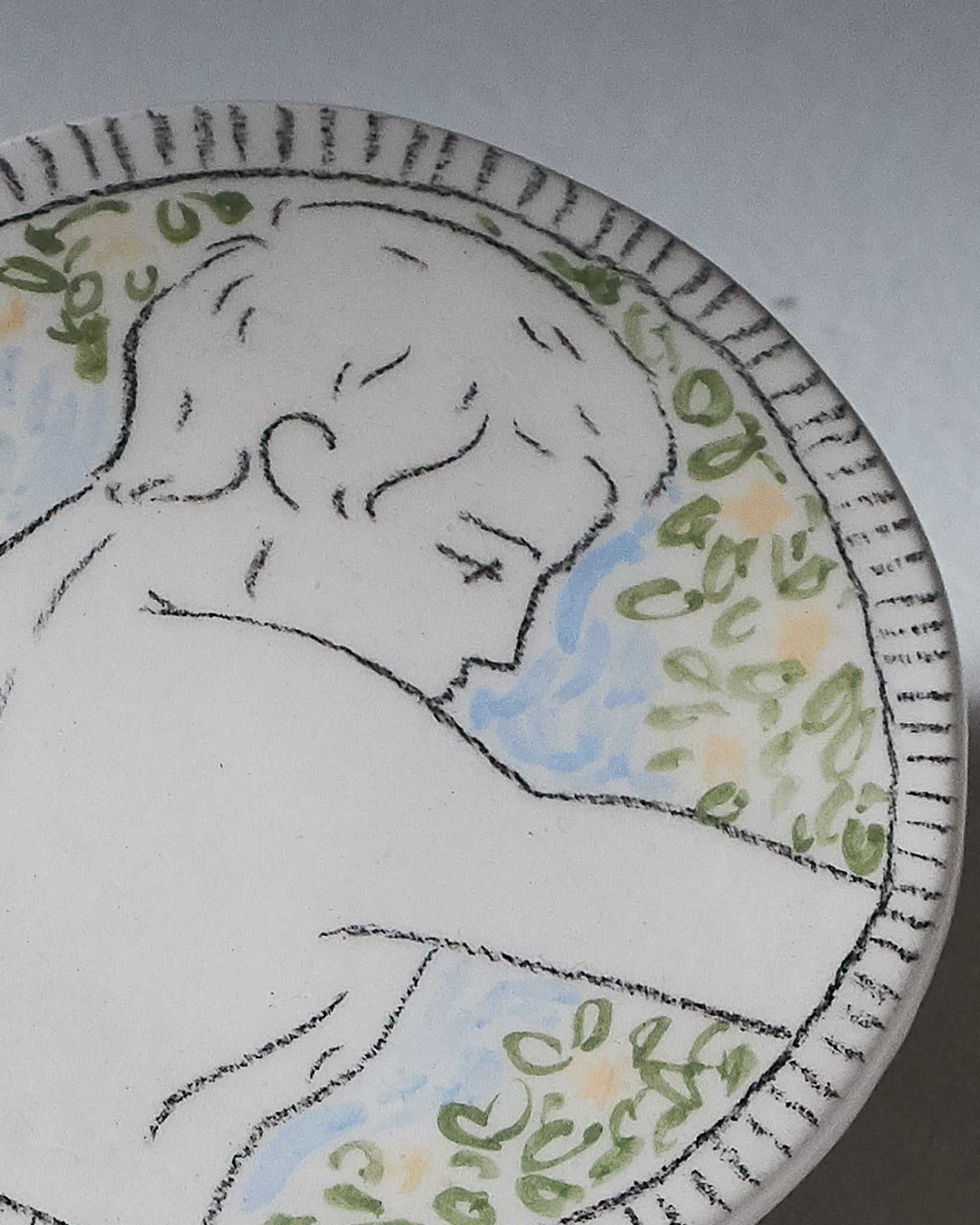 White glazed ceramic coaster with an incised design depicting a male profile from behind, surrounded by stylized foliage motifs in white, green, blue, and yellow, with a striated border. Unique handcrafted piece, signed 'Eldarov. T' on the reverse.