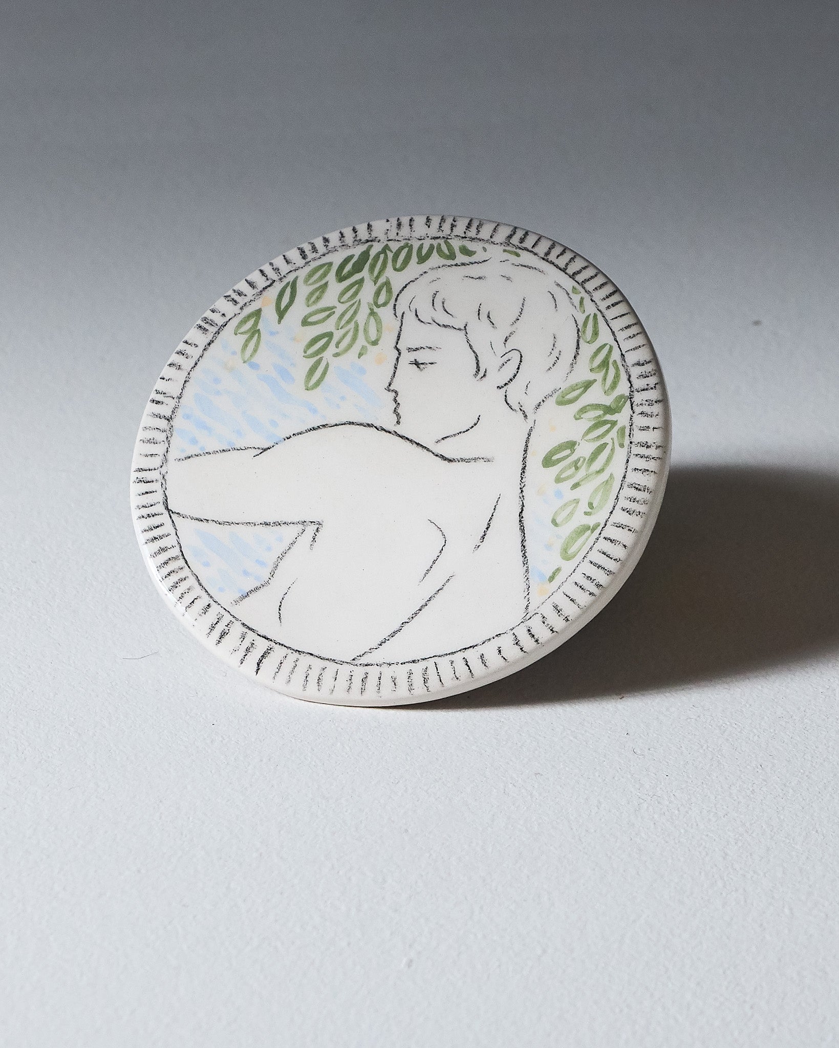 White glazed ceramic coaster with an incised design depicting a male profile from behind, surrounded by stylized white, blue, and yellow foliage motifs with a striated border. Unique handcrafted piece, signed 'Eldarov. T' on the reverse.