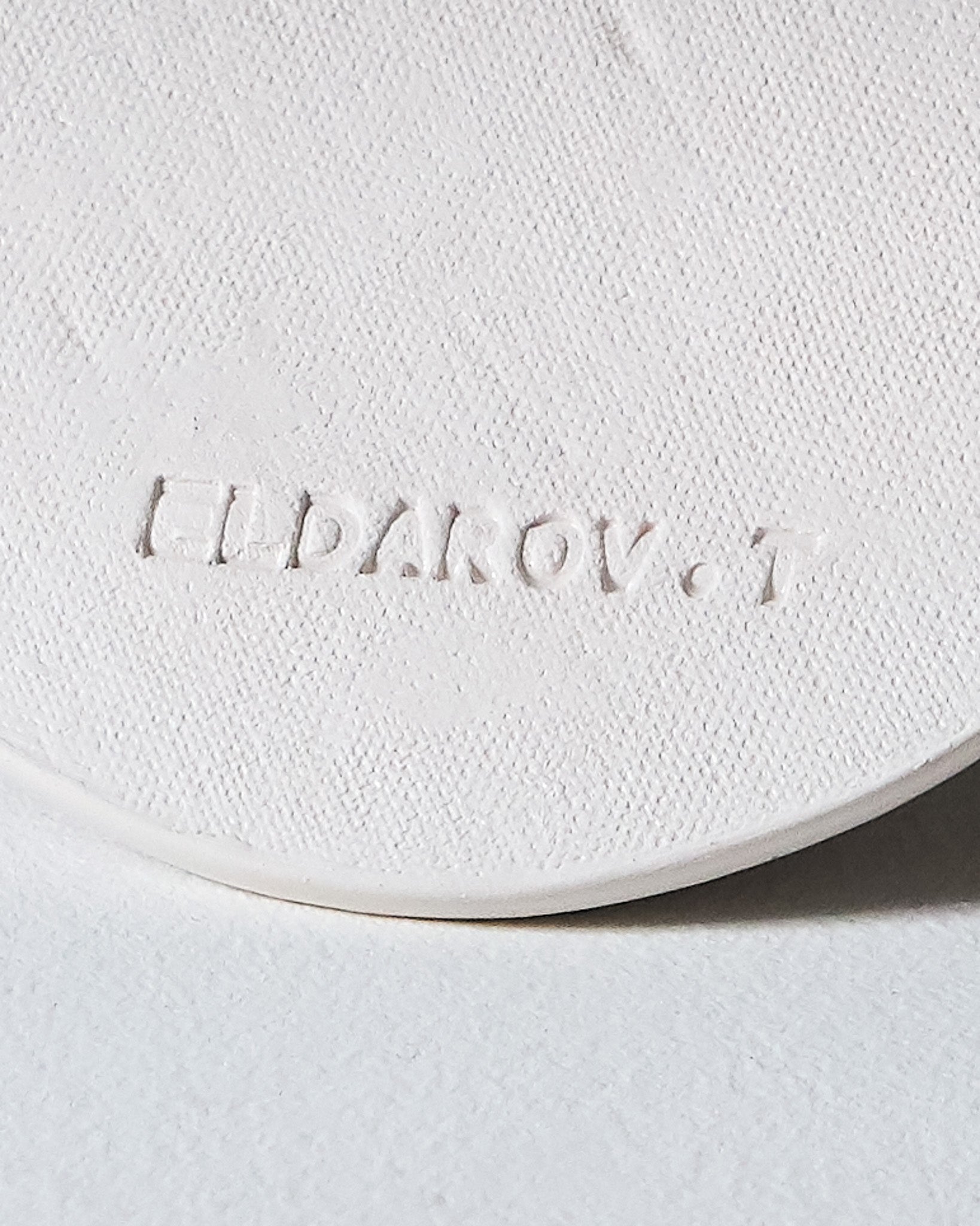 White glazed ceramic coaster with an incised design depicting a male profile surrounded by stylized white, blue, and yellow foliage motifs, with a striated border. Unique handcrafted piece, signed 'Eldarov. T' on the reverse.