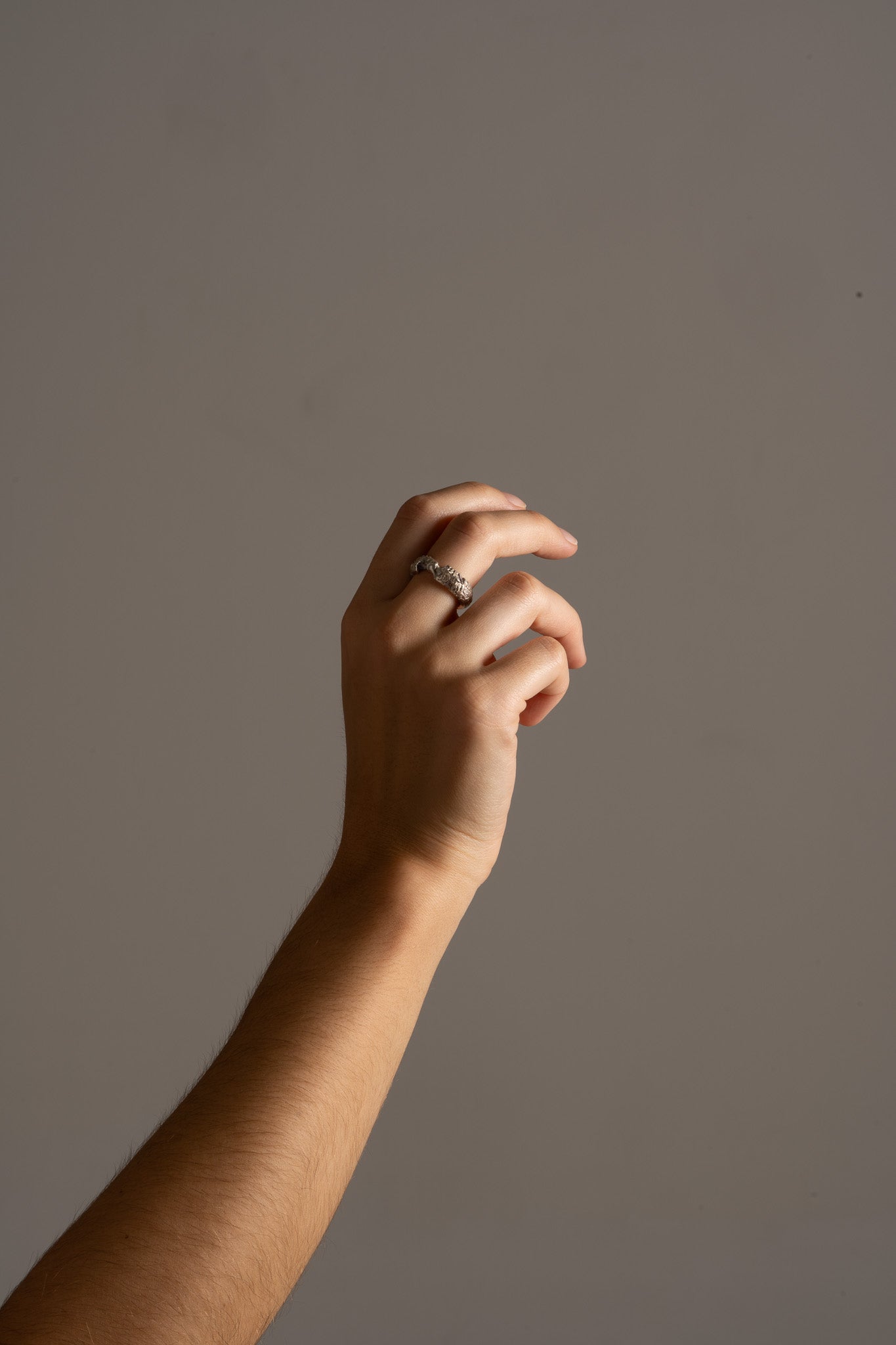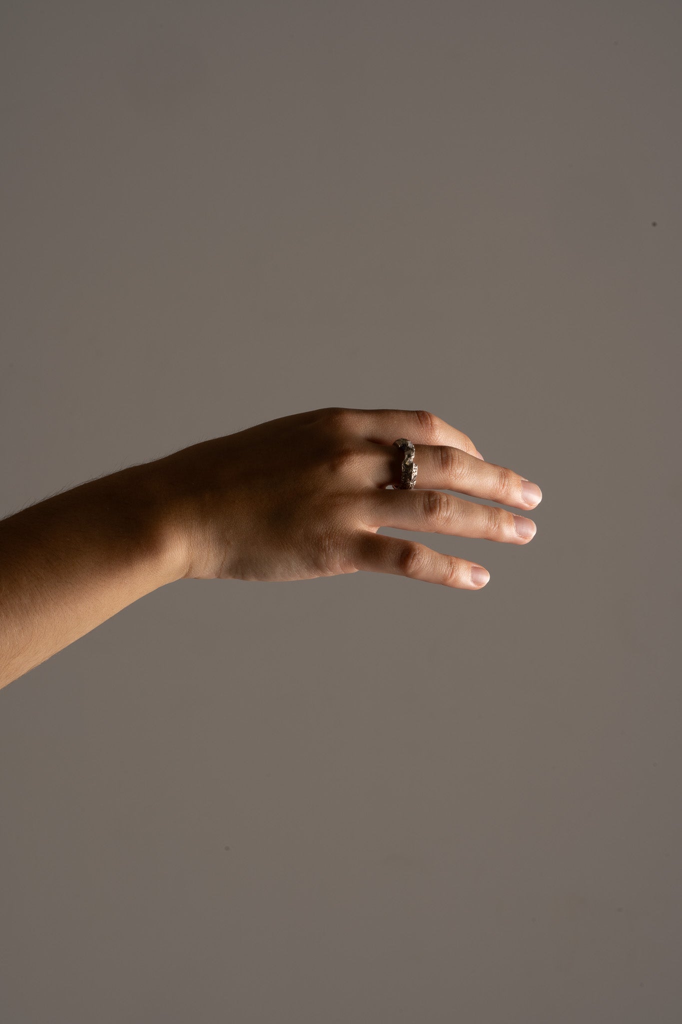Each ring is hand-sculpted in wax and then sand-cast in the designer's Glasgow-based studio. The synthetic opal stones are directly integrated during the casting process, creating a unique composition with shimmering reflections for each piece.