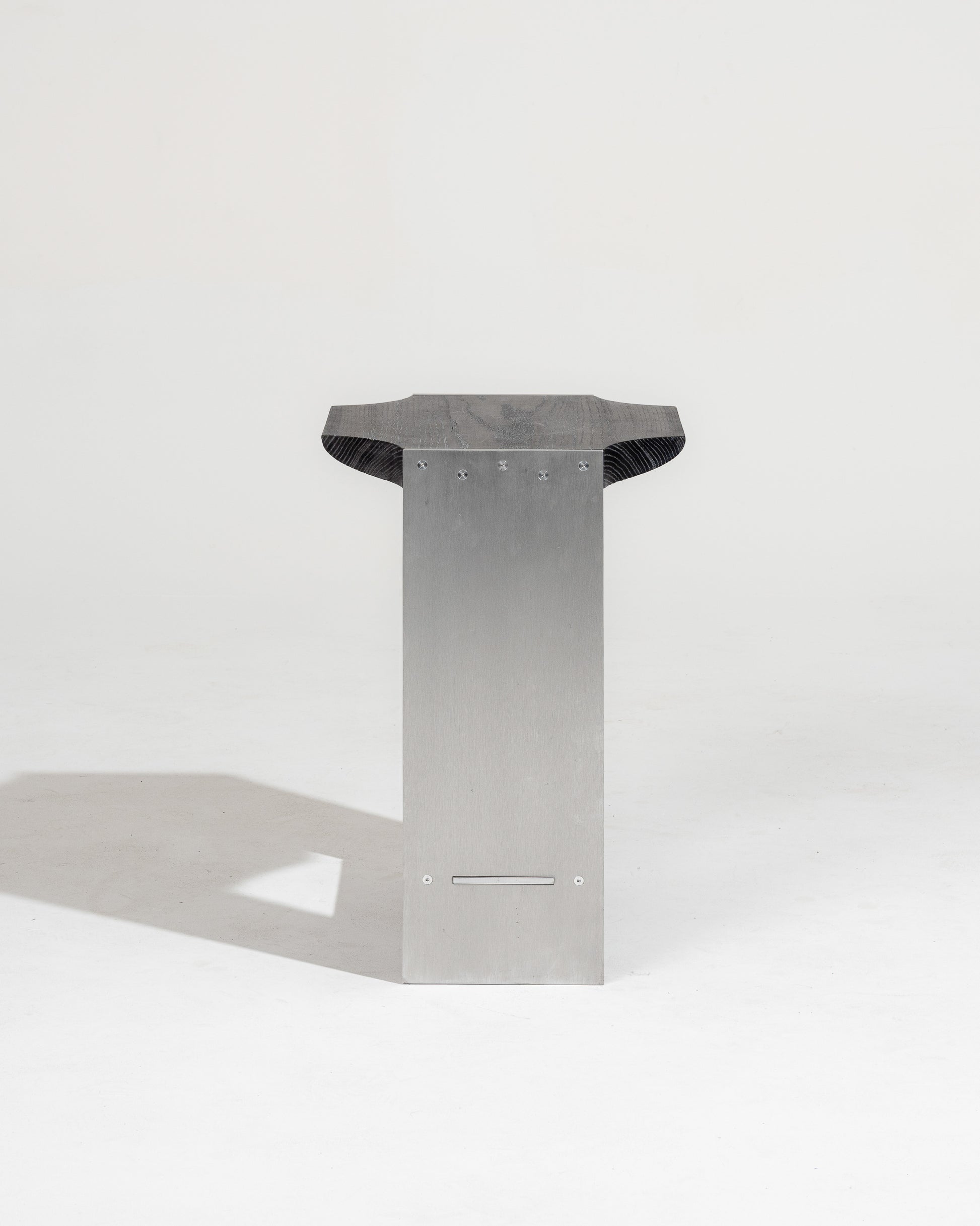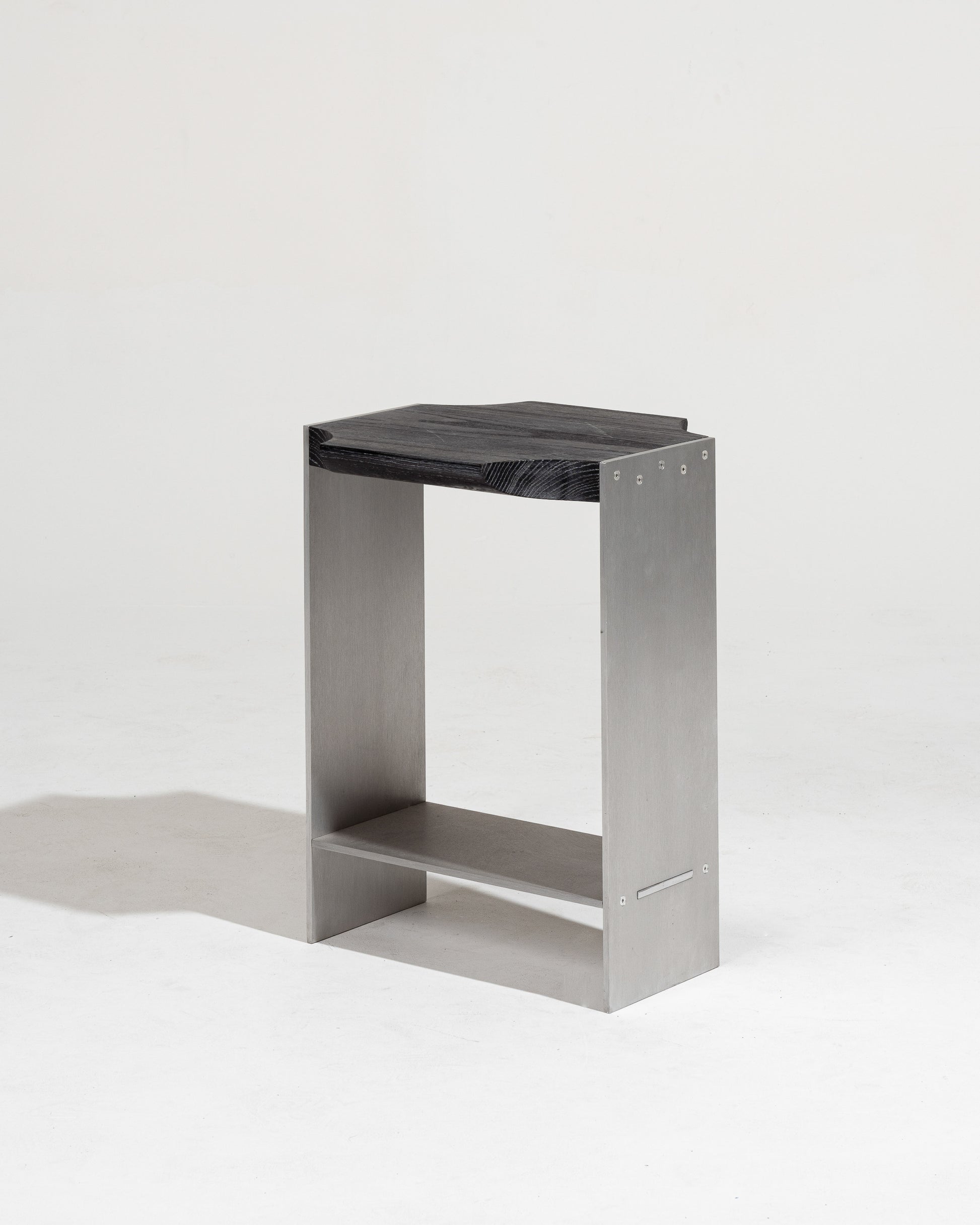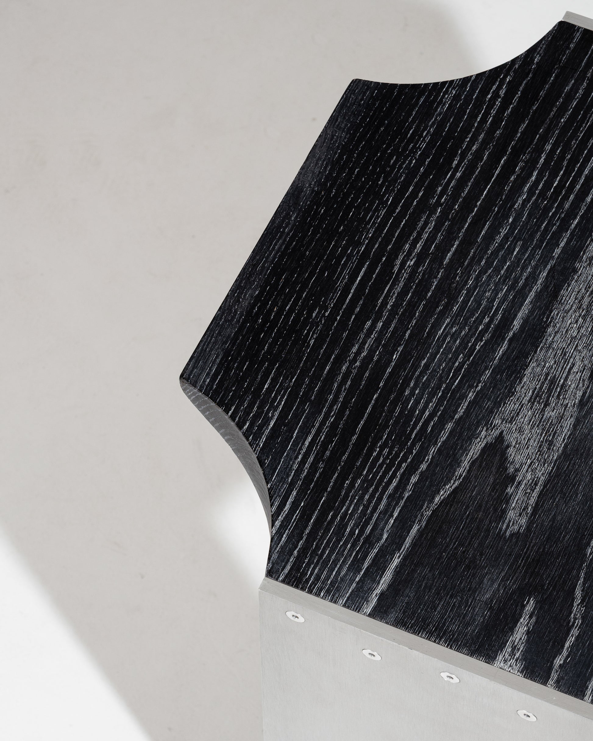 Crafted with a brushed aluminum frame and a top made of blackened and lime-washed oak, the "F15 E" side table stands out for its refined design and use of high-quality materials. Its minimalist lines and elegant contrasts make it a versatile piece — perfect as an end table, a bedside table, or a compact shelf for books and essentials.