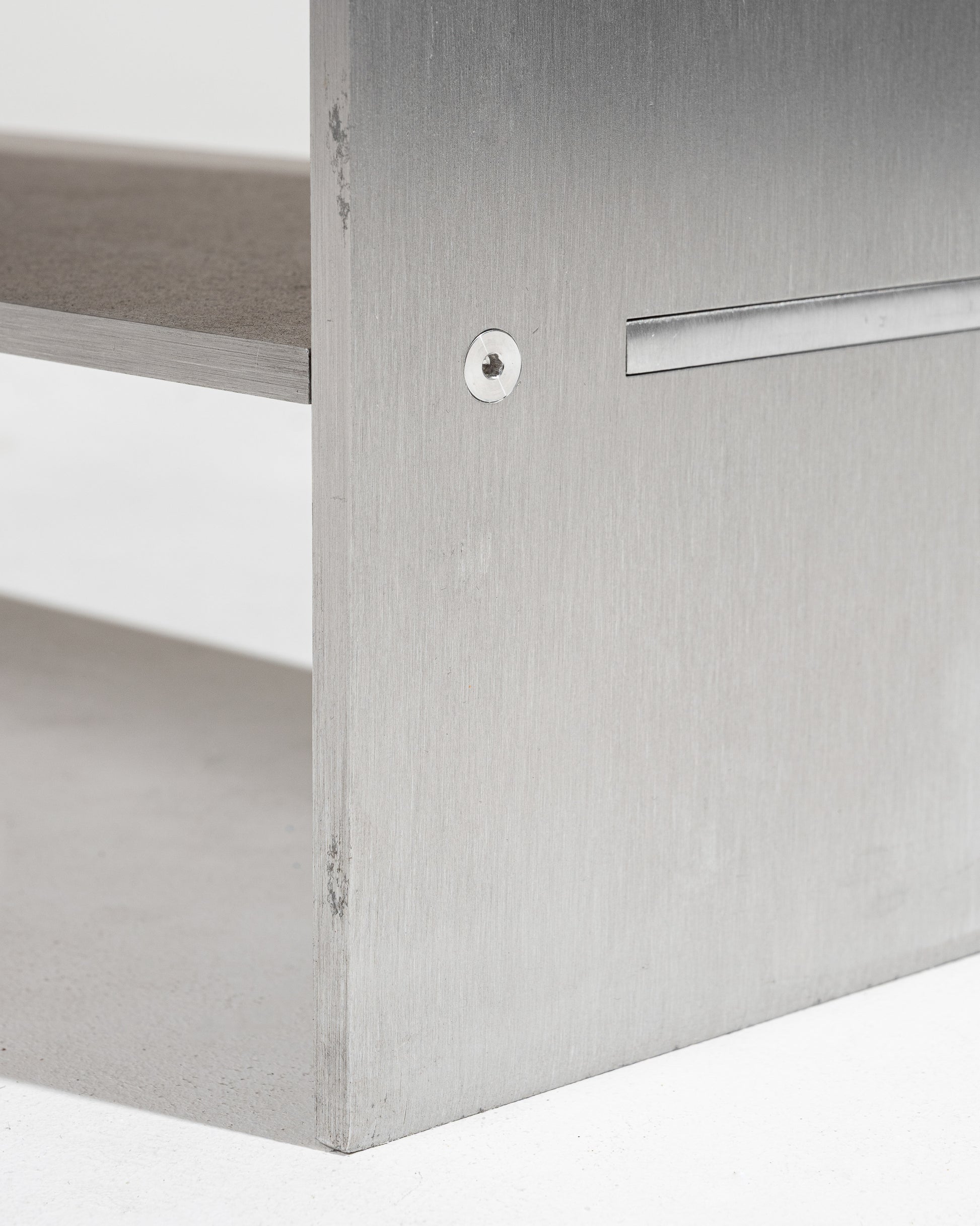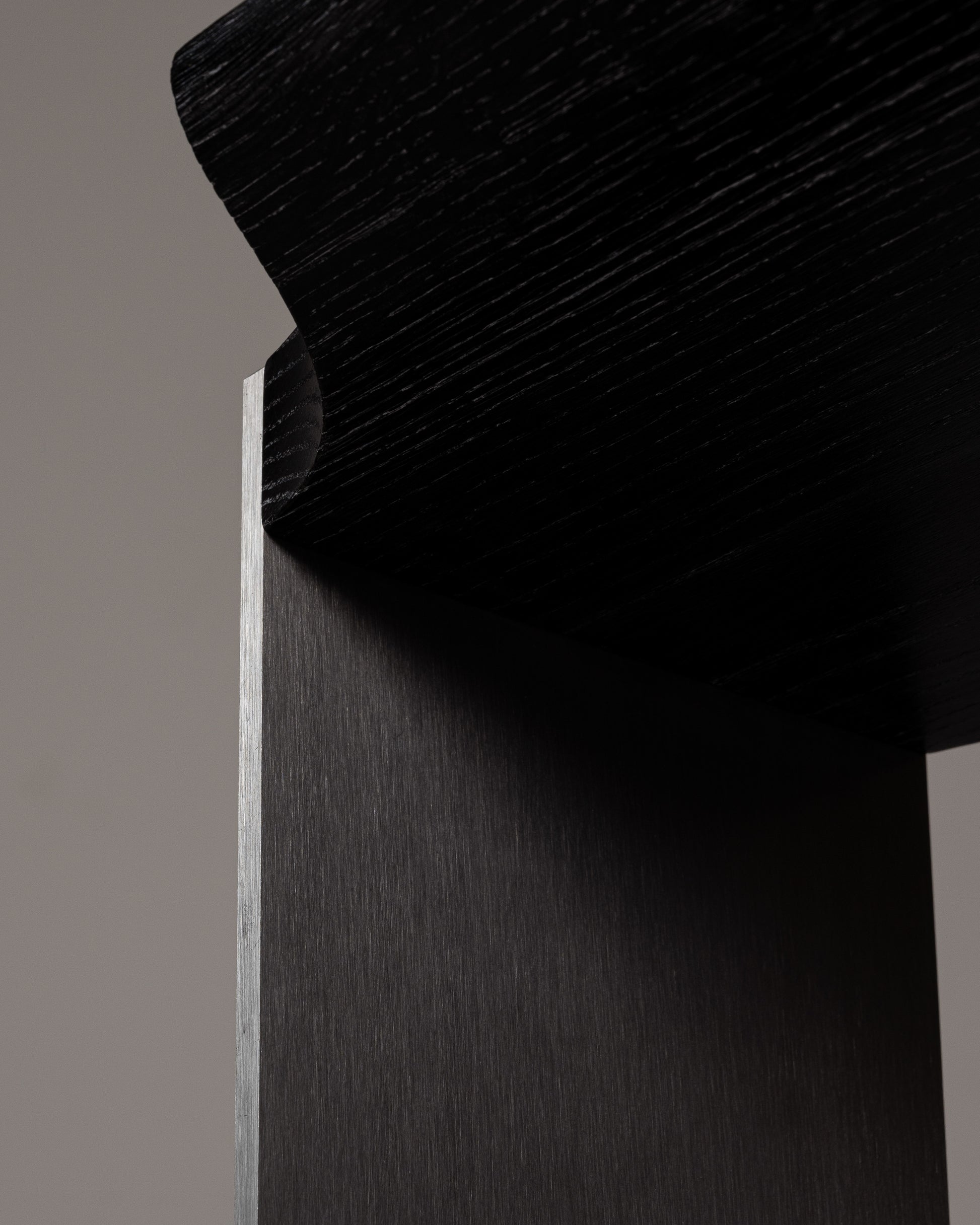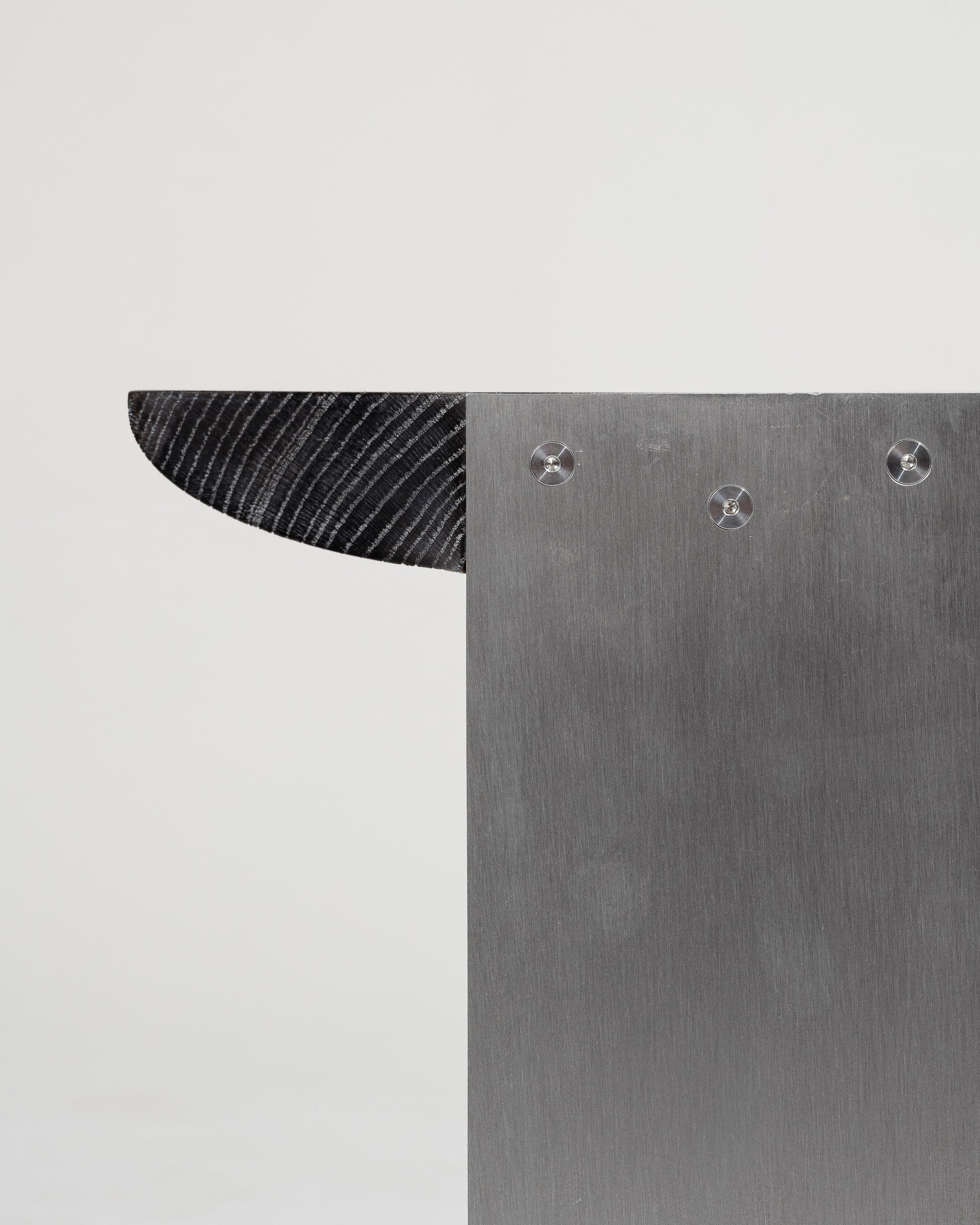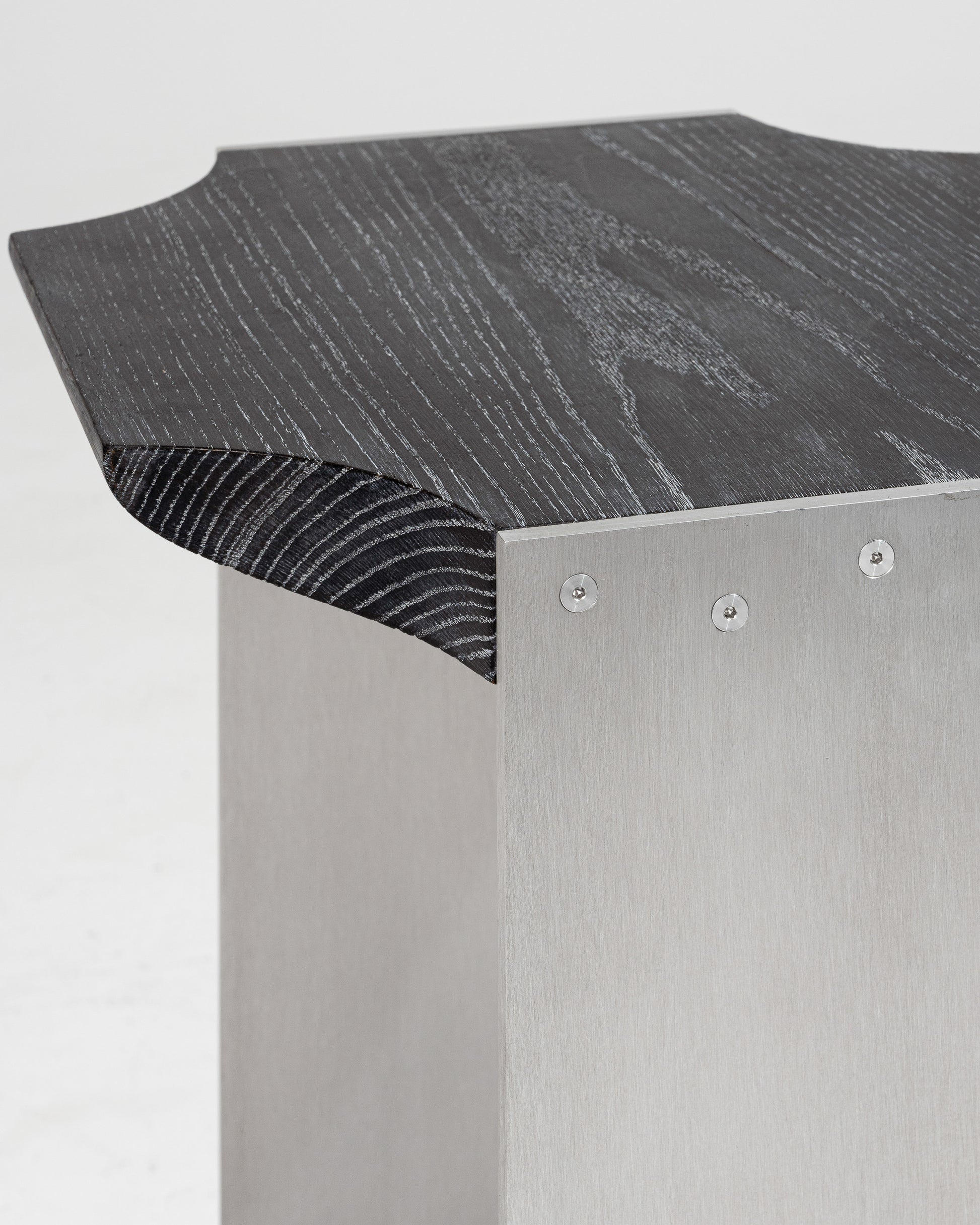 Crafted with a brushed aluminum frame and a top made of blackened and lime-washed oak, the "F15 E" side table stands out for its refined design and use of high-quality materials. Its minimalist lines and elegant contrasts make it a versatile piece — perfect as an end table, a bedside table, or a compact shelf for books and essentials.