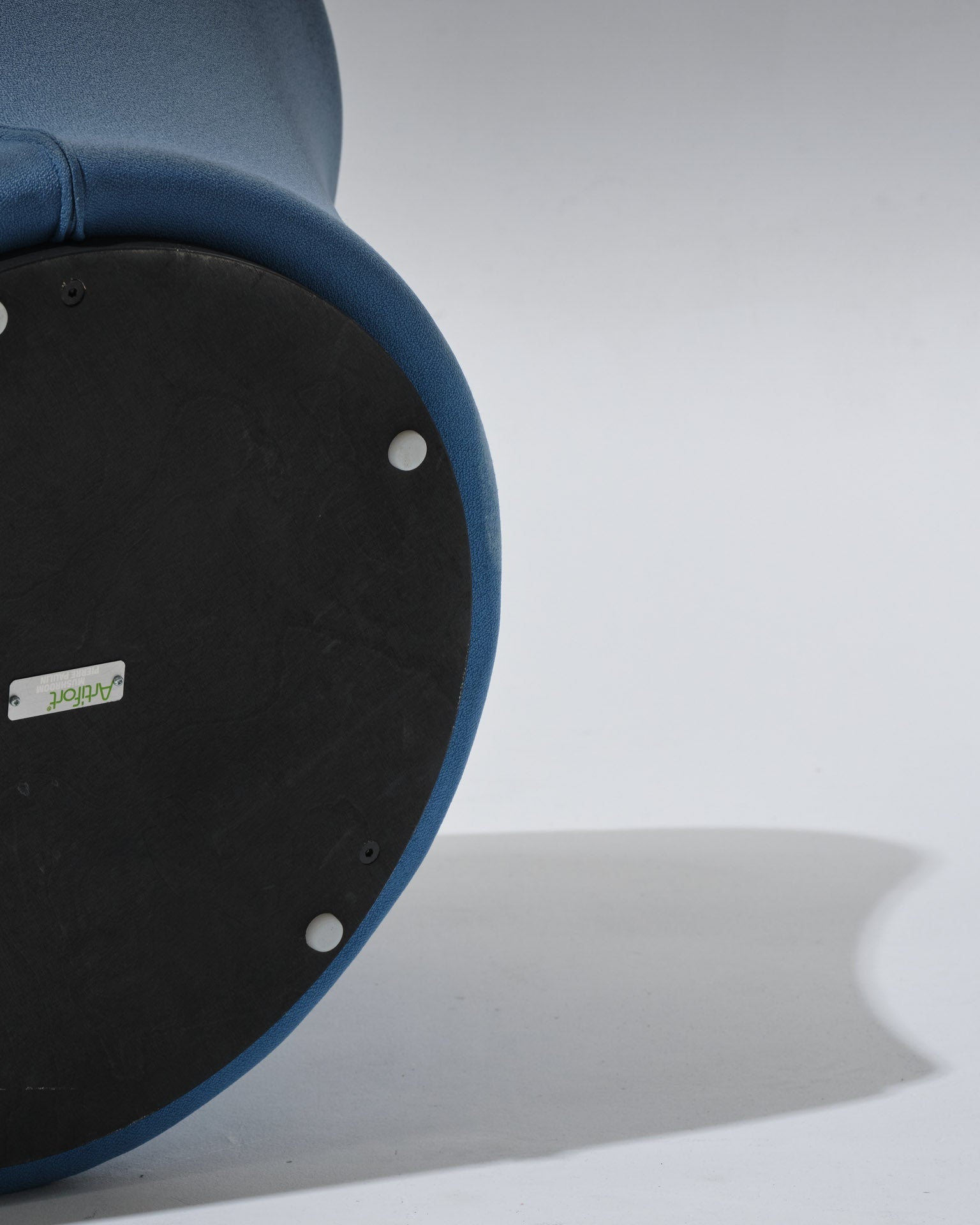 Mushroom armchair by Pierre Paulin, 1970s. In a style typical of the Space Age, it consists of a fiberglass shell upholstered in its original blue fabric. The flared circular base forms a single piece for the seat and backrest, which are also circular. In good condition.