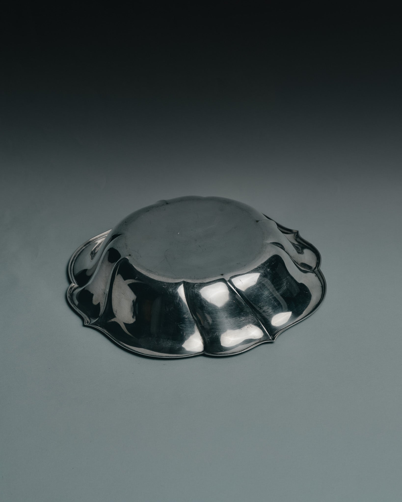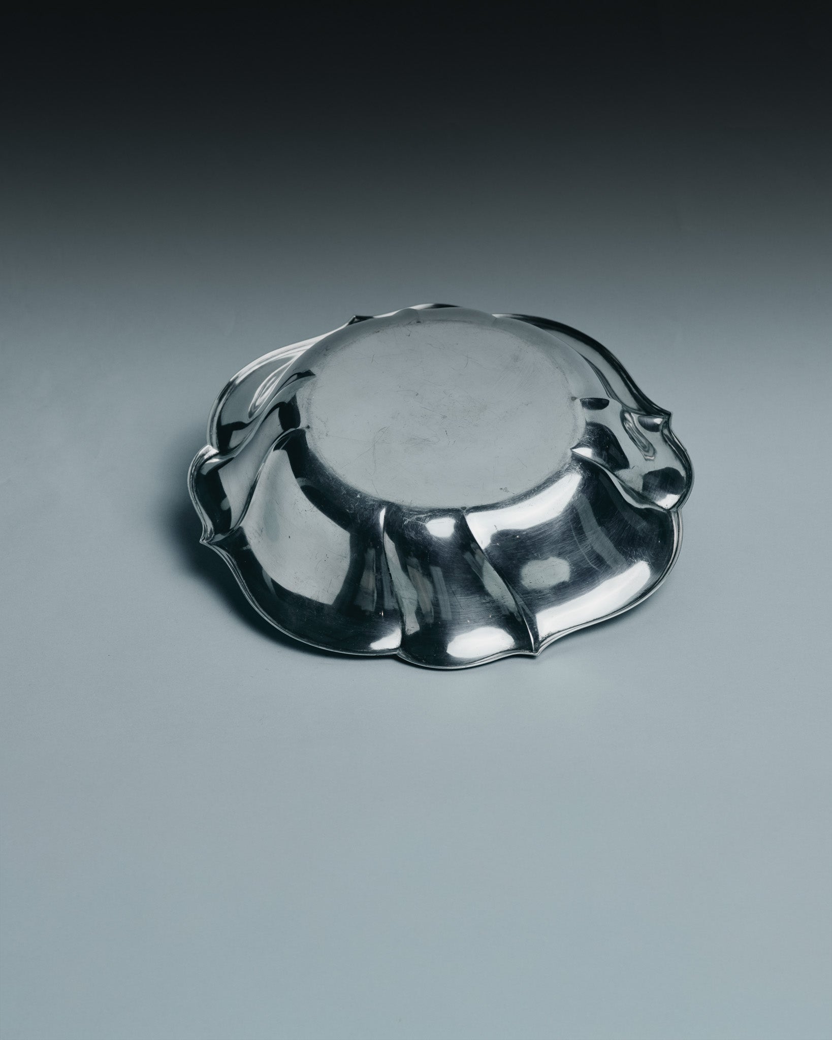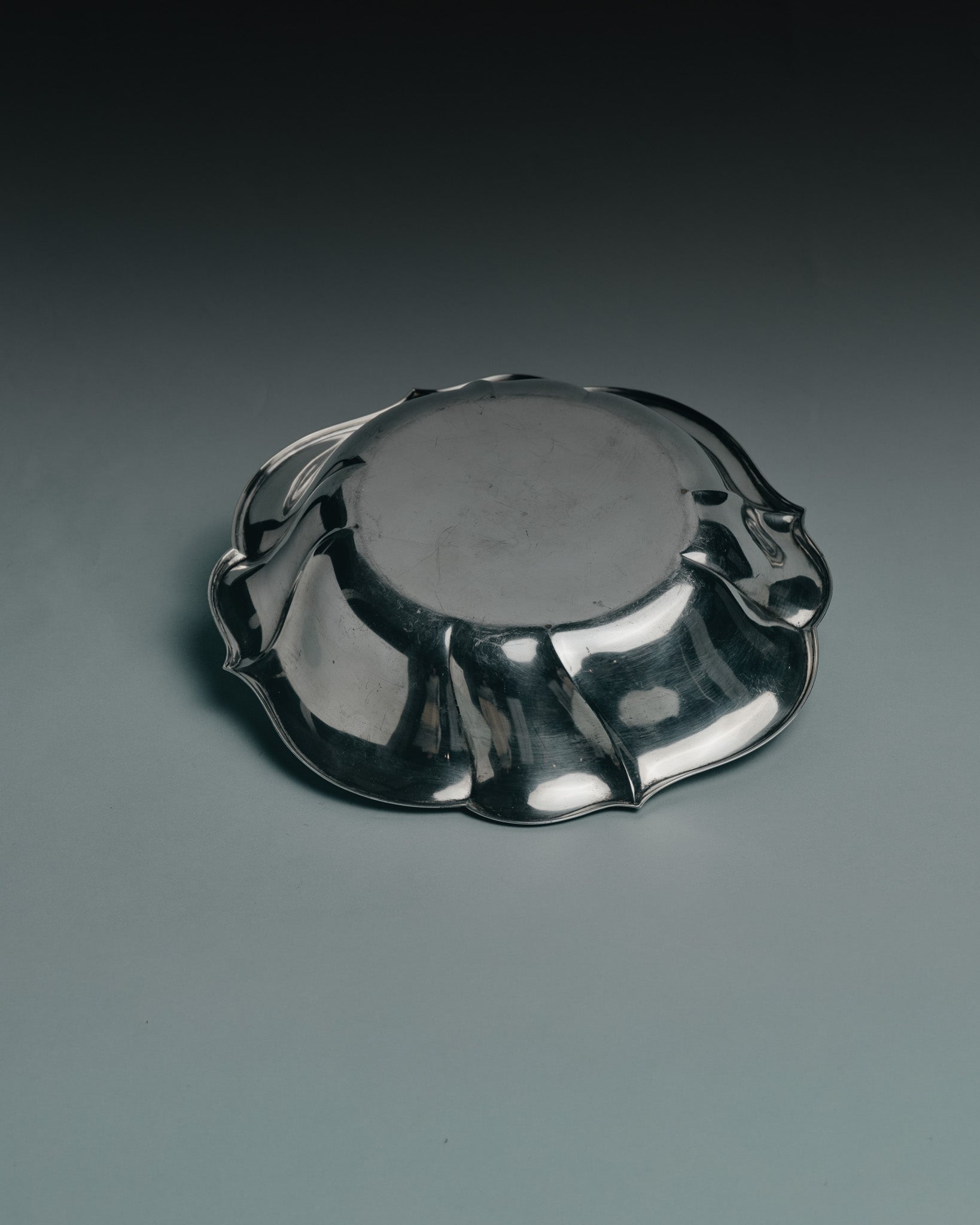 Silver-plated metal bowl with a wavy rim typical of 1960s silversmith work. Its wide, deep shape provides an ideal capacity for water or food for a large dog. In good overall condition, with signs of wear consistent with its age.