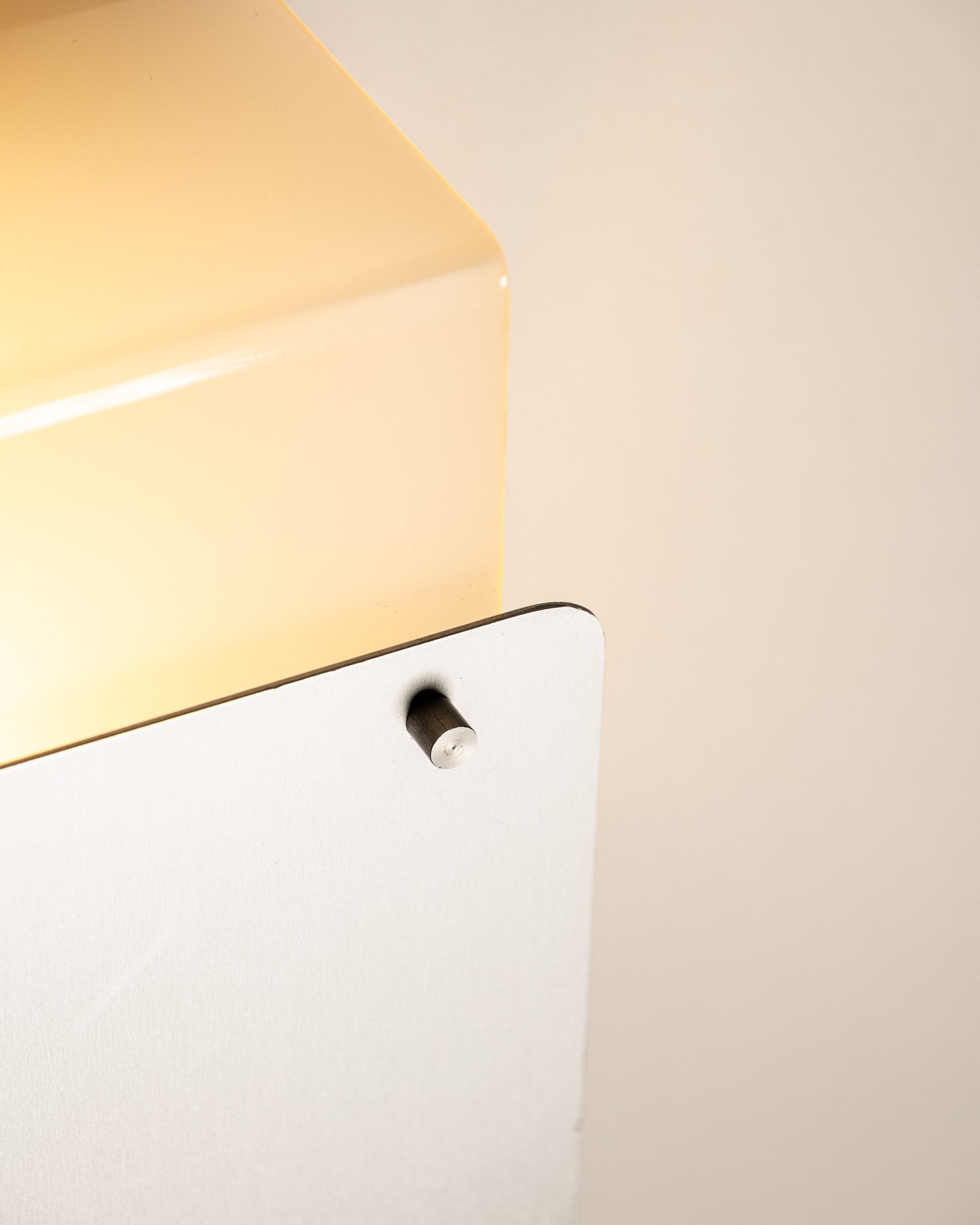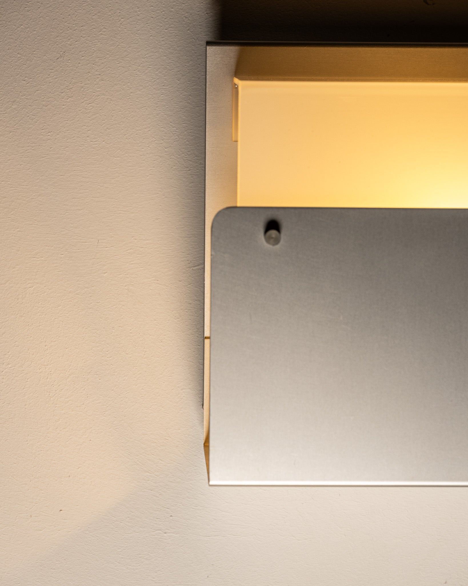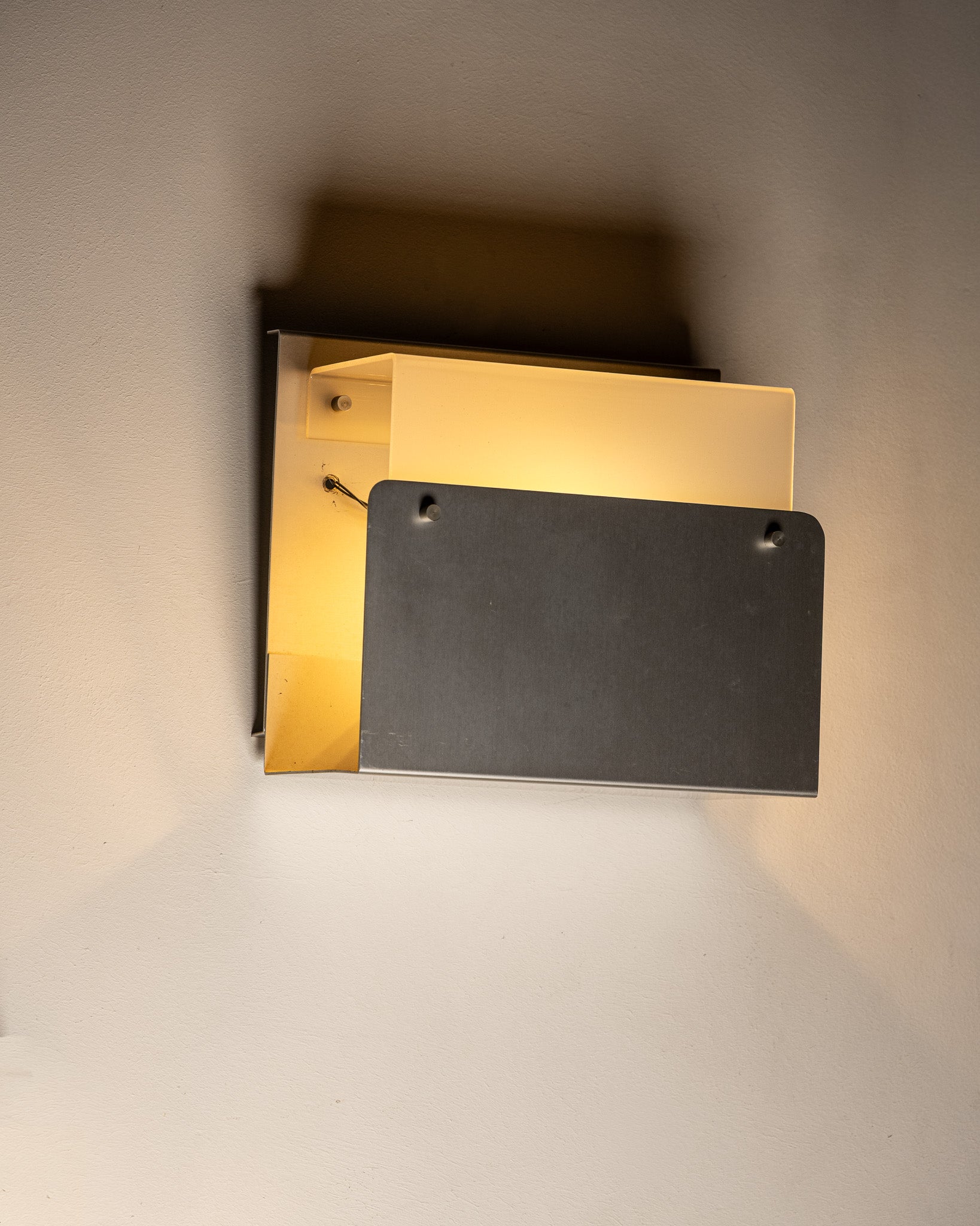 Wall sconce composed of a glass plate to which a brushed metal plate is attached, partially enclosing the light source. The assembly is held together by visible screws. A design in the style of the 1980s.