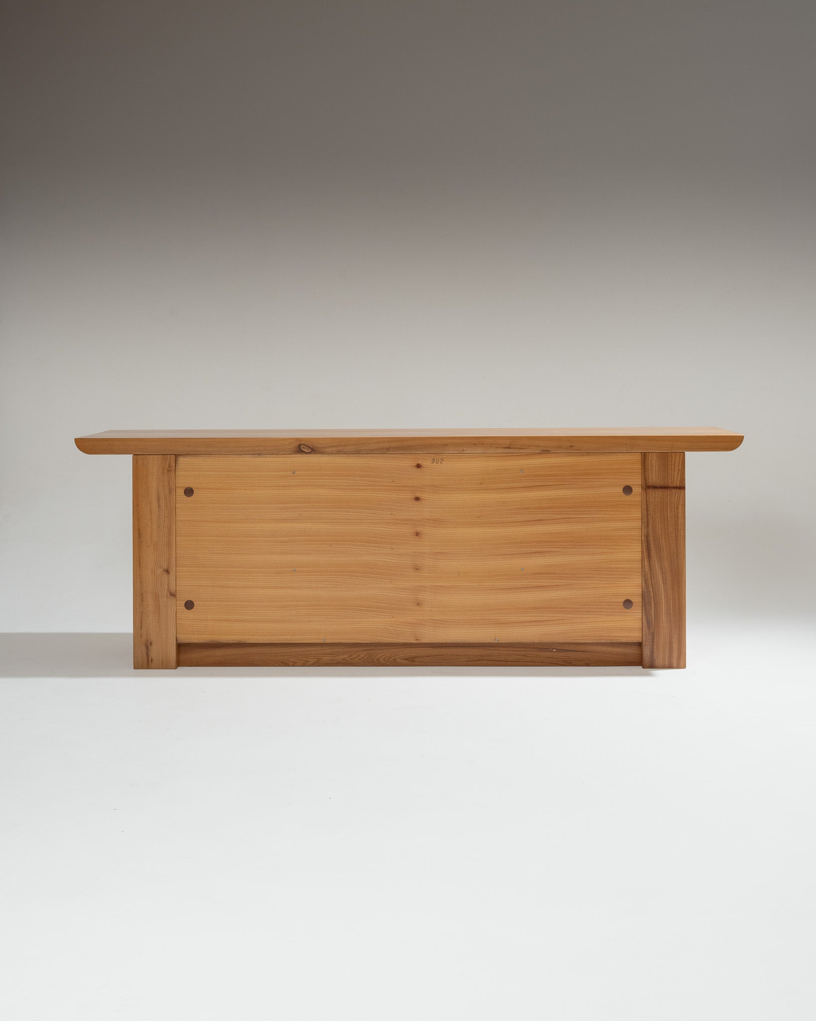 Solid elm sideboard designed by Luigi Gorgoni for Roche Bobois in the 1980s. Thick top carved in the shape of an airplane wing, four doors opening onto shelves and a concealed central drawer. Solid wood hinges and details illustrate the designer's brutalist and architectural work. In superb vintage condition, the base of the legs does however show signs of use.