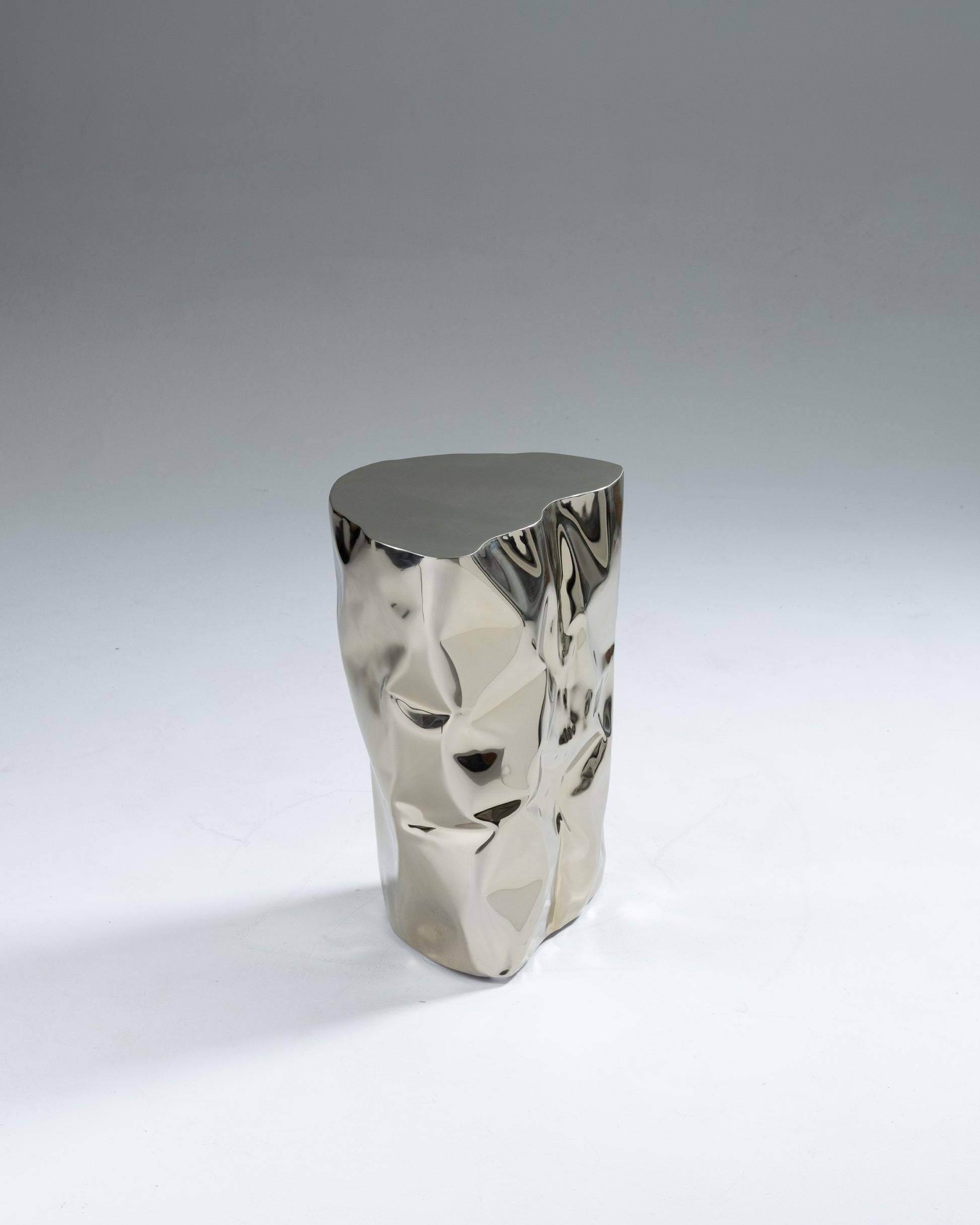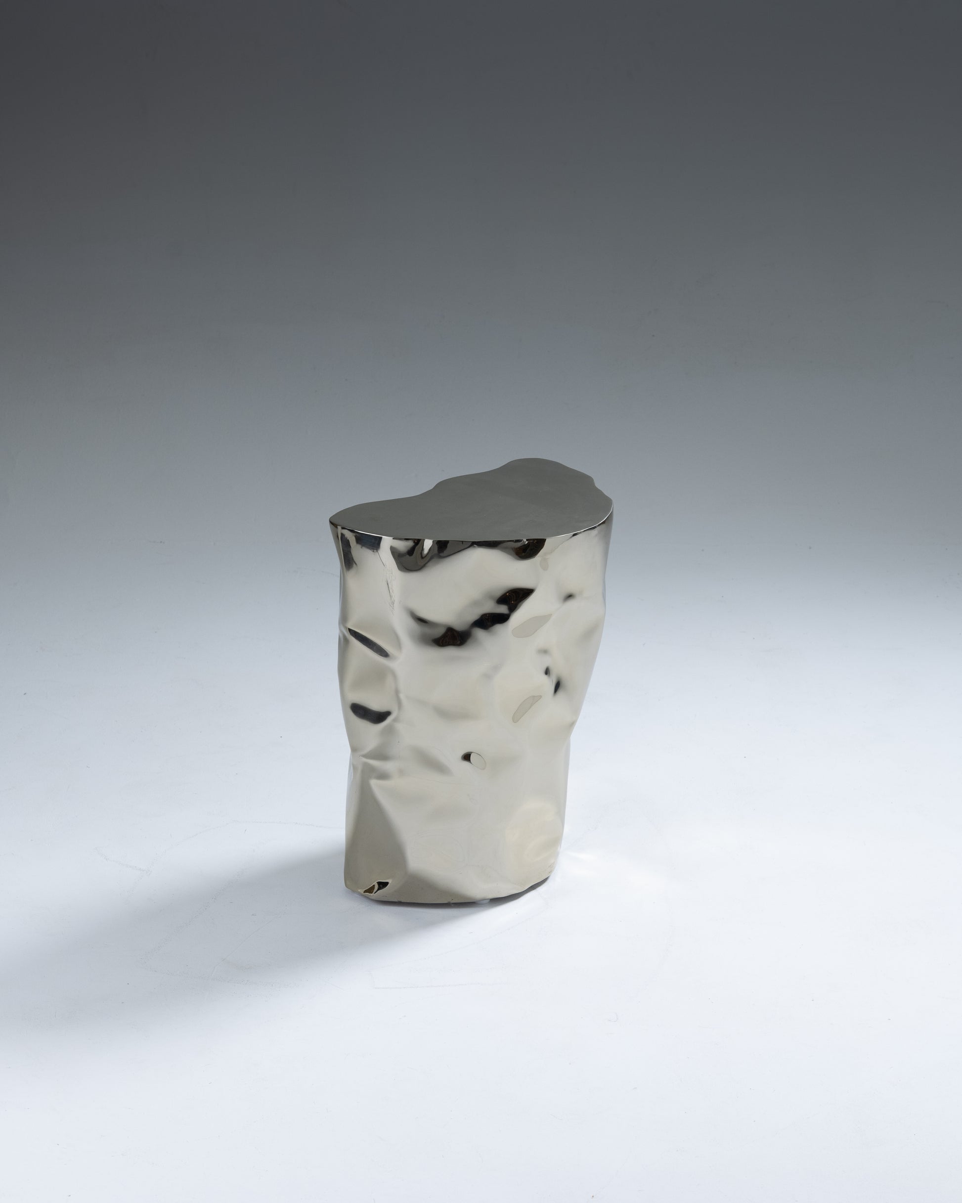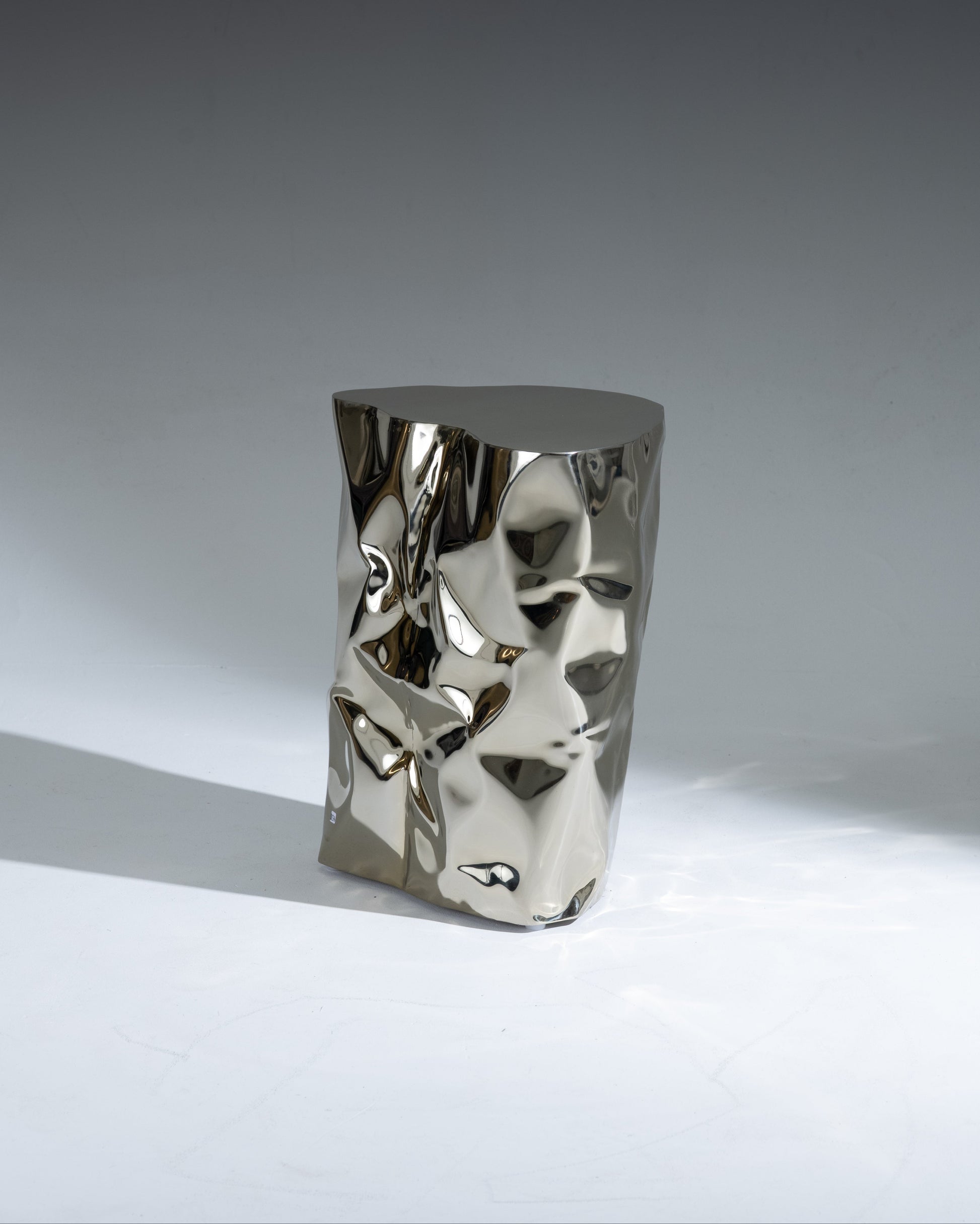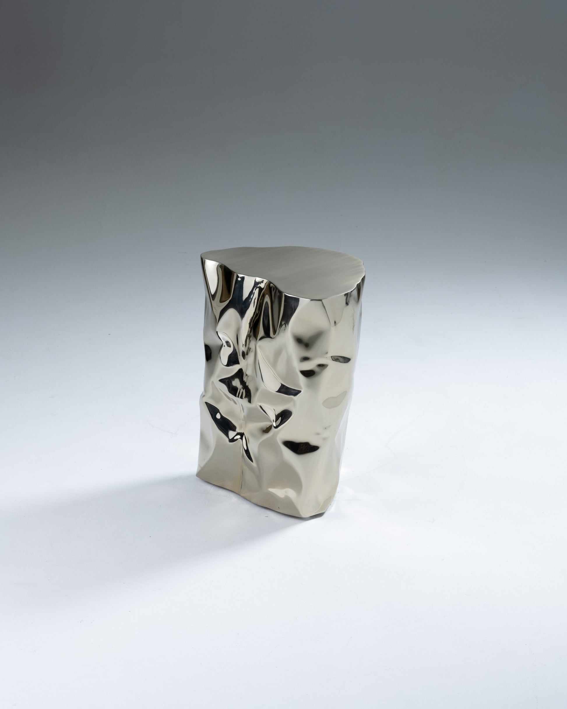 "Grand Canyon" side table by Nitush-Aroosh. Composed of two polished metal blocks with a champagne-colored mirror finish.